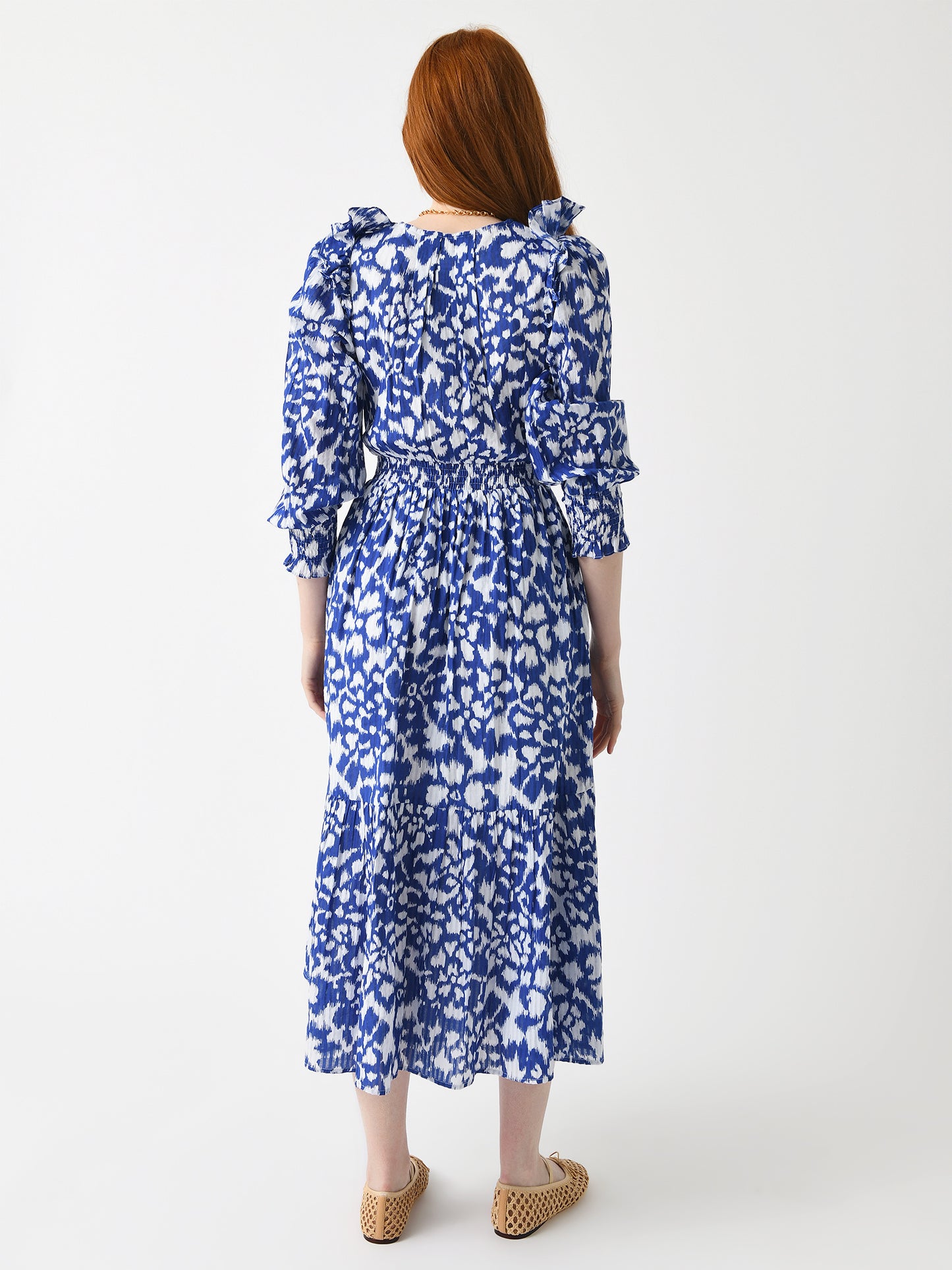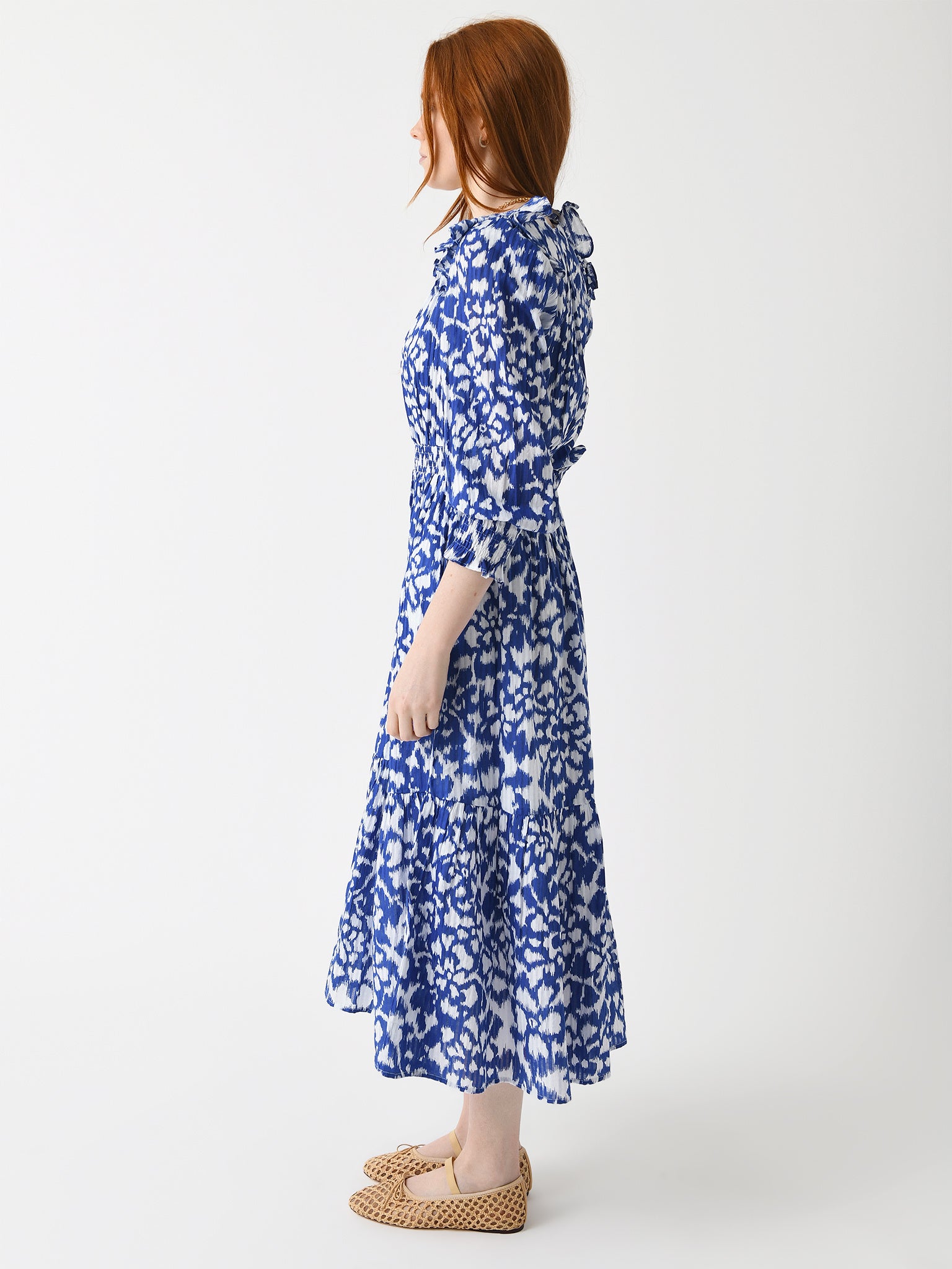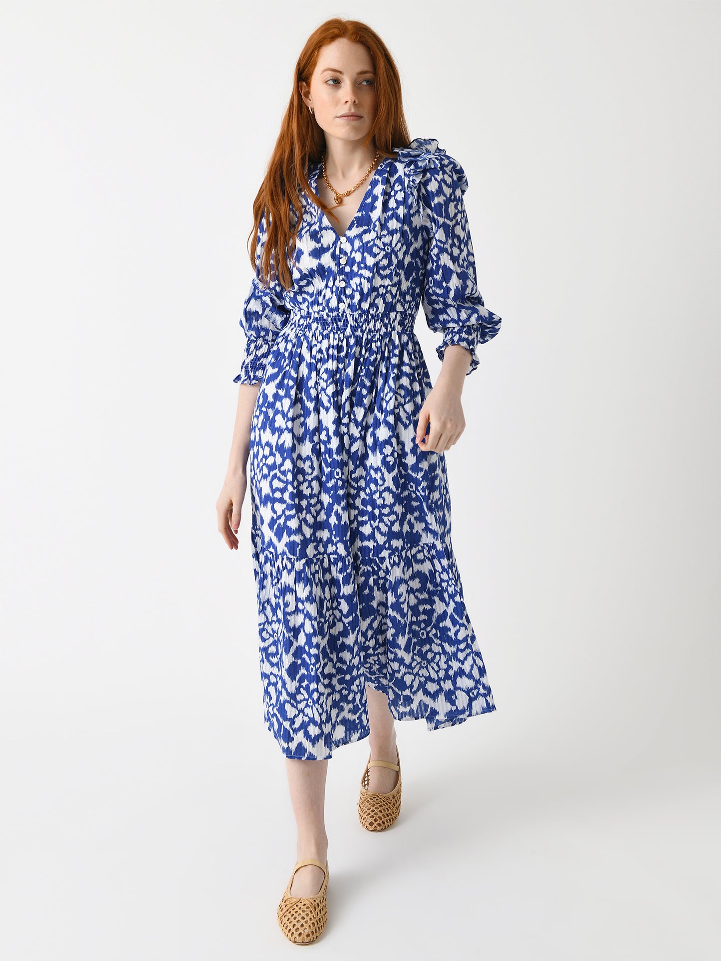 A timeless dress made from lightweight cotton voile with smocked details and a custom Ikat floral print.