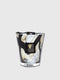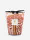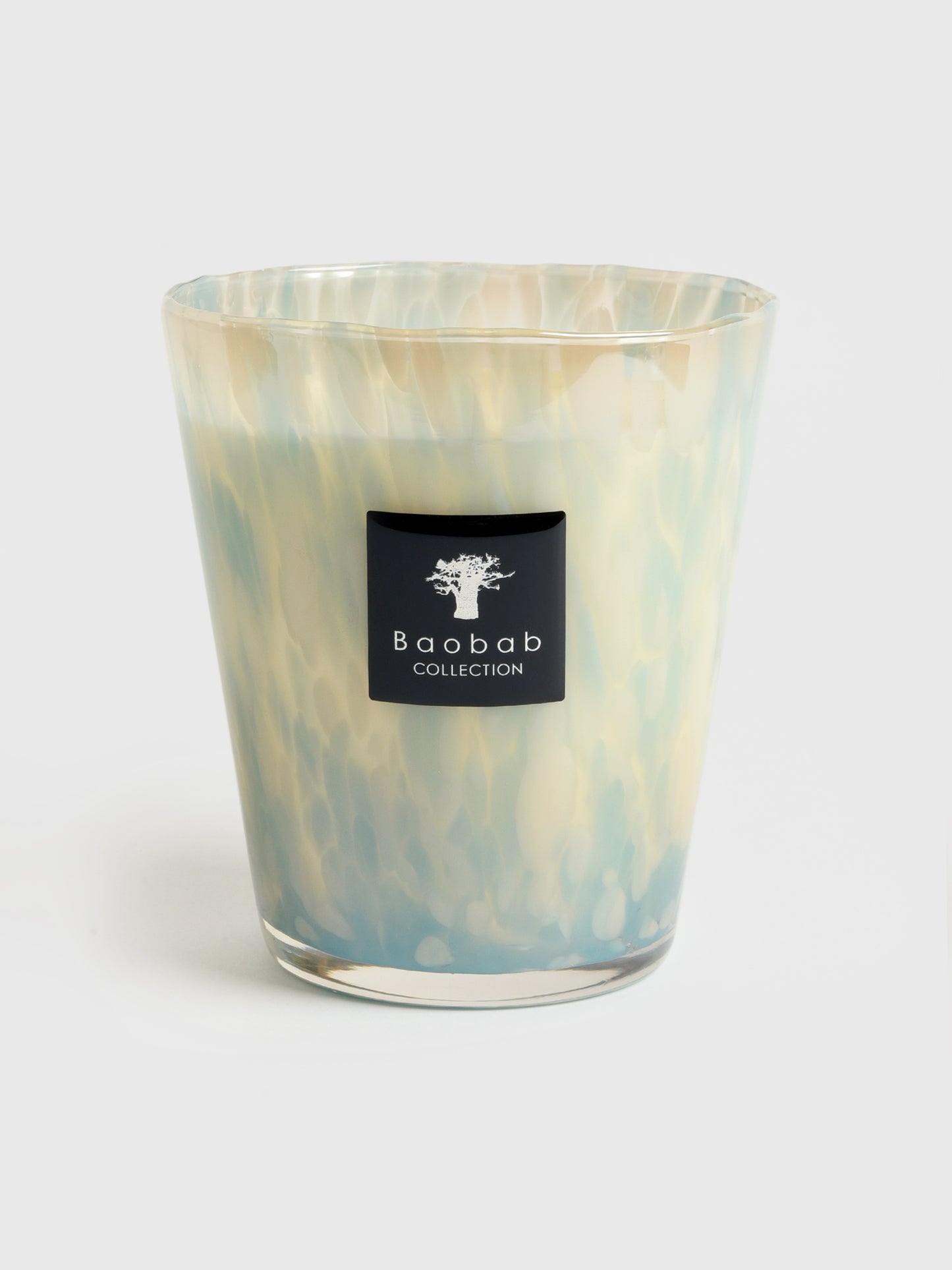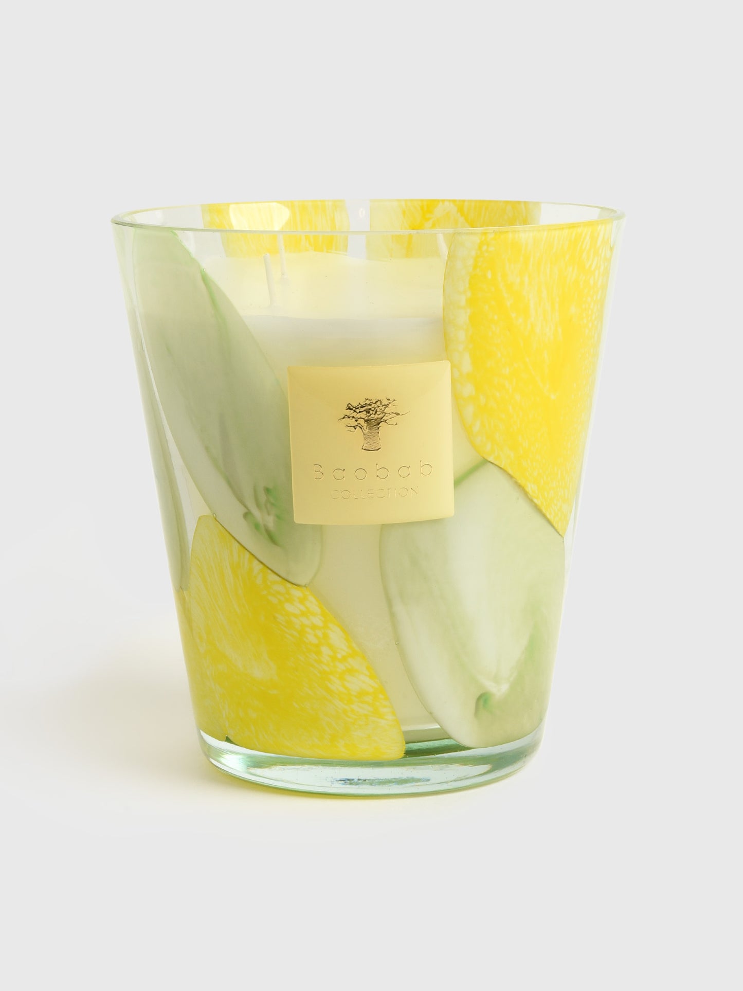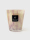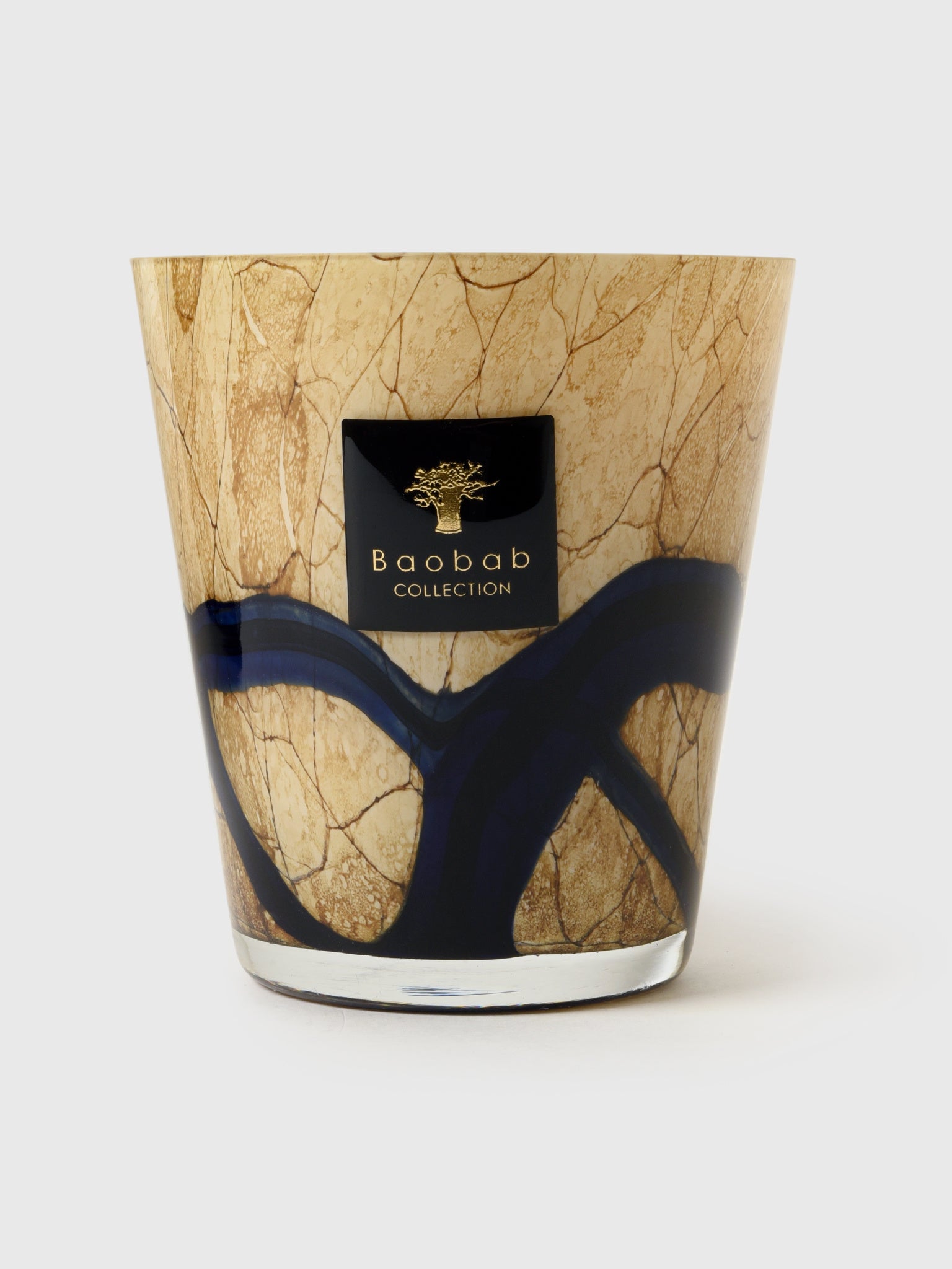 A large candle hand-poured into a luxurious hand-blown glass vessel.