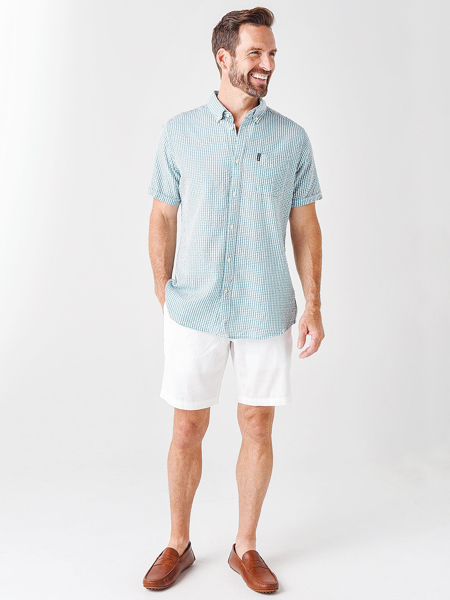 Get into sunny outings with the vacation-worthy Barbour Men's Seersucker 8 Short-Sleeve Tailored Shirt.