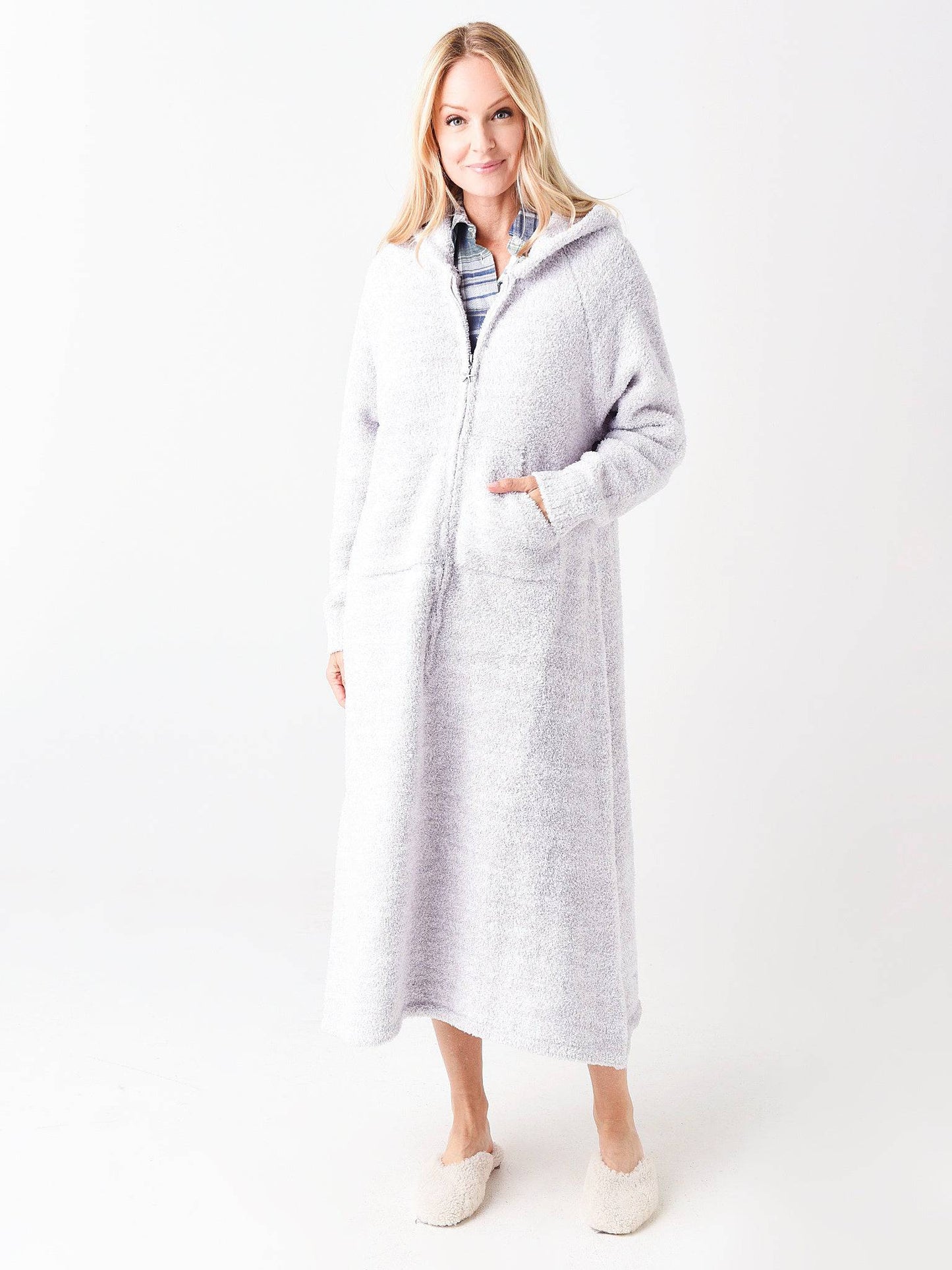 Ultra-soft plush robe with an attached hood and half-zip closure.