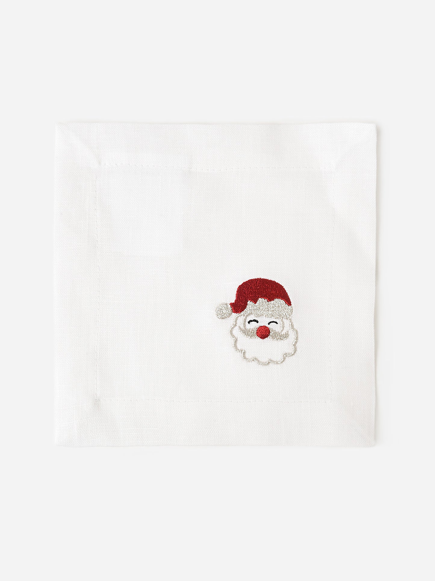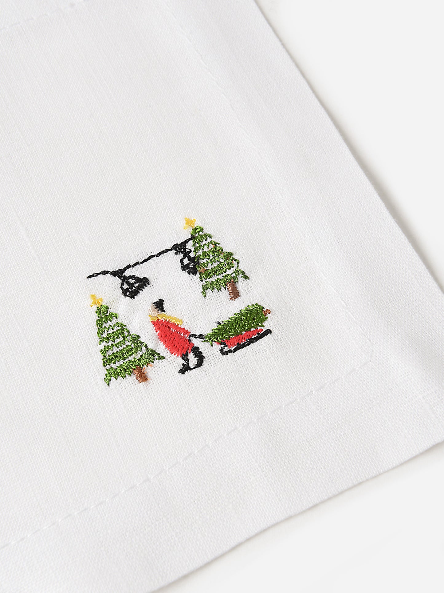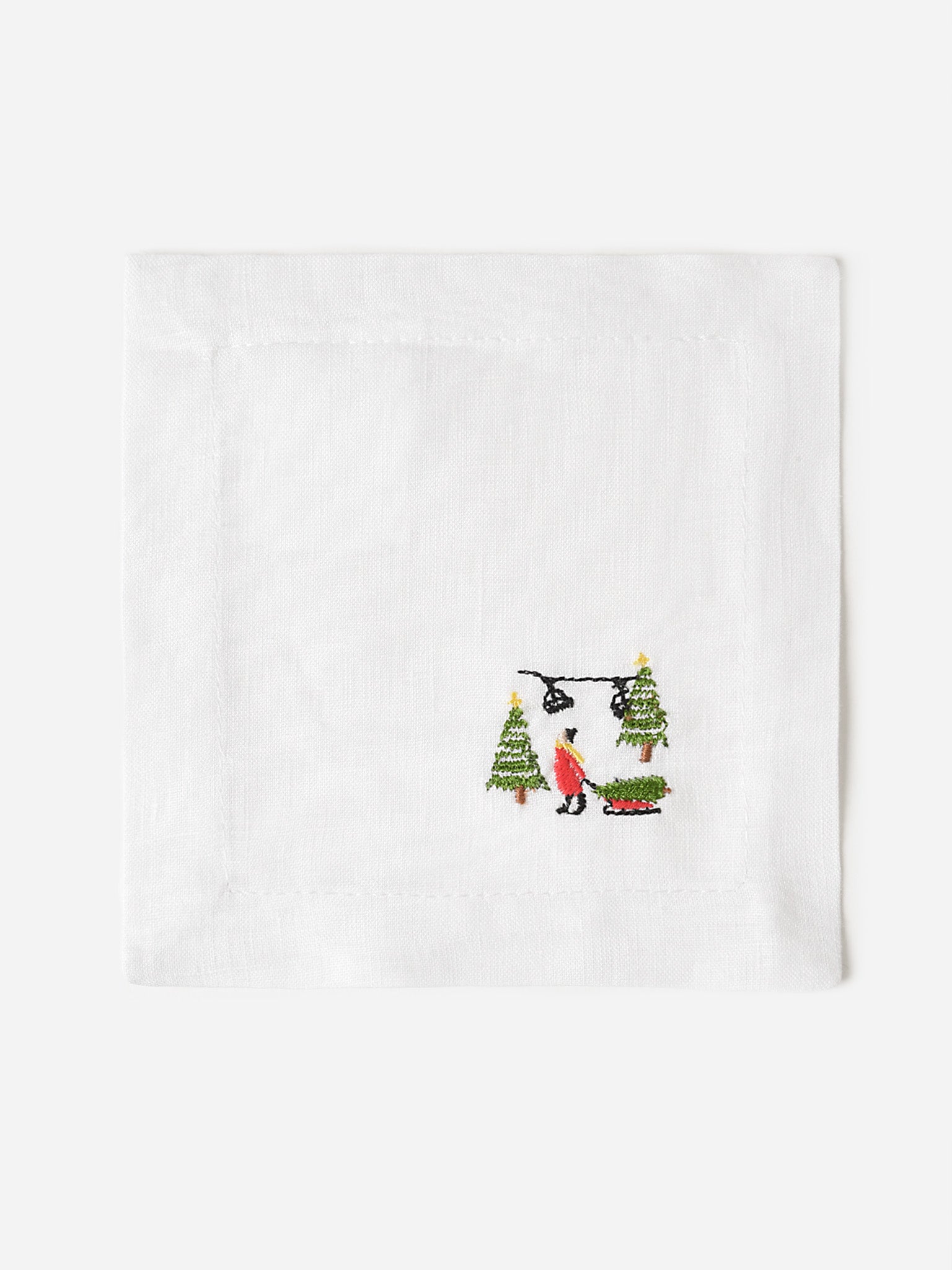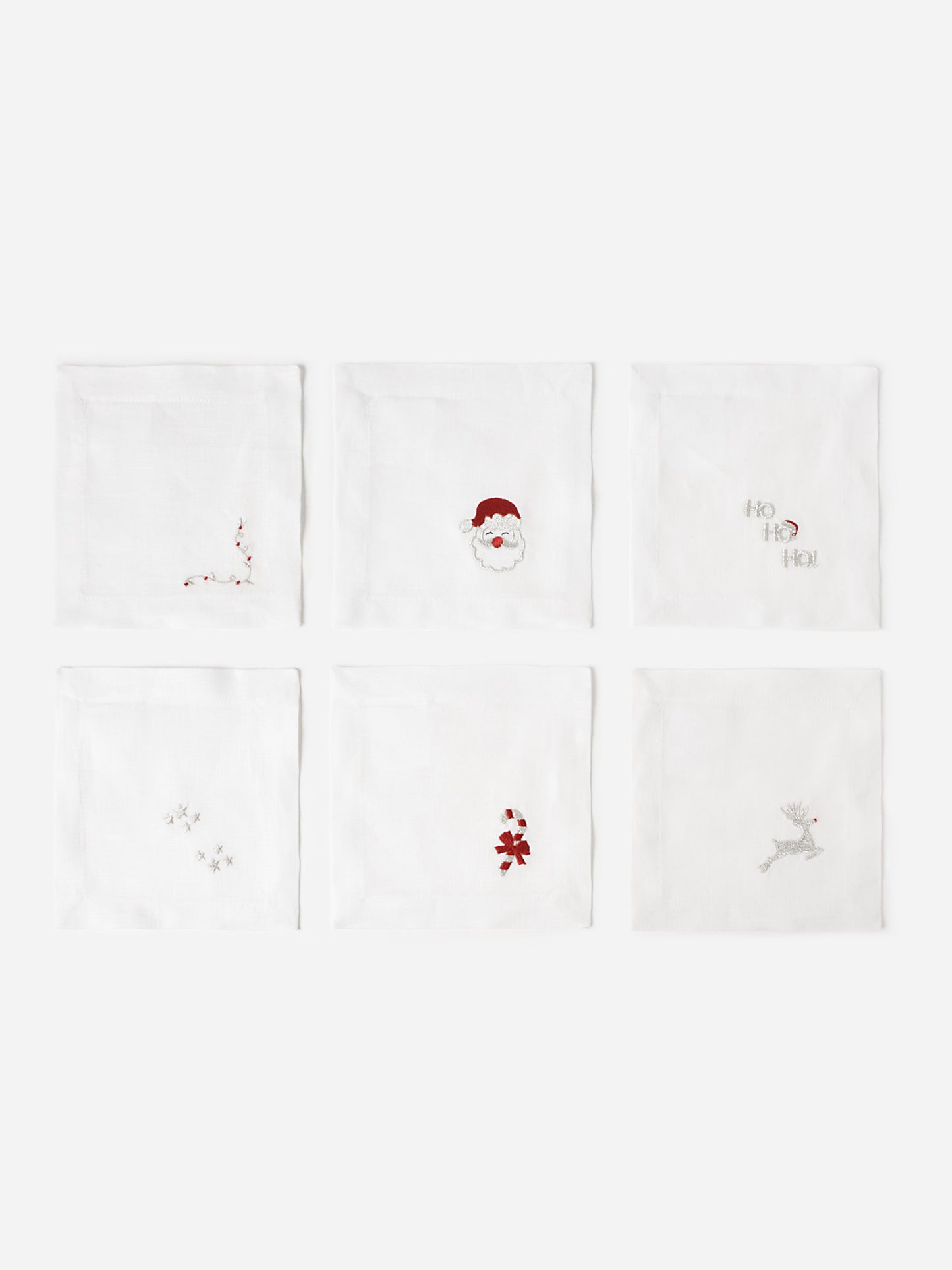 A set of six cocktail napkins with holiday-inspired embroidered designs.