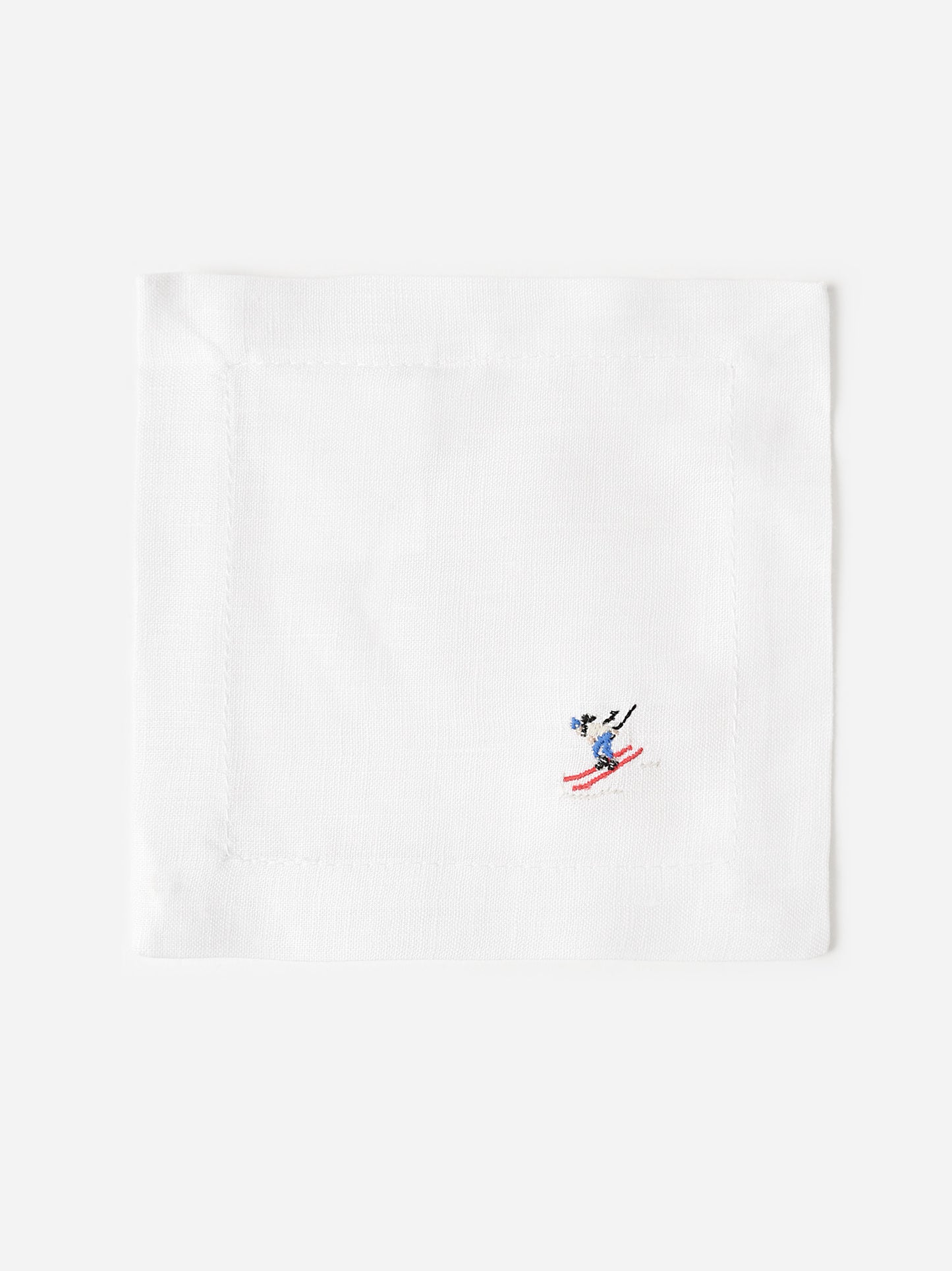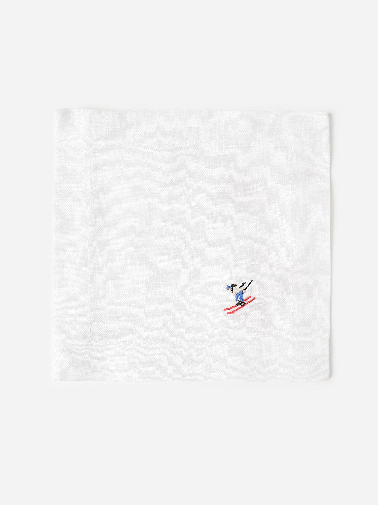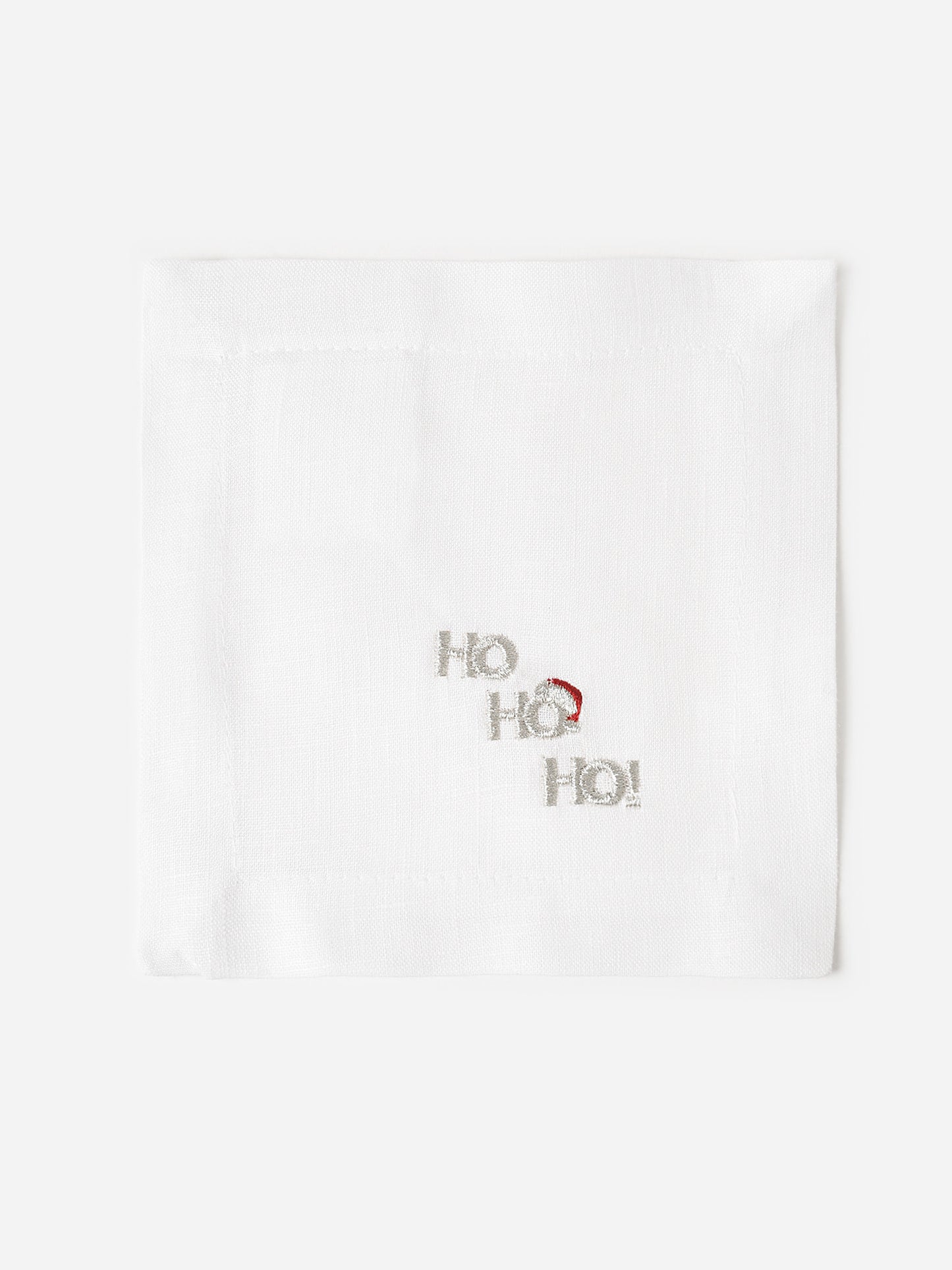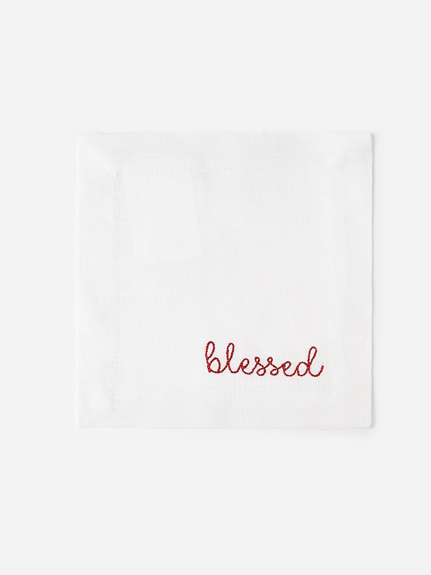 A set of six cocktail napkins with holiday-inspired embroidered designs.