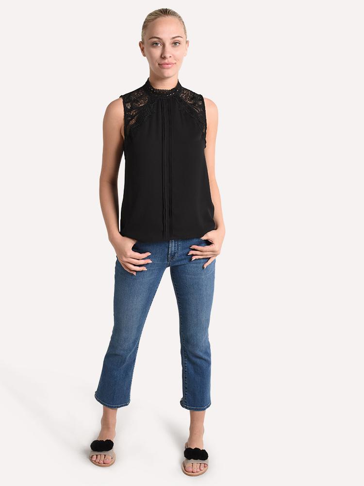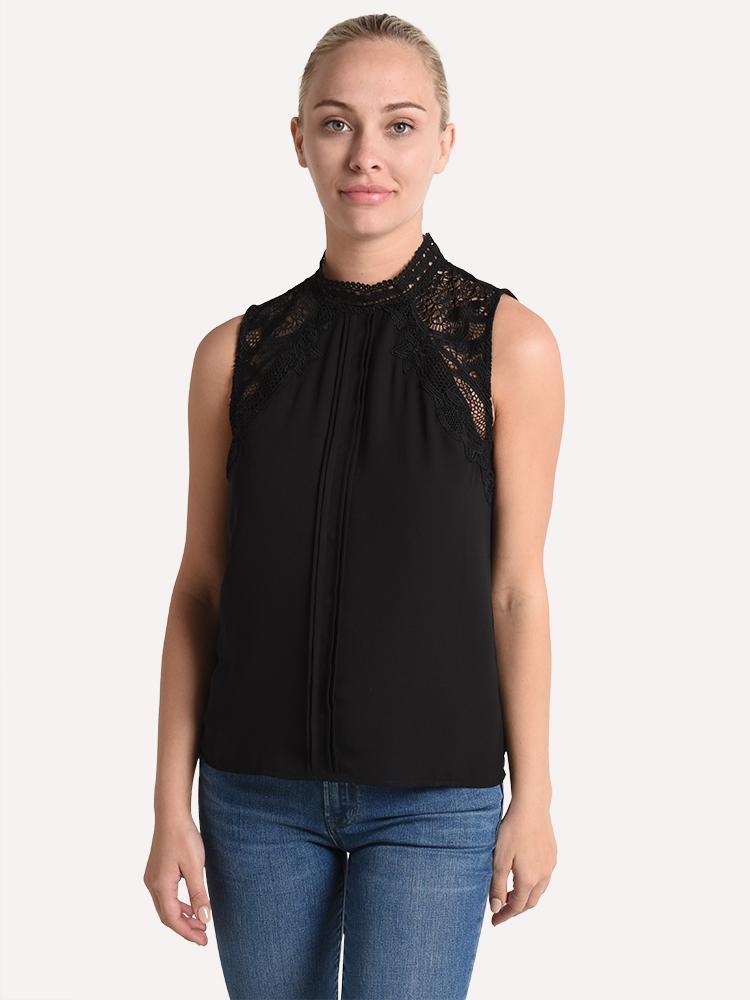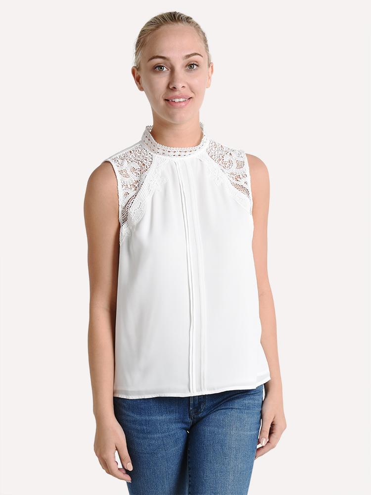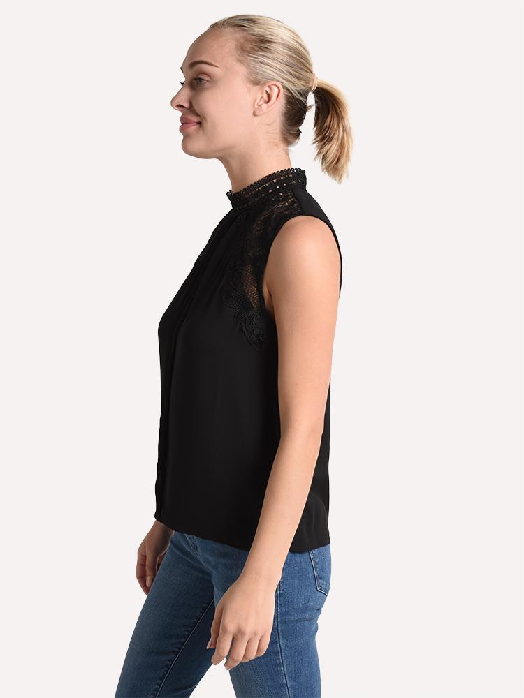 - Lace insets highlight the shoulders for a feminine look.
