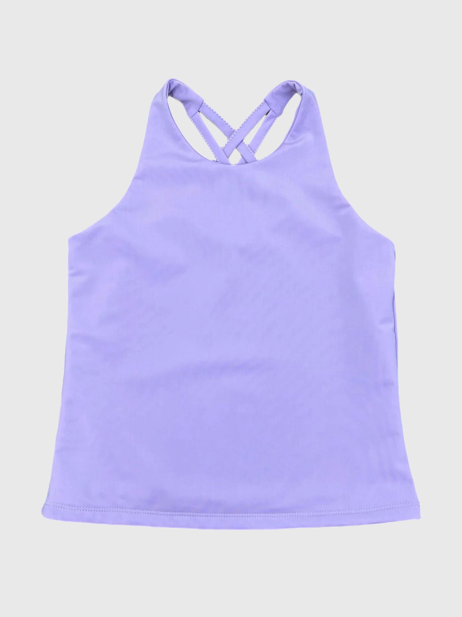 A comfortable tank top made from breathable performance fabric with a criss-cross strap design.