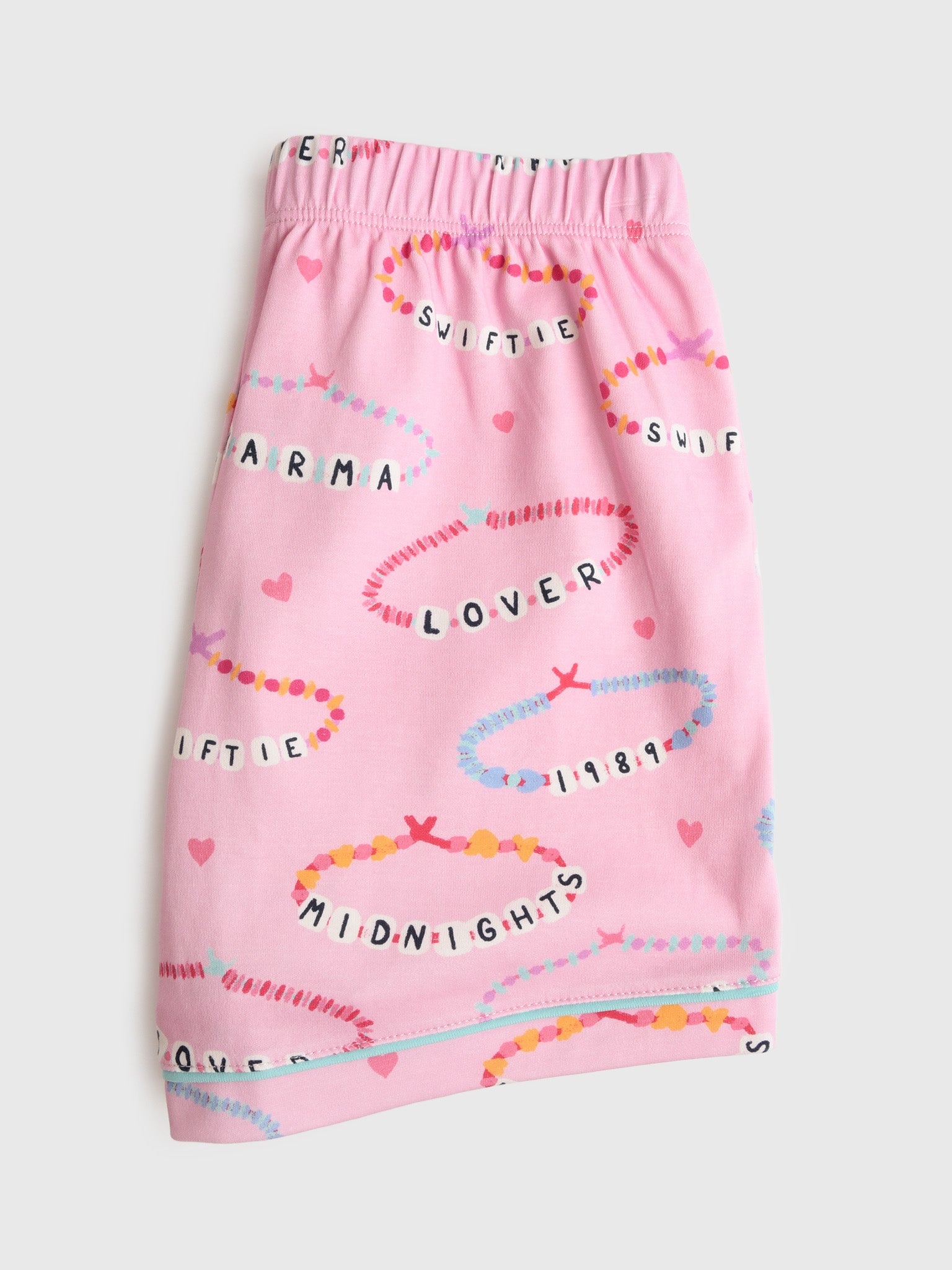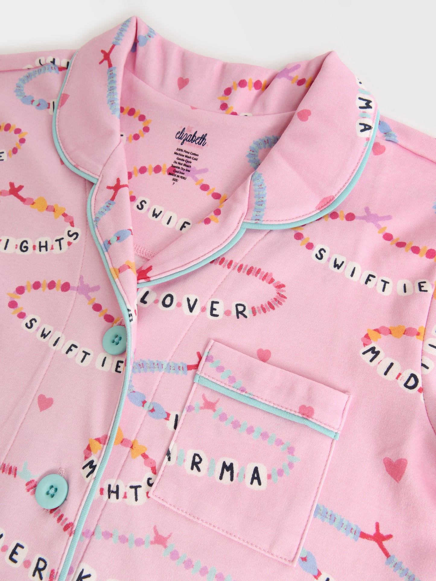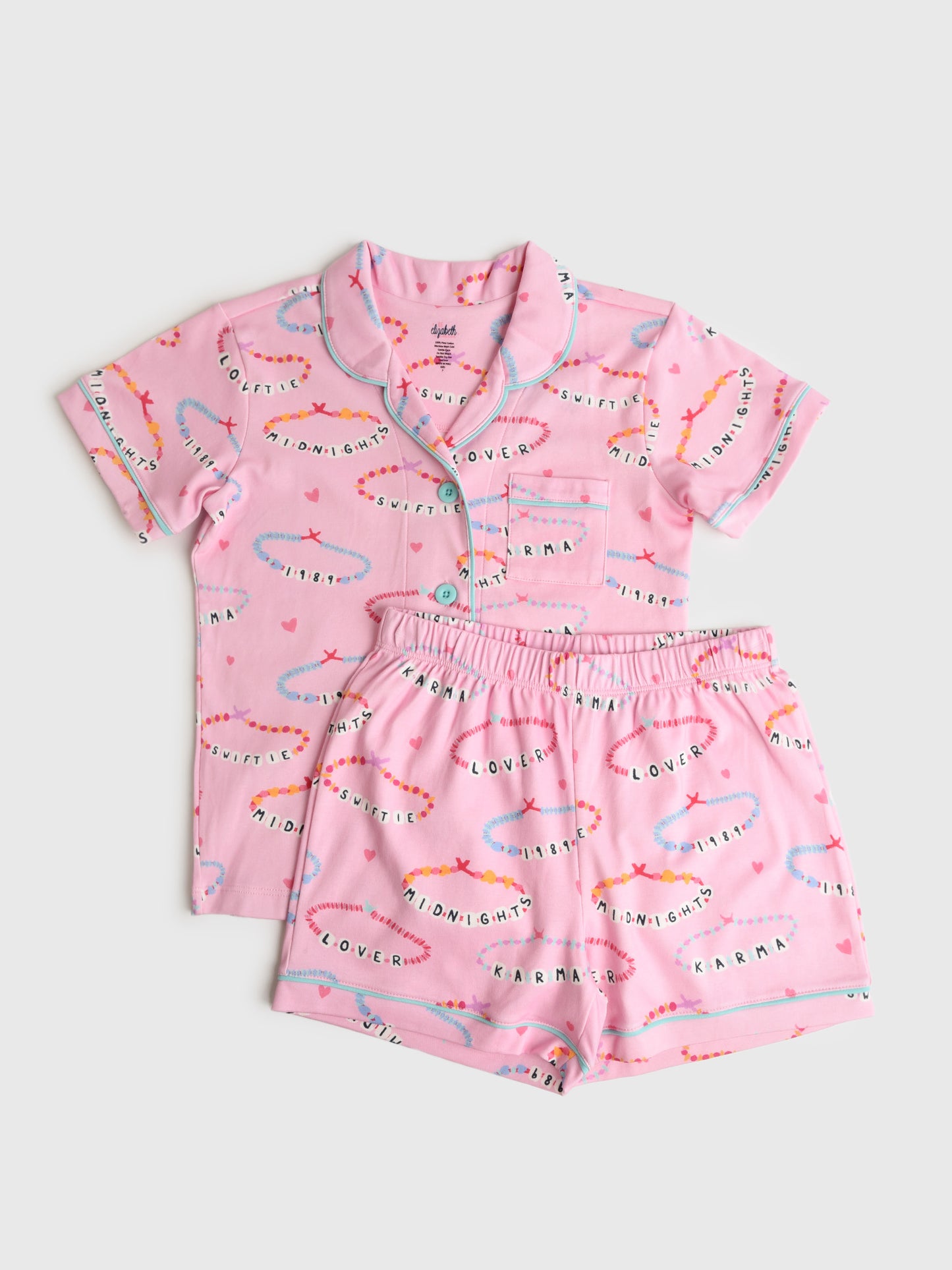 A short-sleeve top and short pajama set made from soft Pima cotton with a Taylor Swift friendship bracelet-inspired print.