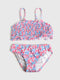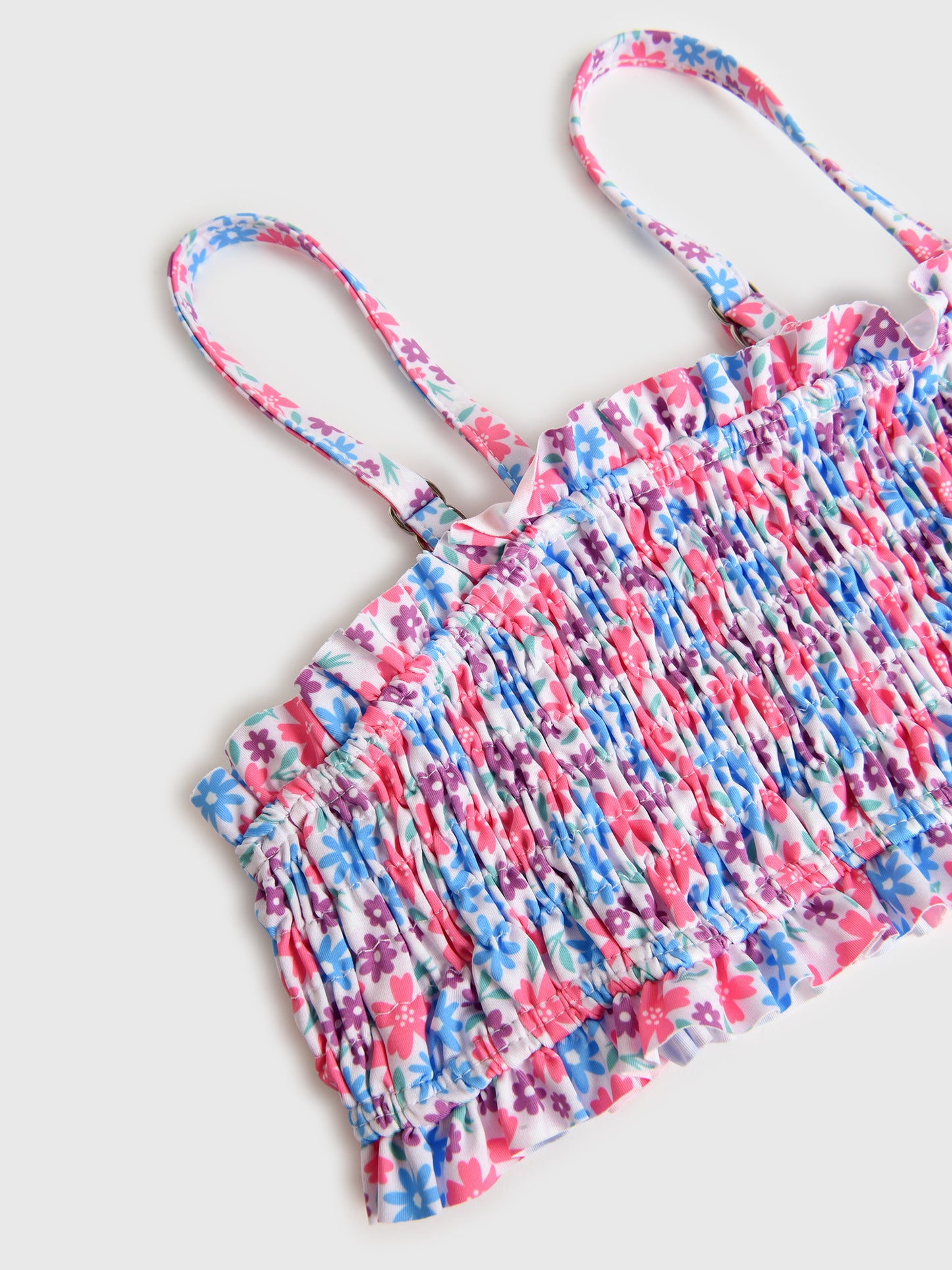 This stylish bikini features a comfortable smocked design, ruffle trims, and a colorful ditsy floral print.