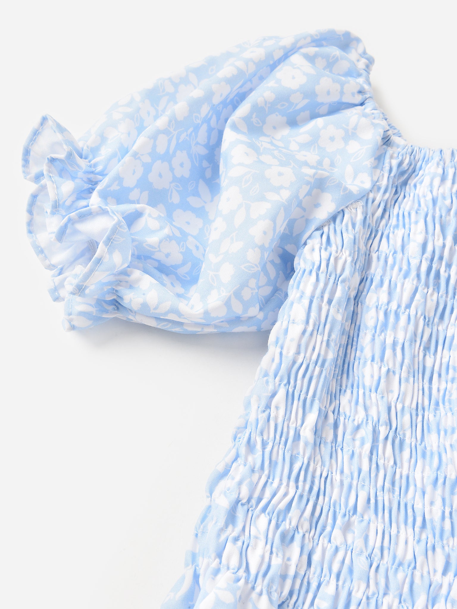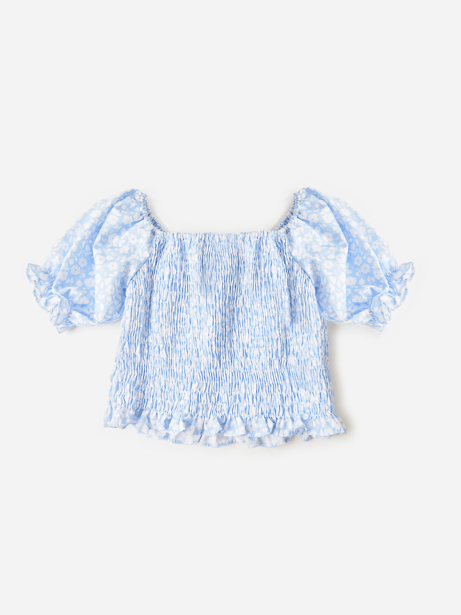A floral-printed smocked top with puff sleeves and a ruffle hem.