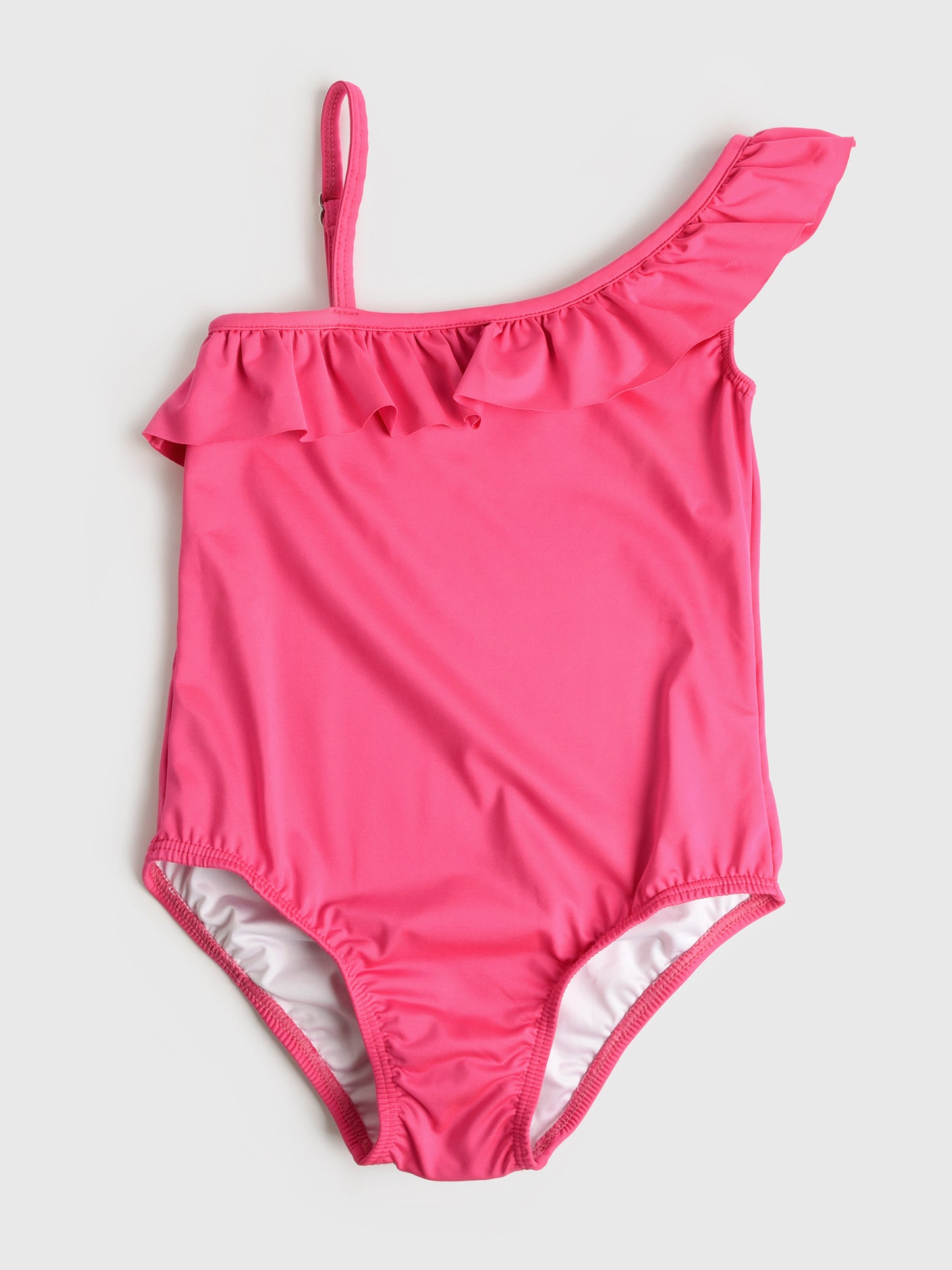 This classic one-piece swimsuit features a one-shoulder design, ruffle trim, and full coverage.
