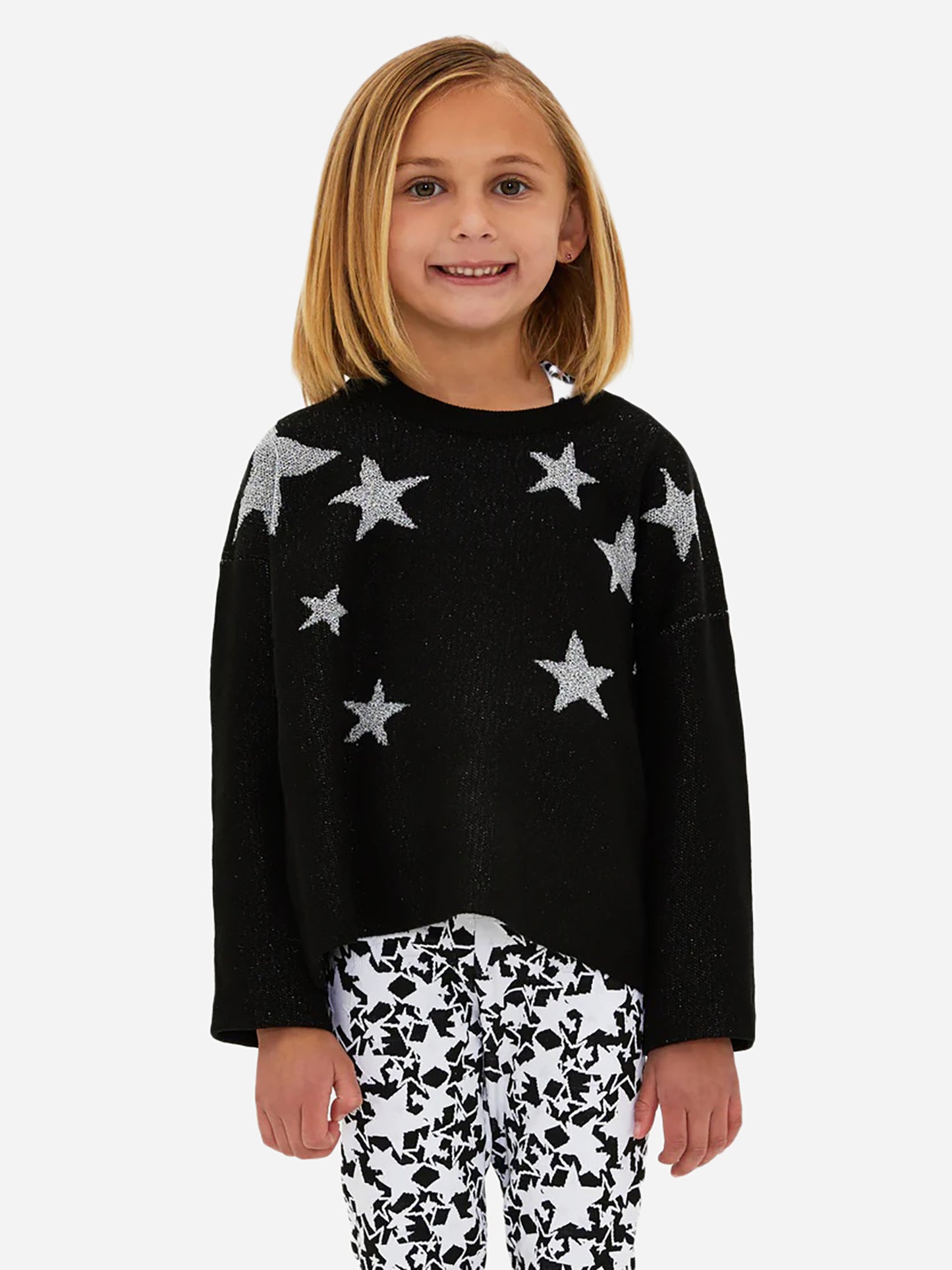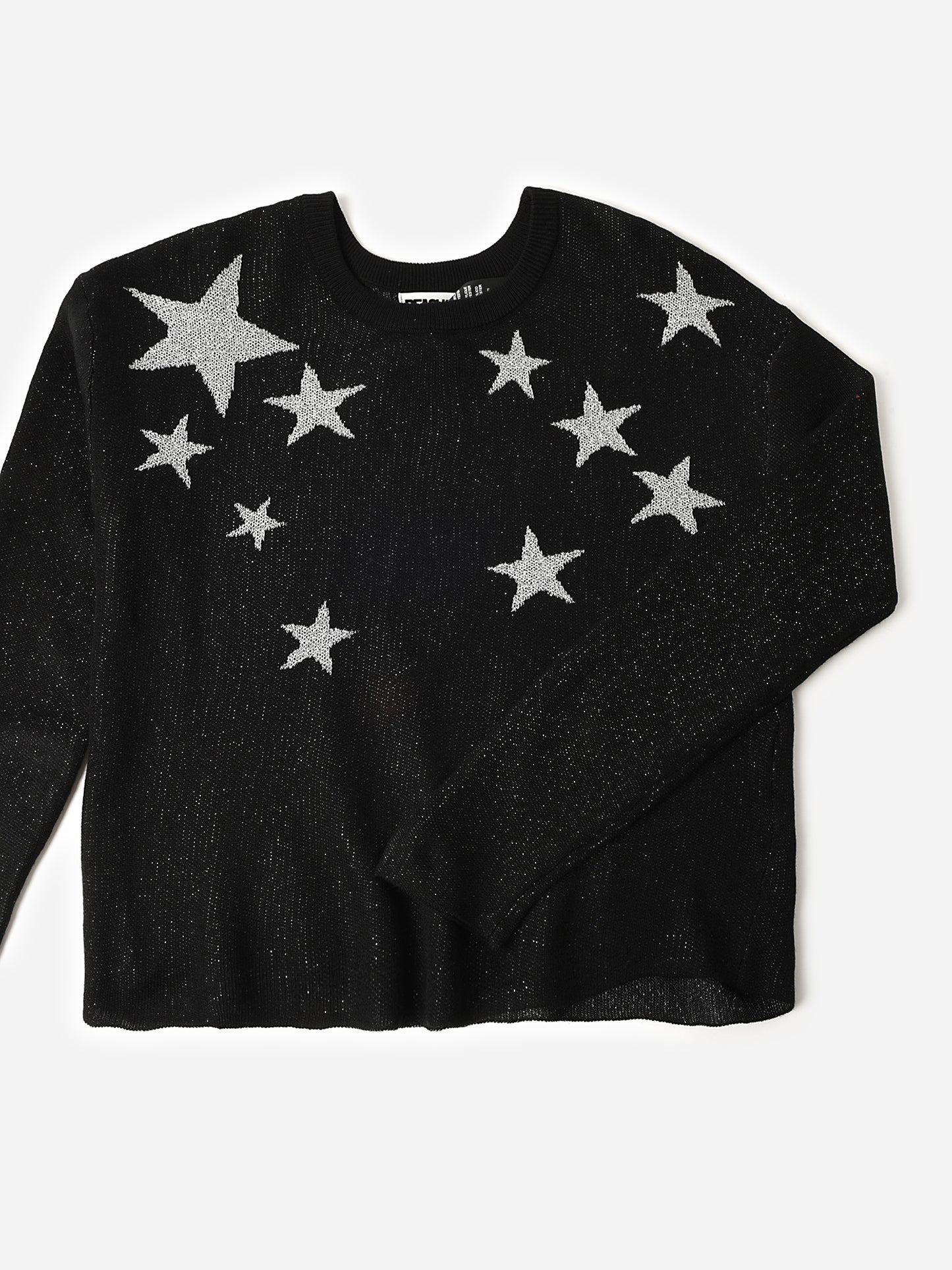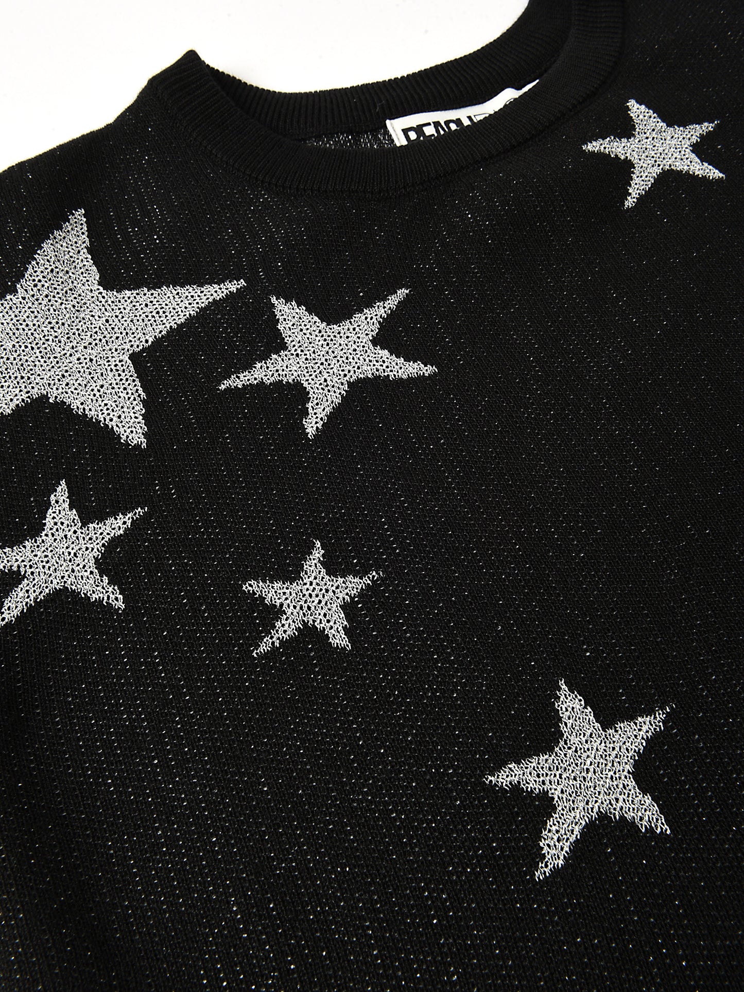 A slightly oversized crewneck sweater featuring sparkly silver star motifs.