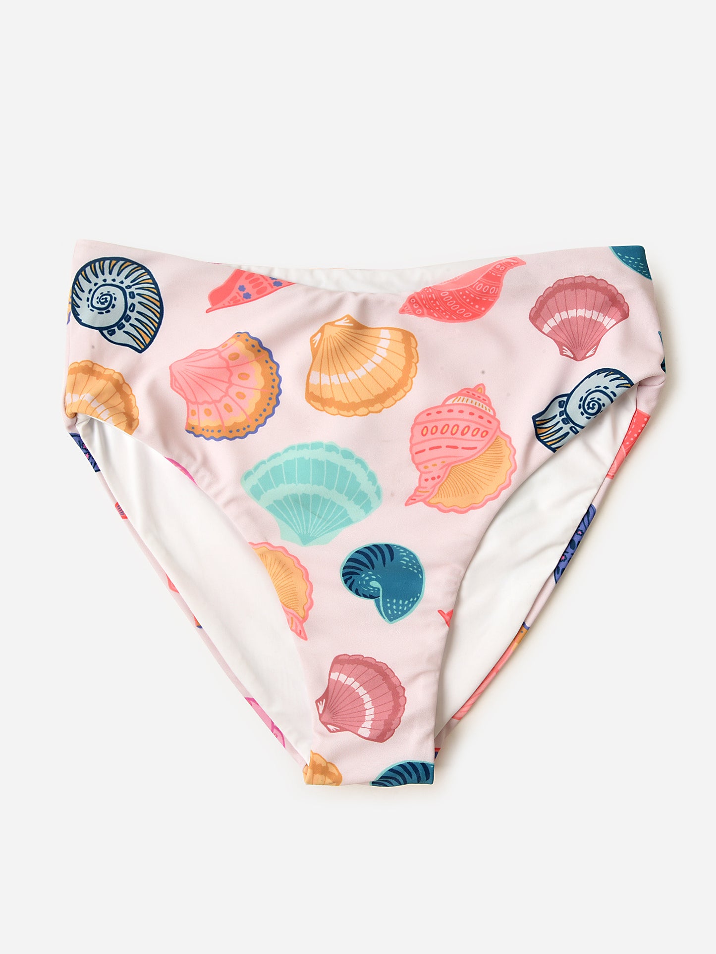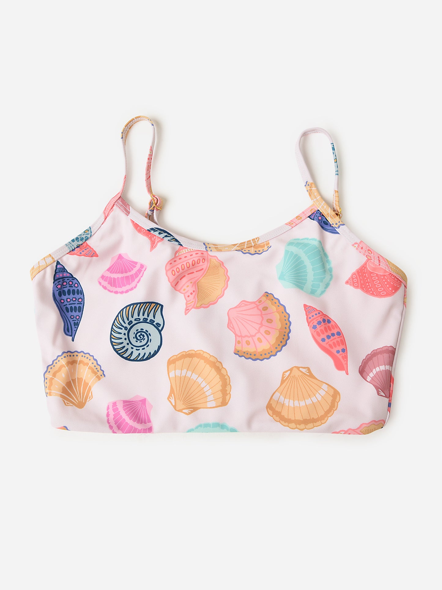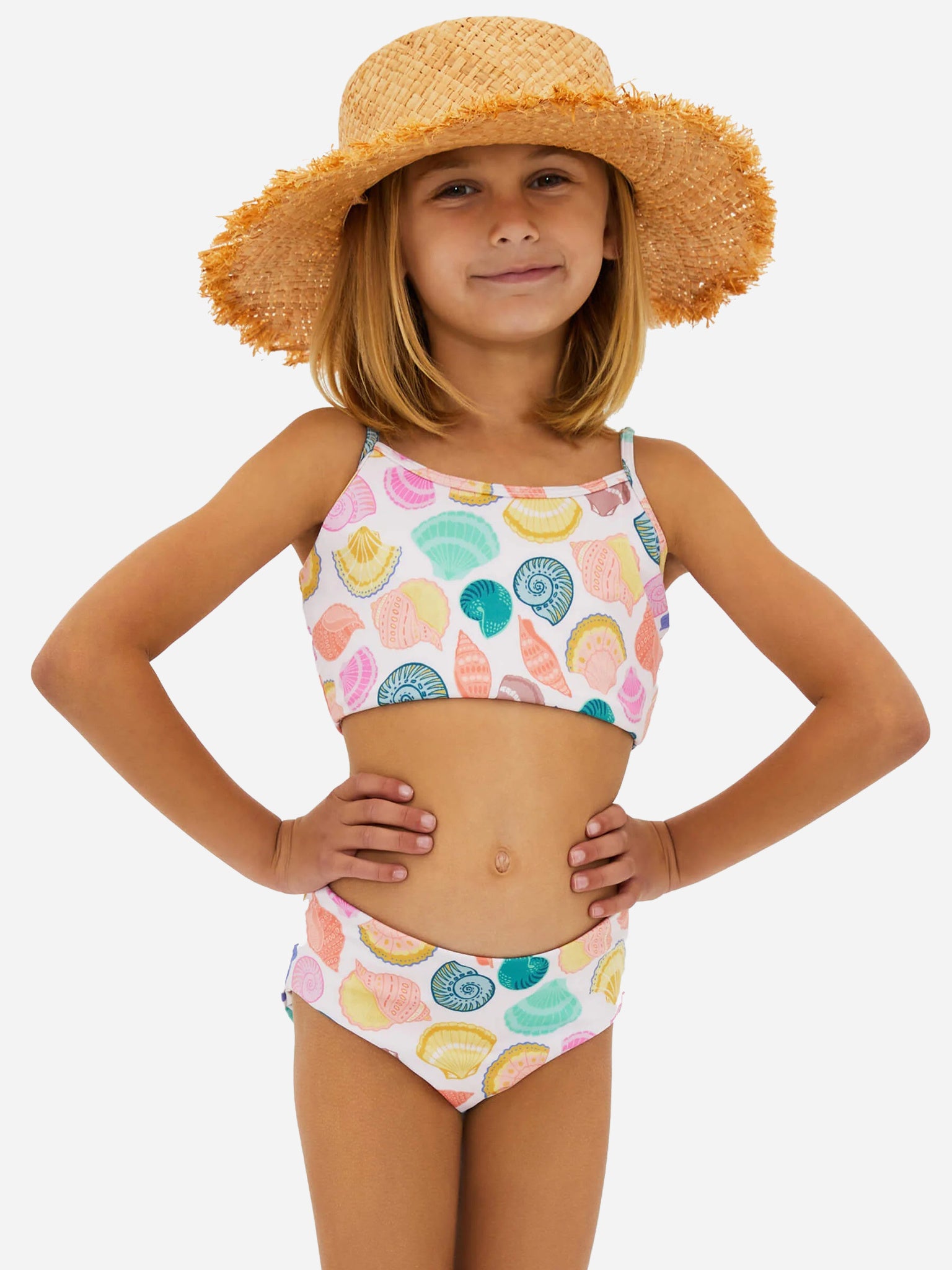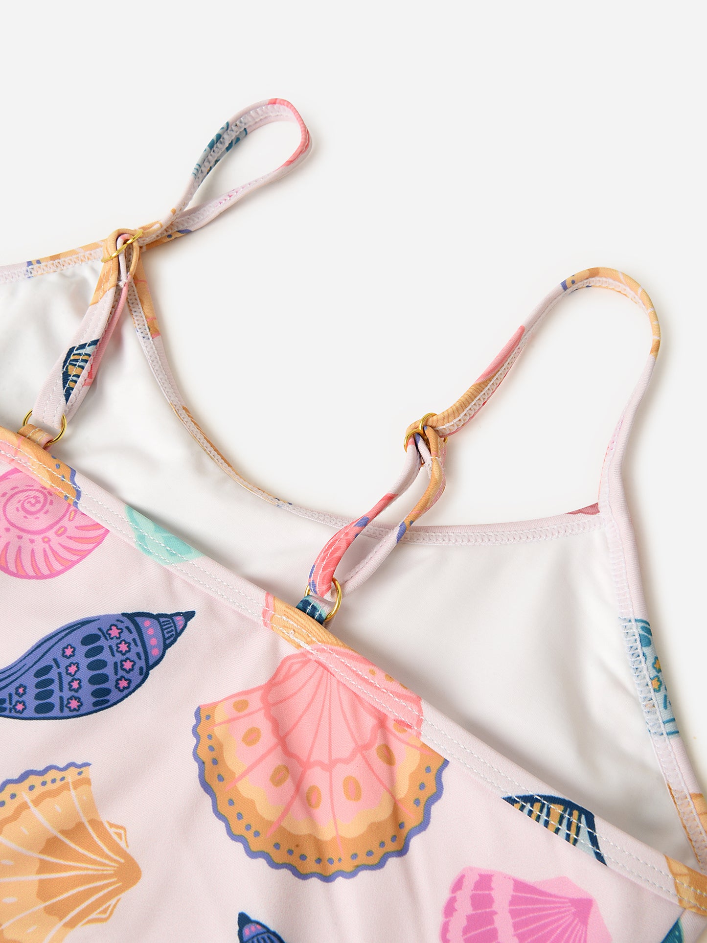 An adorable two-piece swimsuit featuring a tank-style top and full coverage bottom with a colorful shell print.