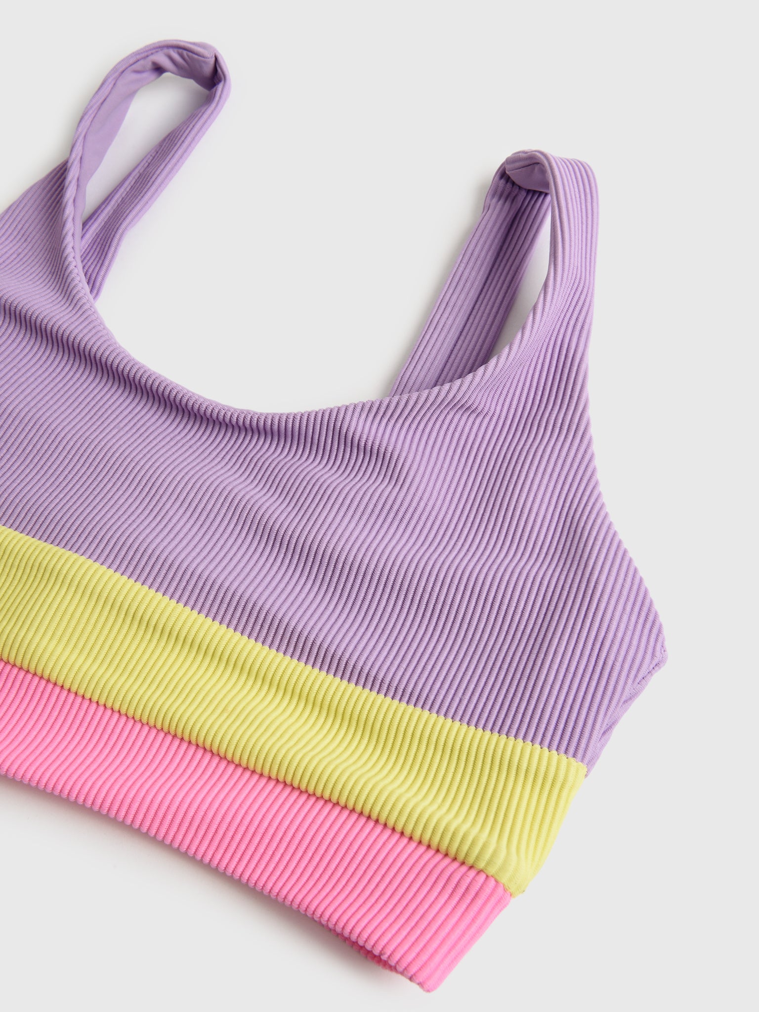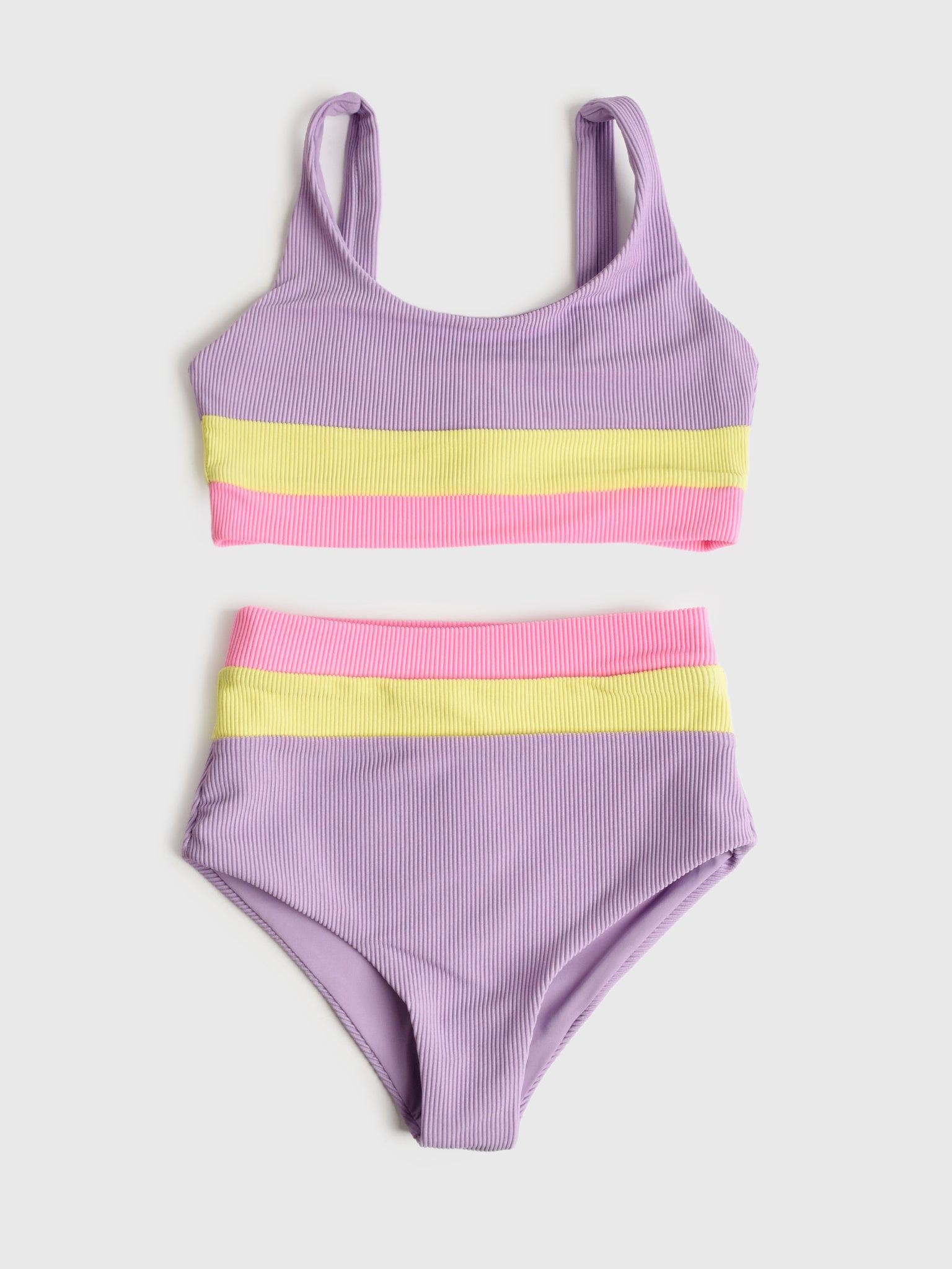 This color-block bikini set features a bright pastel design made from soft ribbed fabric.