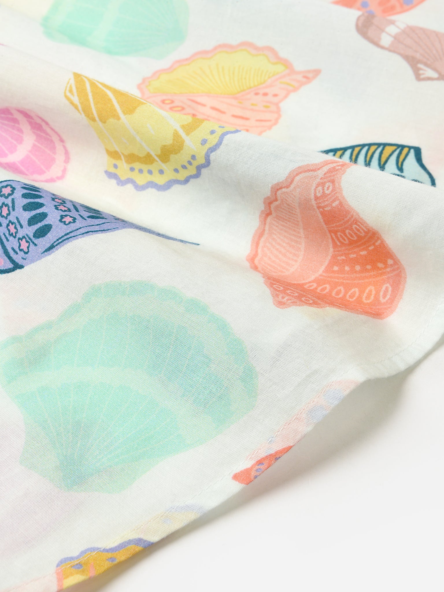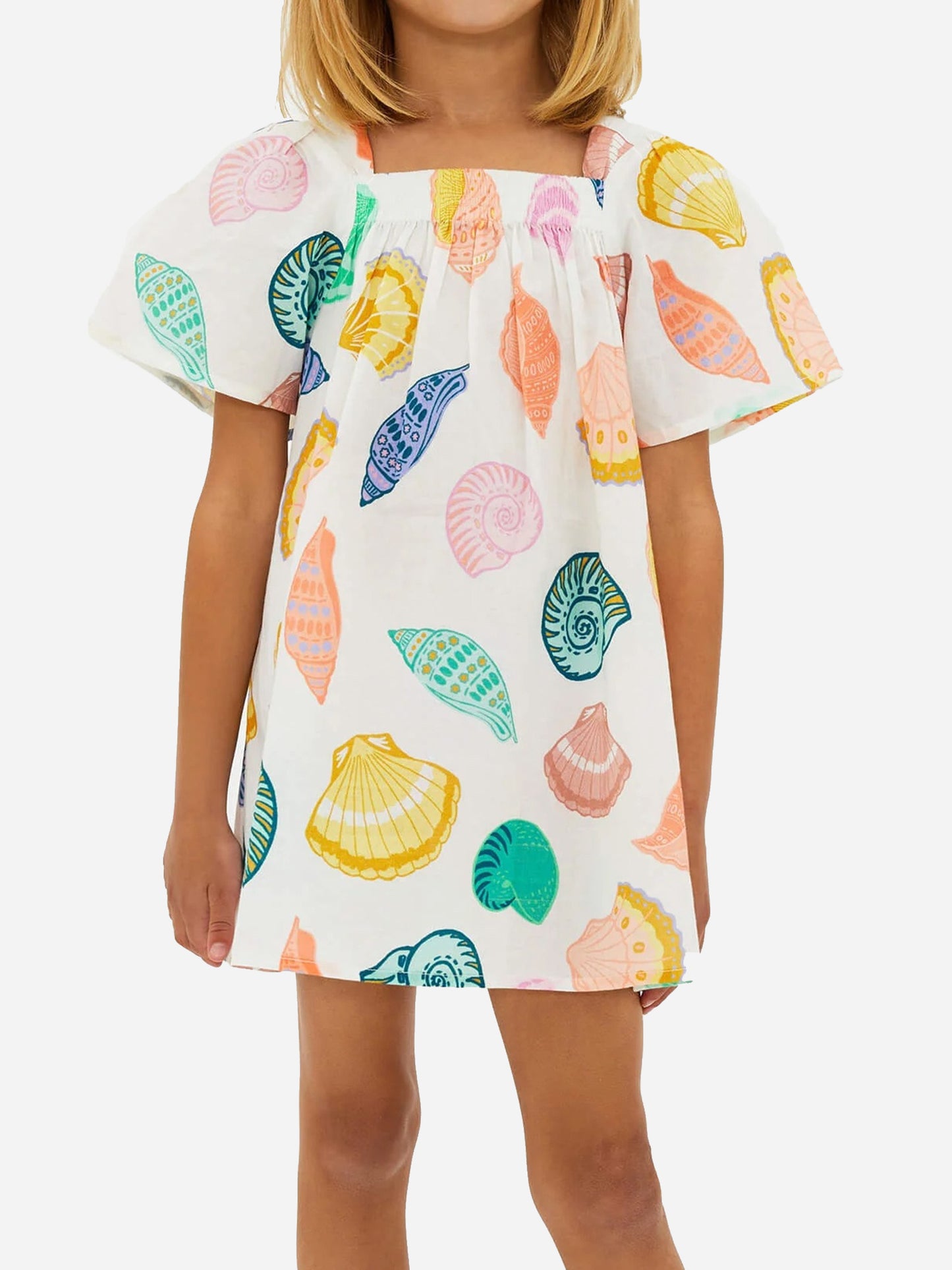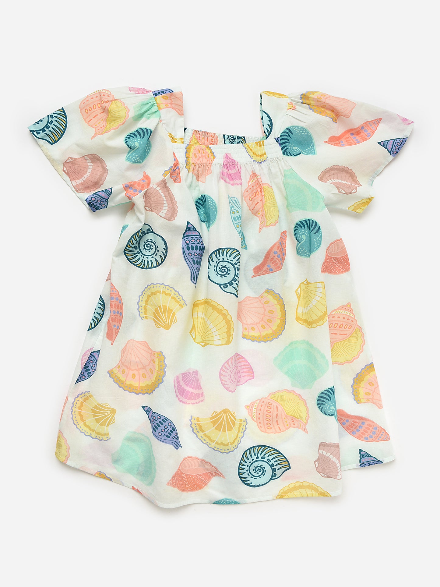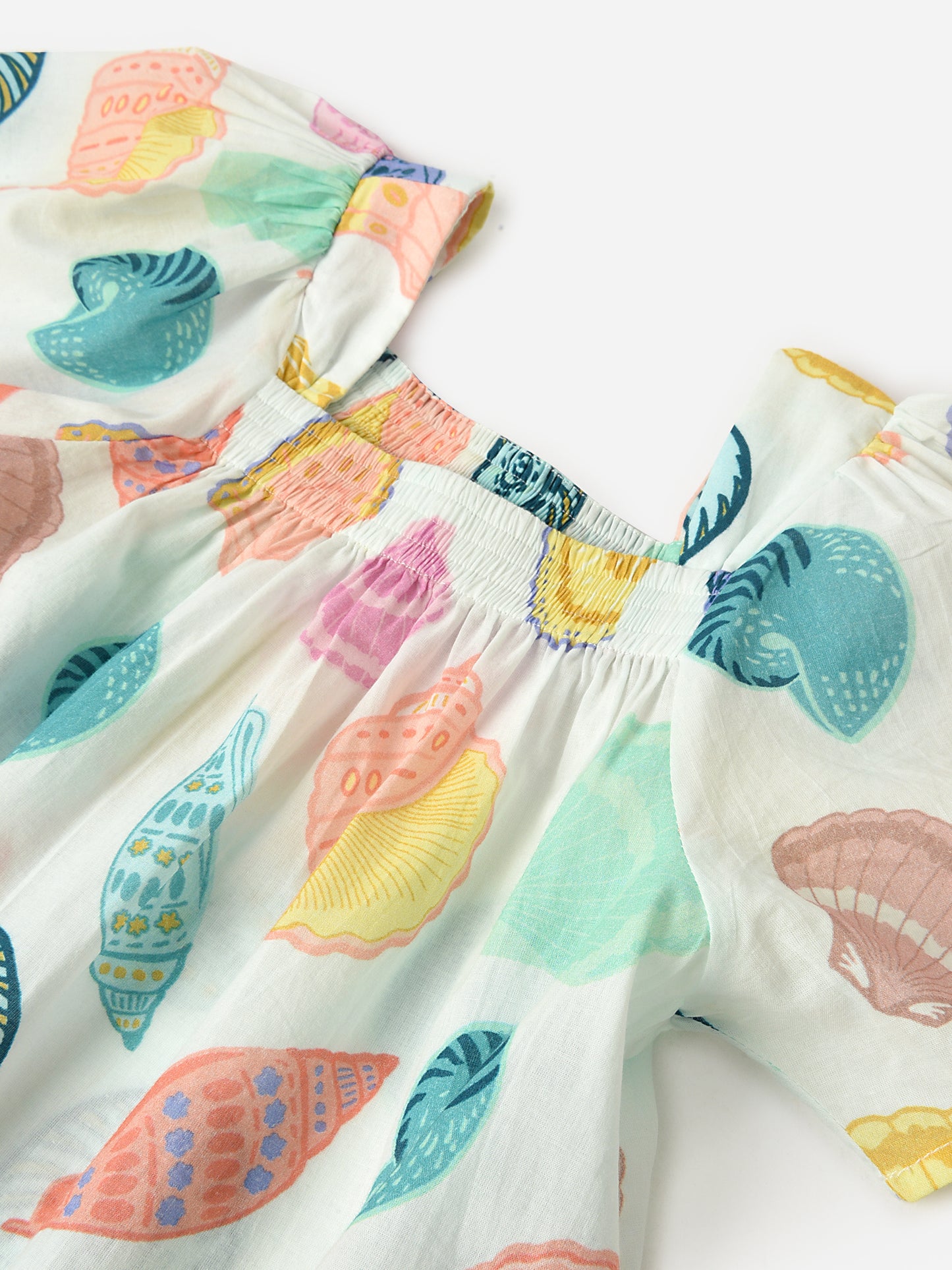 A lightweight cotton dress with a smocked neckline and colorful seashell print.