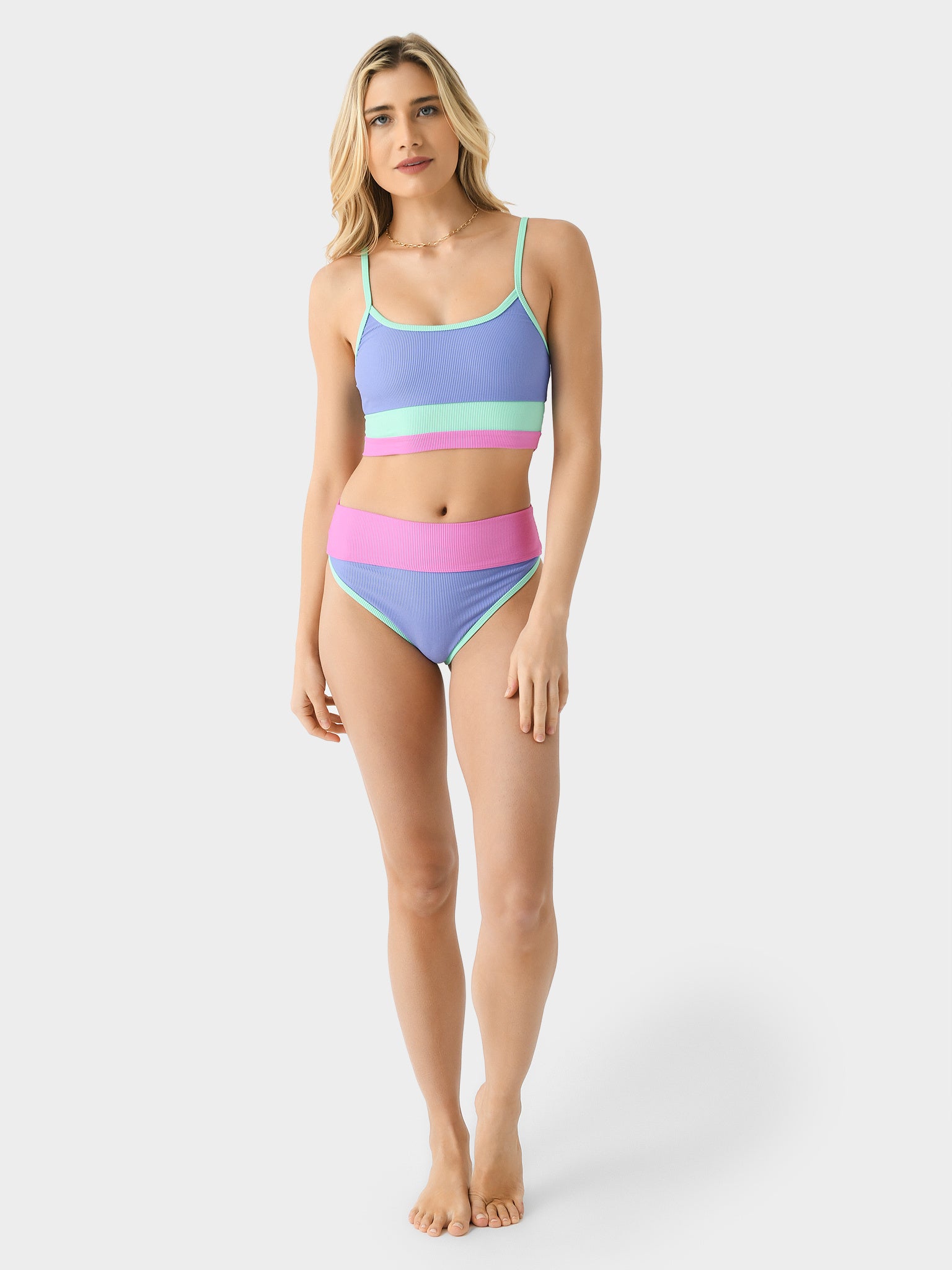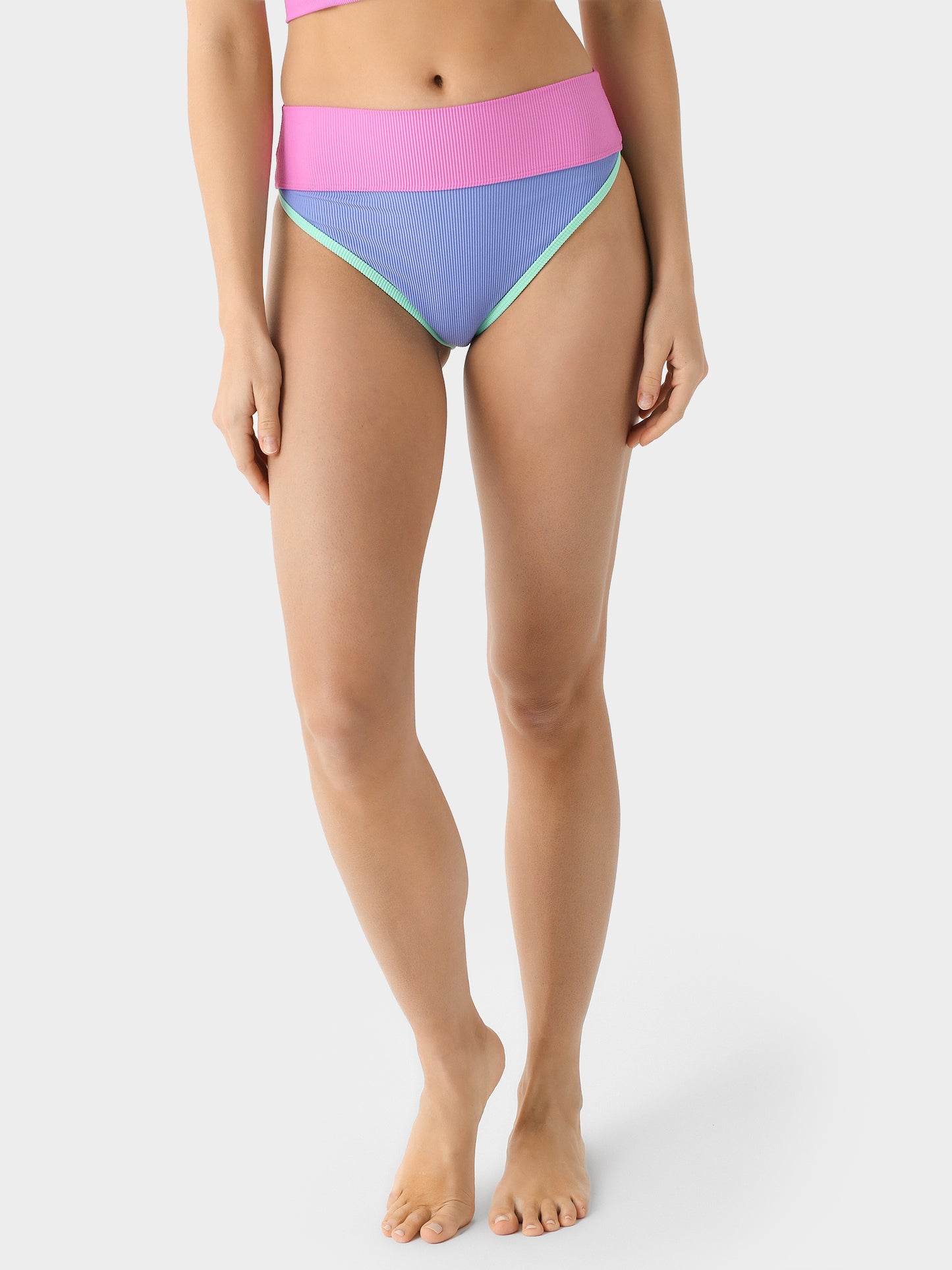 A high-waisted bikini bottom made from soft ribbed fabric with a colorful color block design.