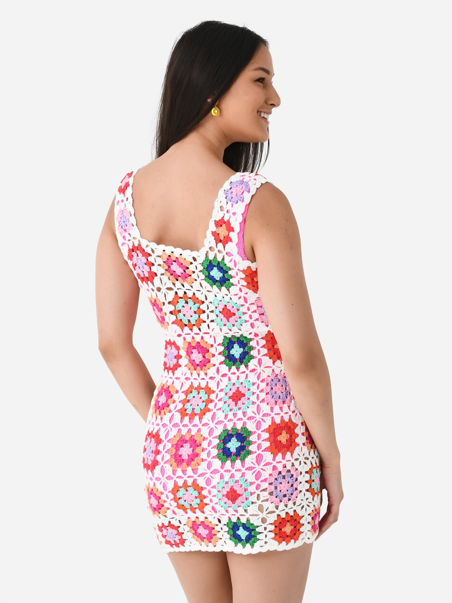 Crochet cover-up dress decorated with colorful flowers in a mini silhouette.