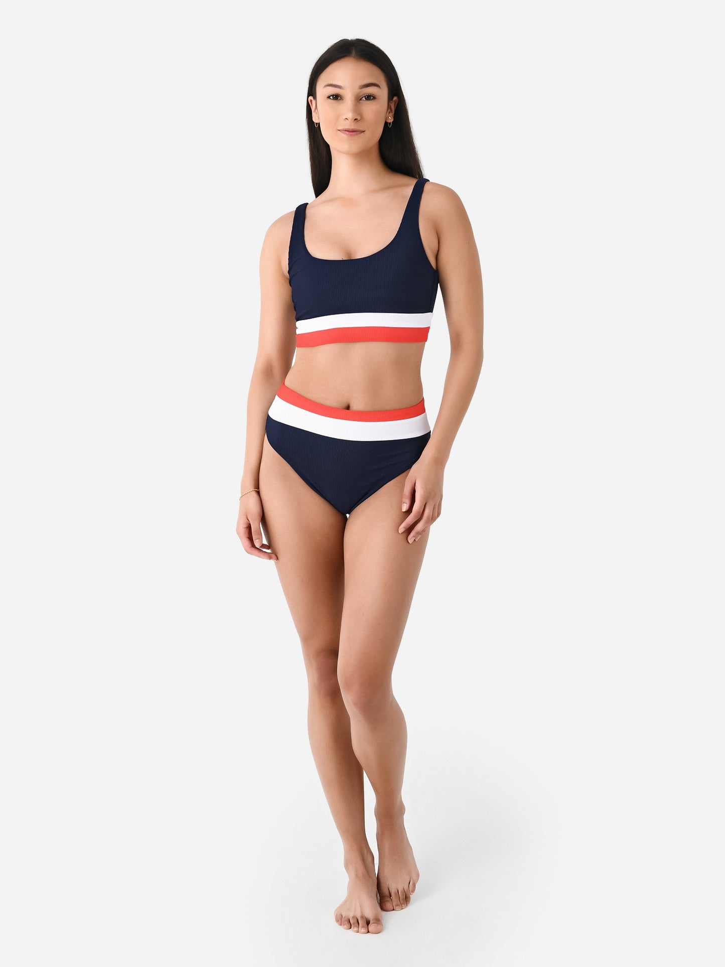 Red, white, and blue ribbed bikini top with a sporty silhouette.