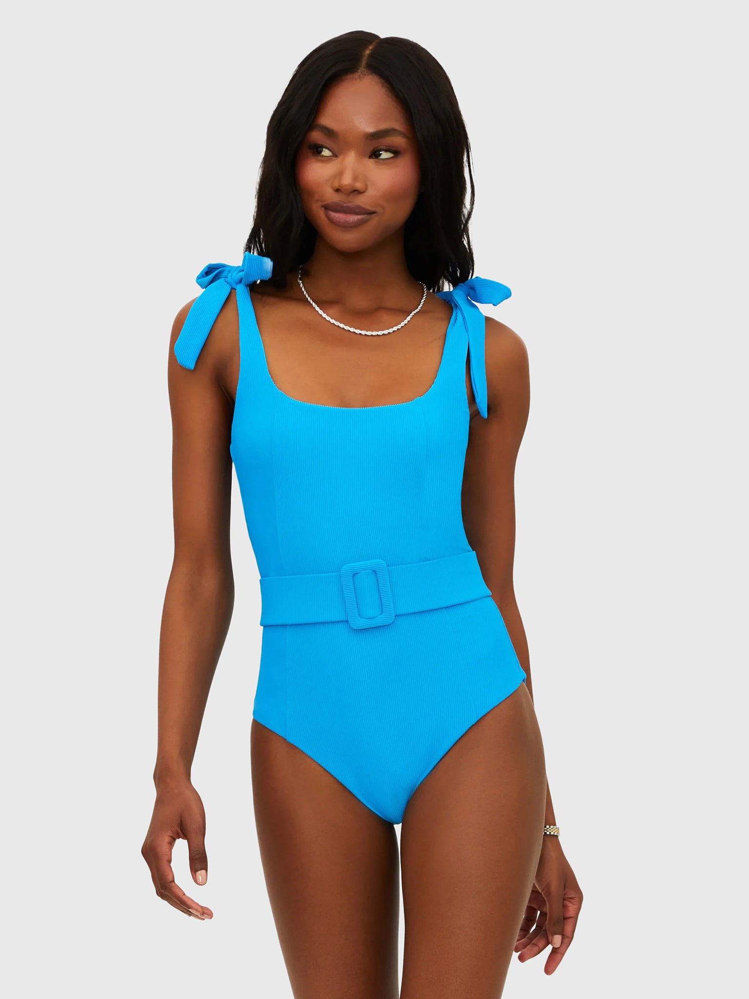 A retro-inspired one-piece swimsuit made from soft ribbed fabric with adjustable tie shoulder straps and a removable belt.