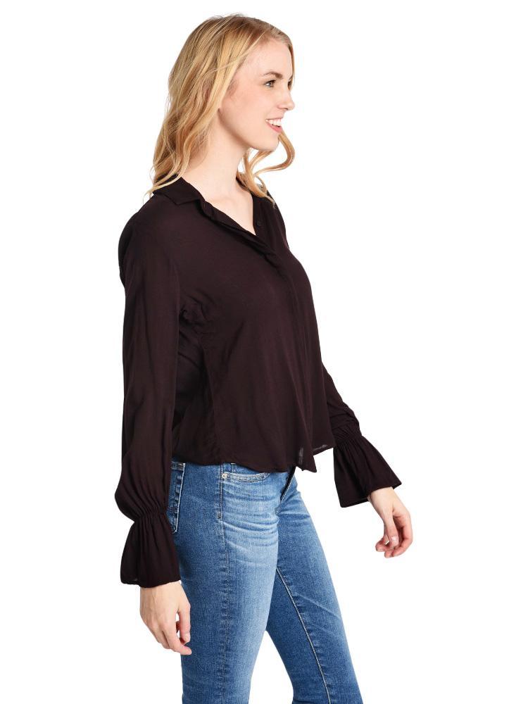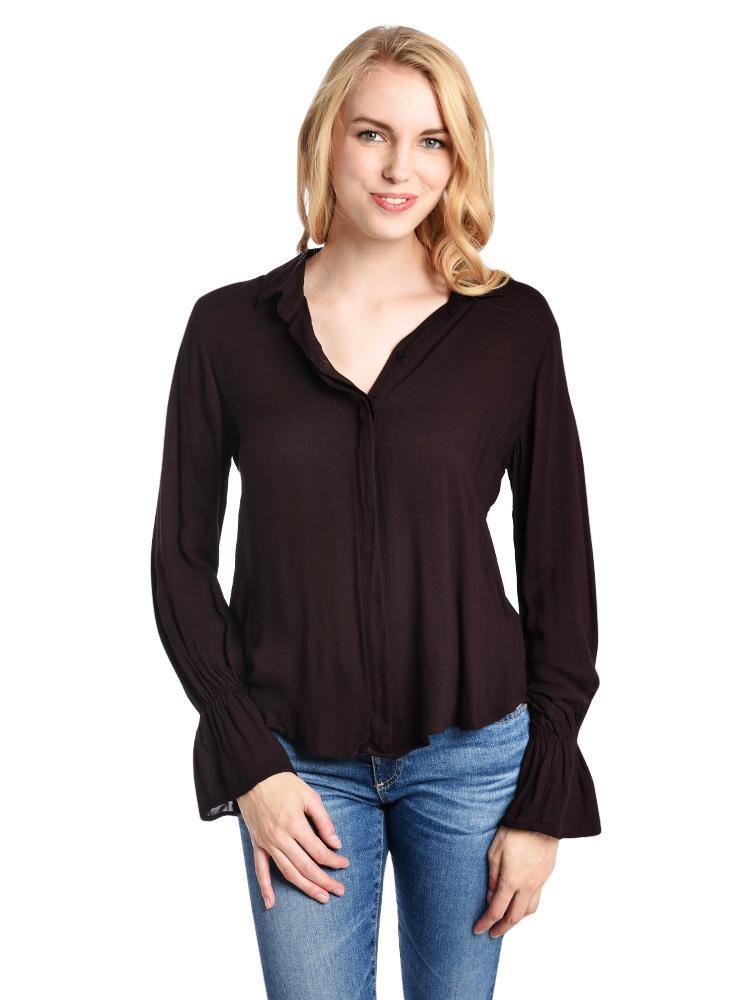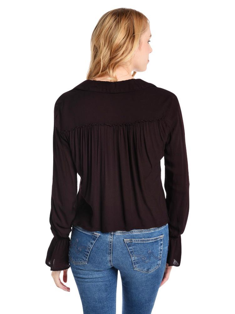 The Bella Dahl Ruffled Back Shirt has a button down front with ruffle trim.