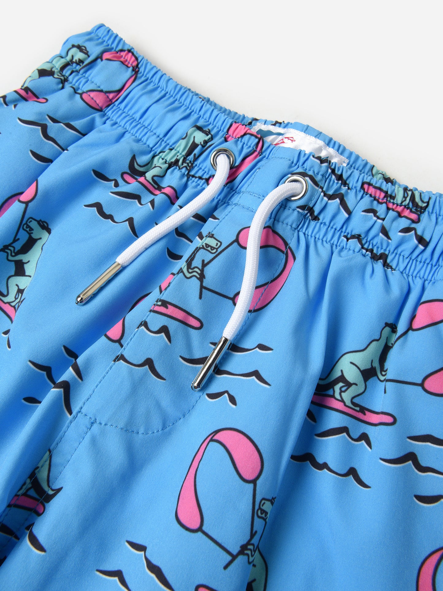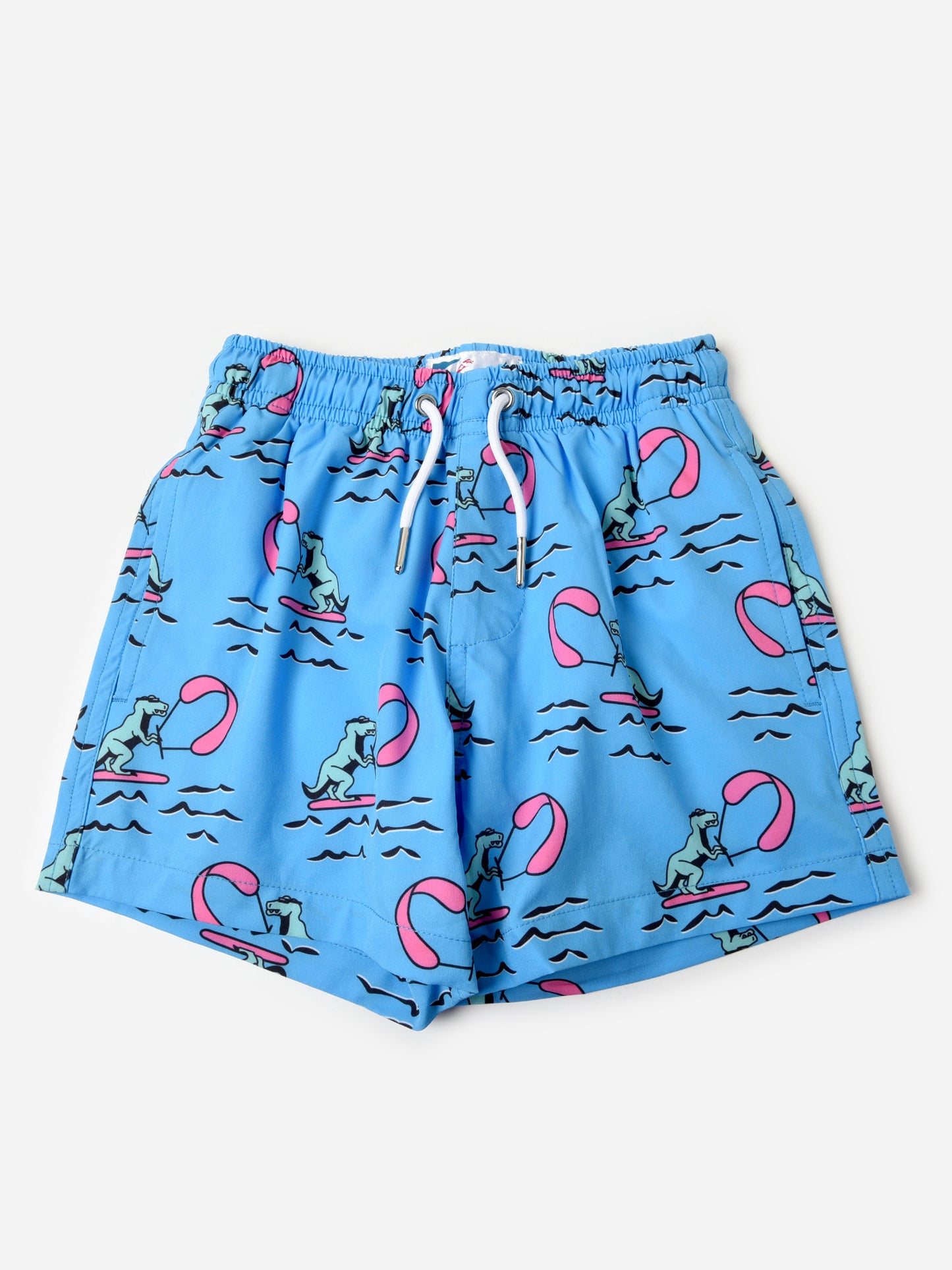 A breathable swim trunk with comfortable stretch and a fun dinosaur print.