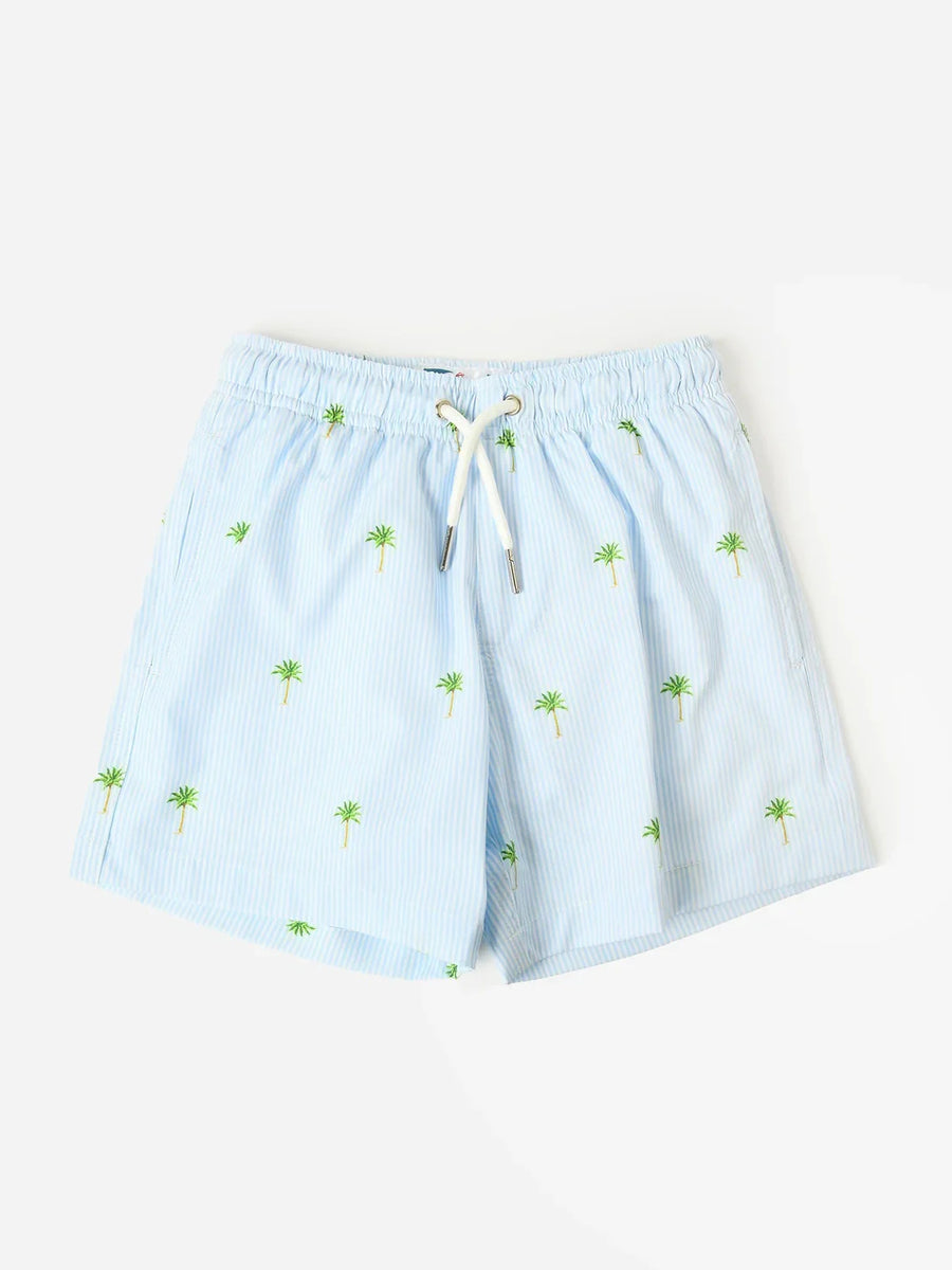 A soft and stretchy swim trunk with a striped, palm tree print.