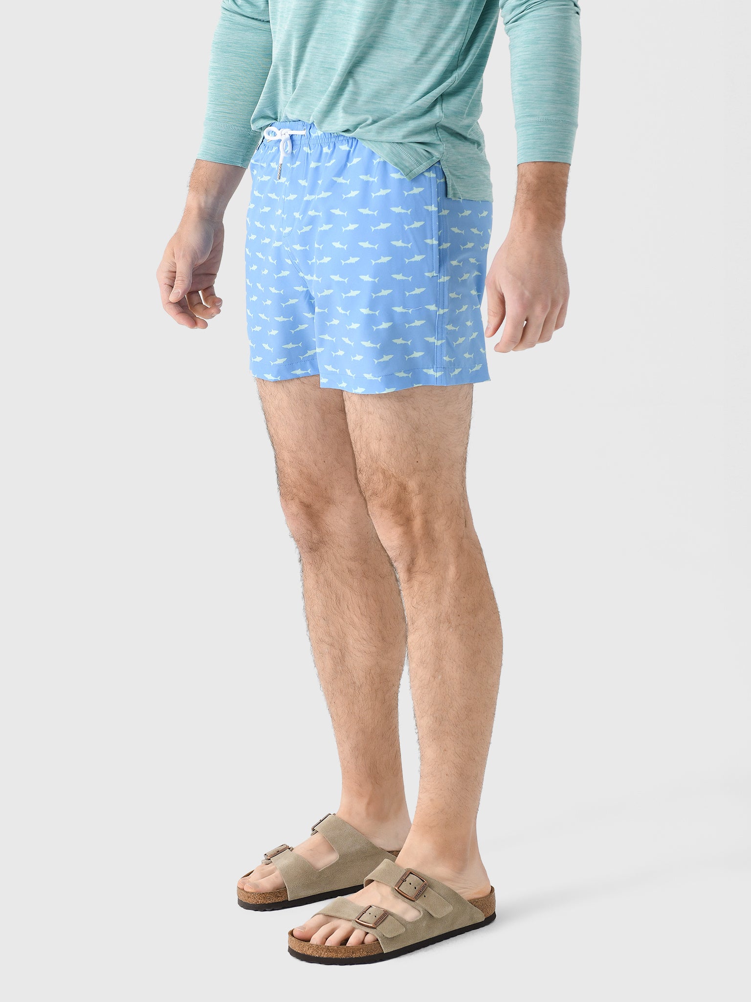 This comfortable swim trunk is made from lightweight four-way stretch material and features an all-over shark print.