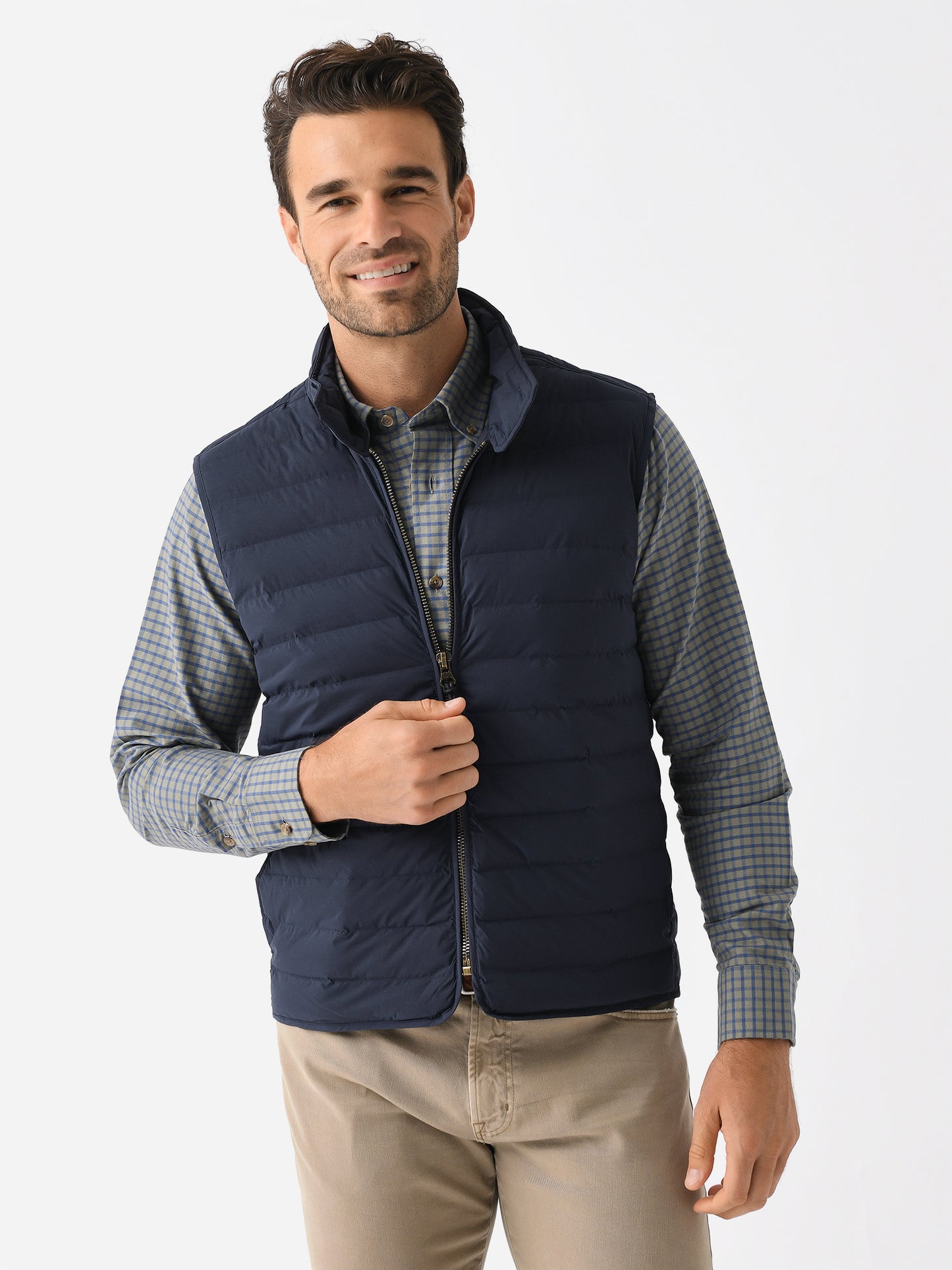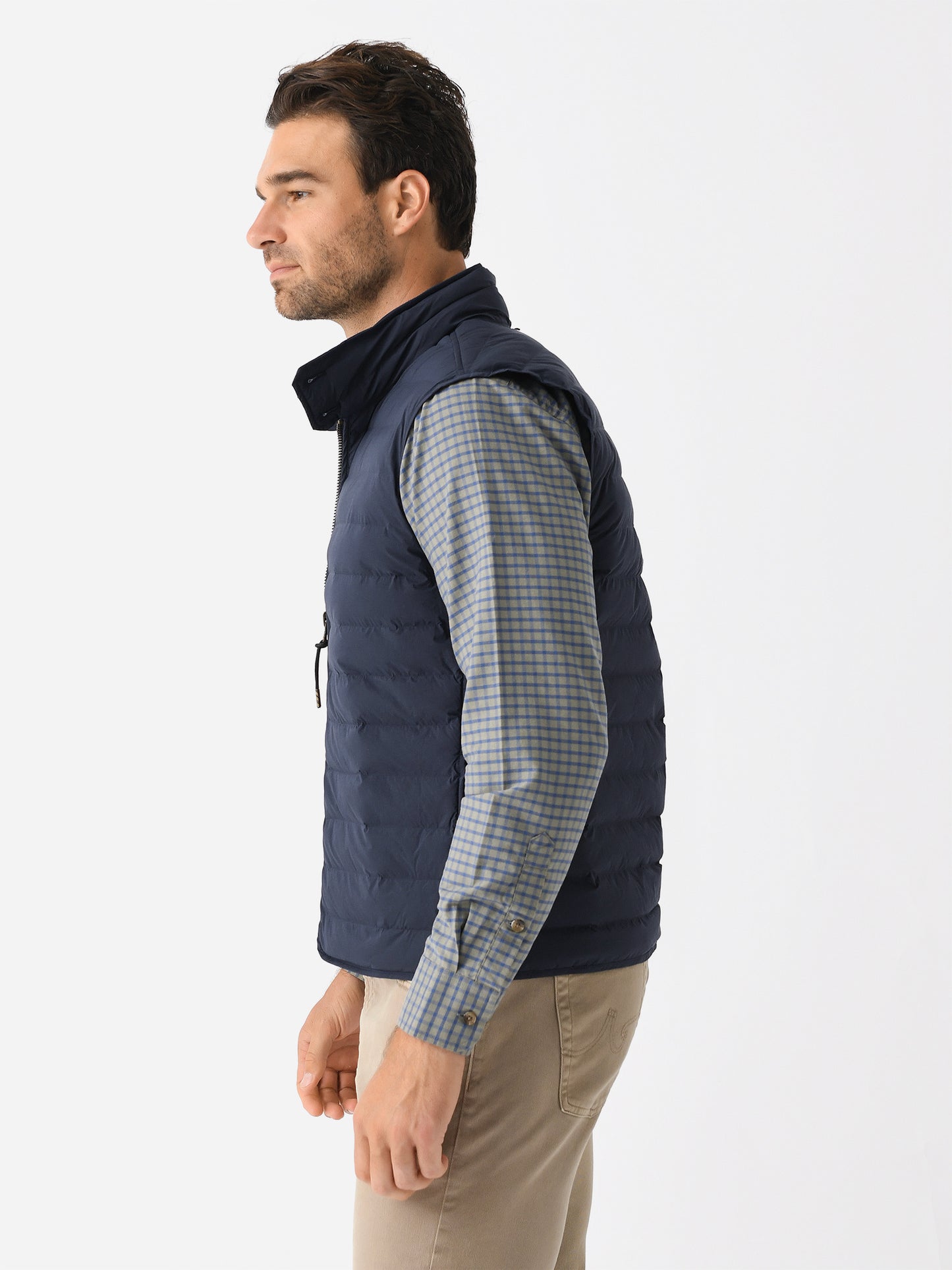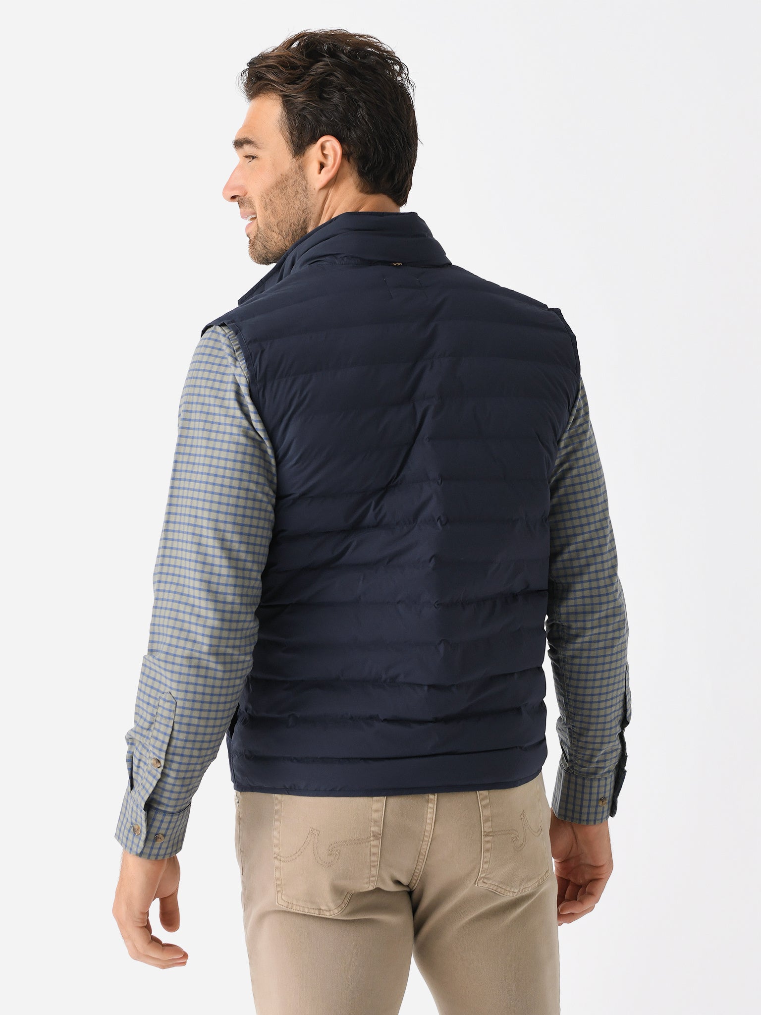 This outdoor-inspired vest features a water-resistant design with lightweight channel insulation and a hint of stretch for comfort.