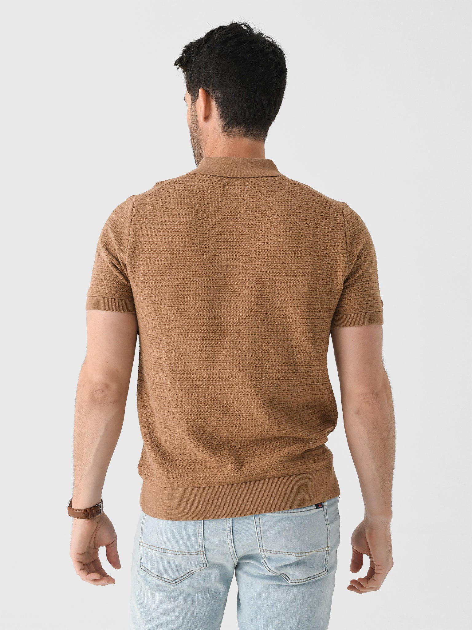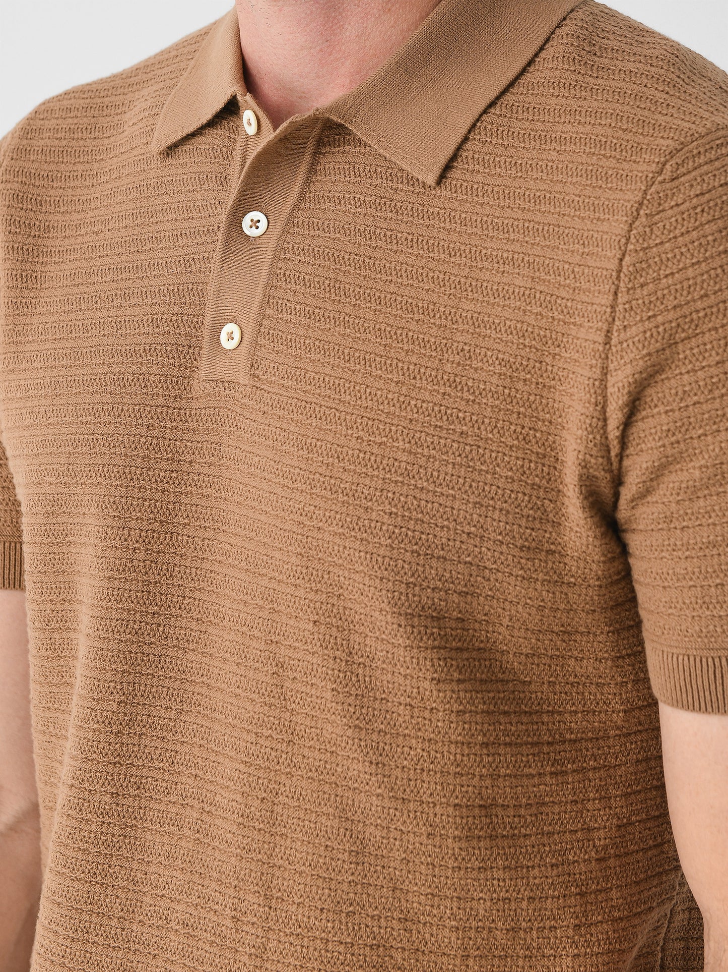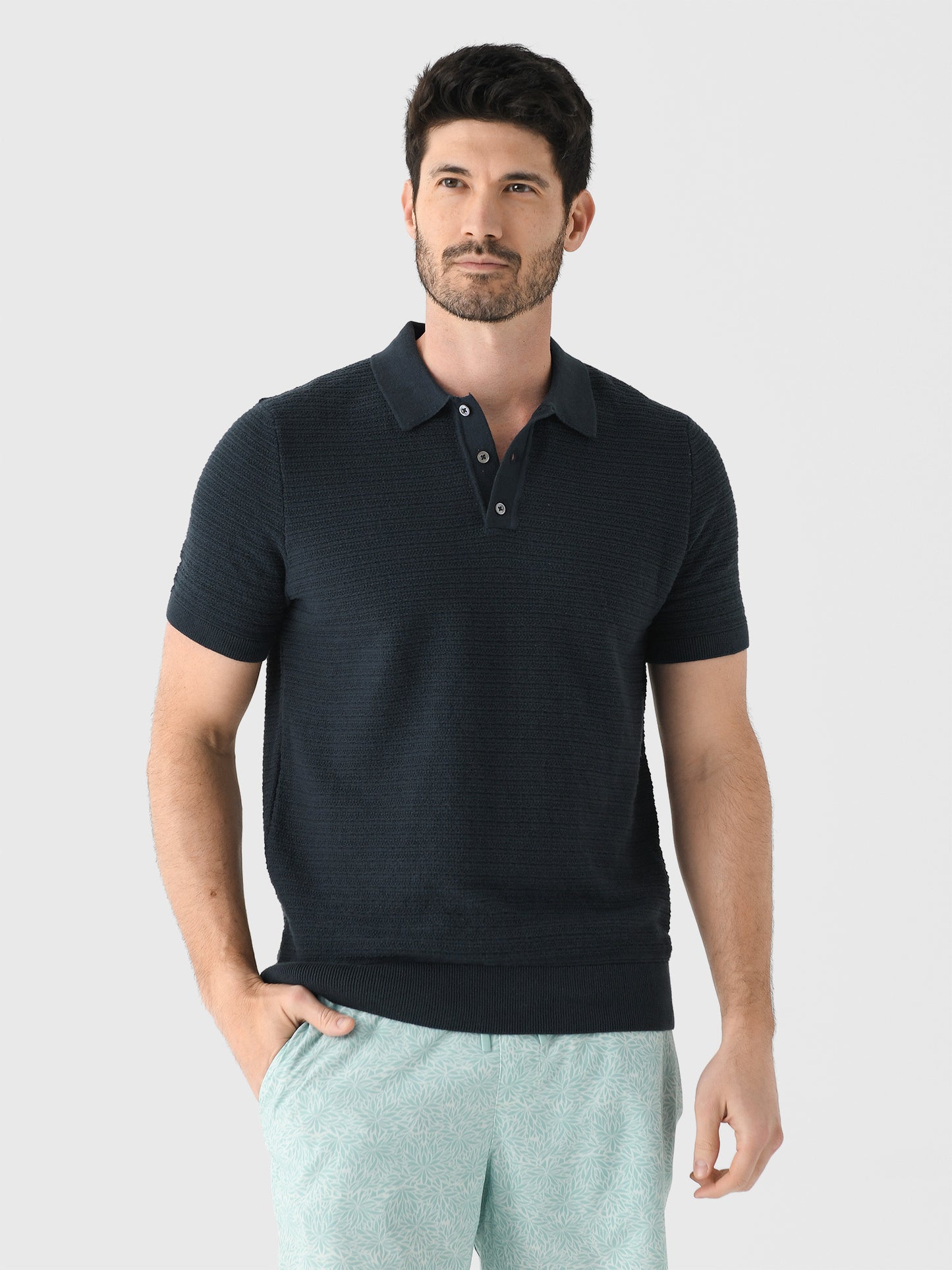 This unique polo is made from knit sweater material and is finished with trochus buttons.