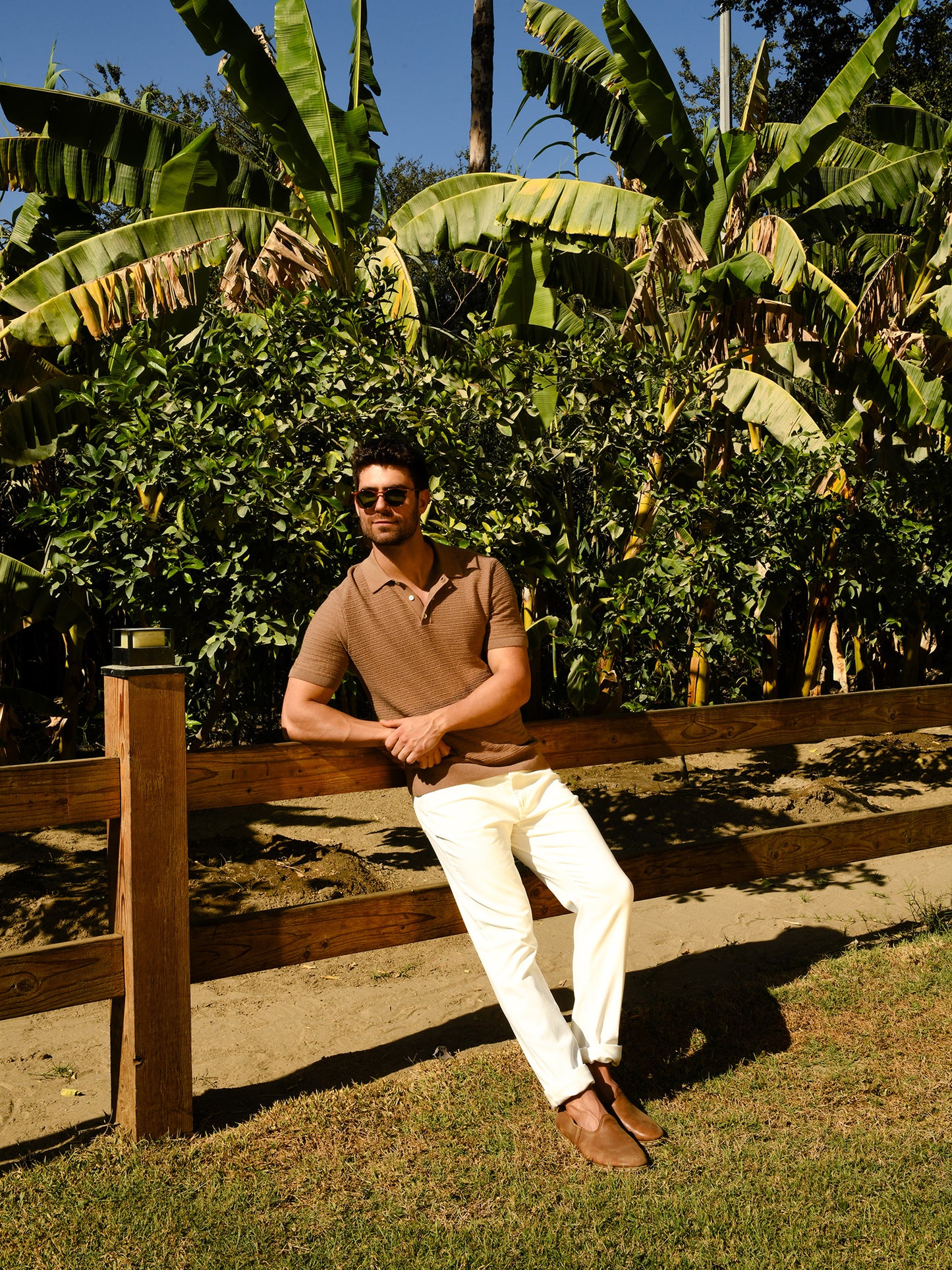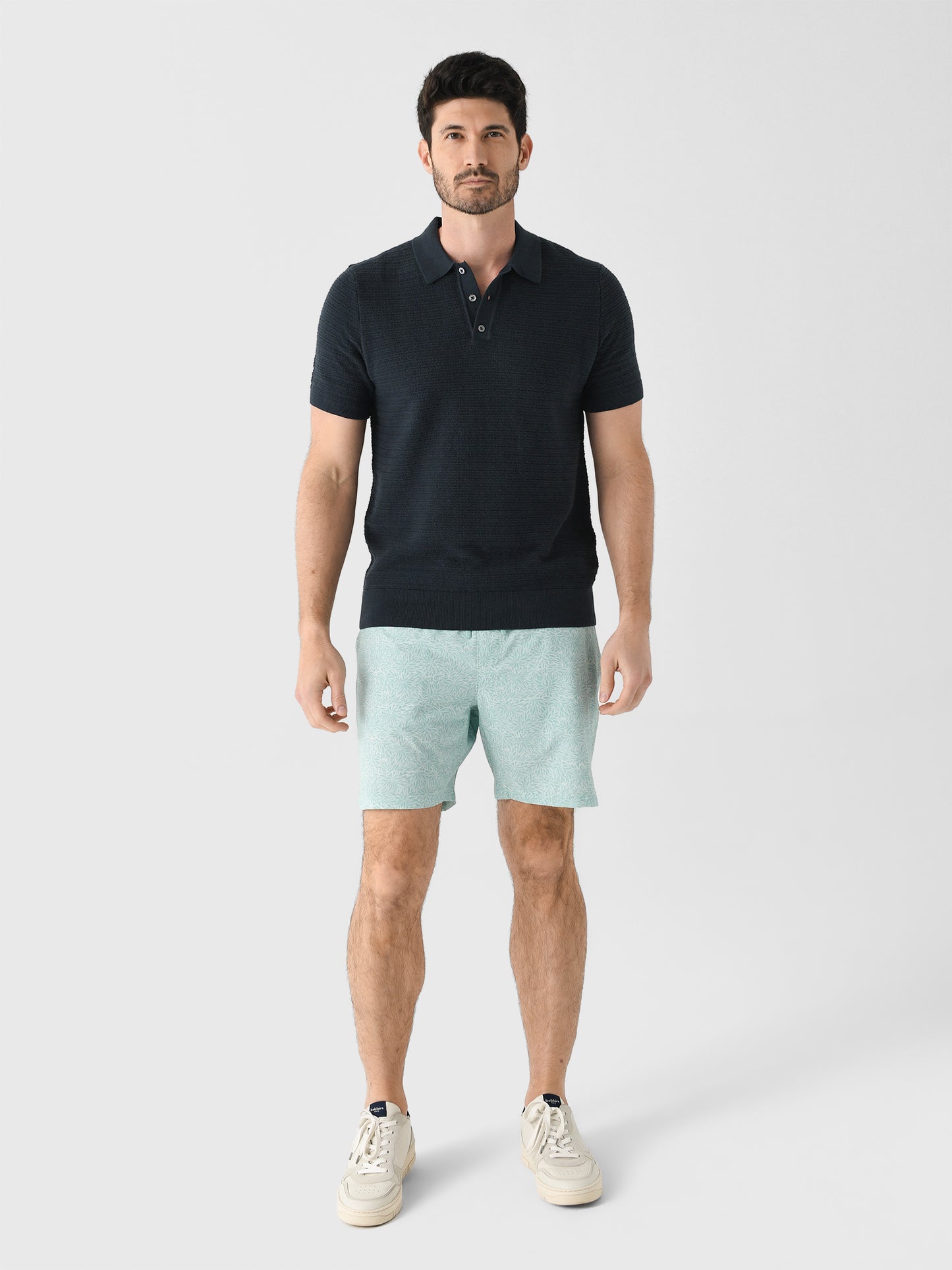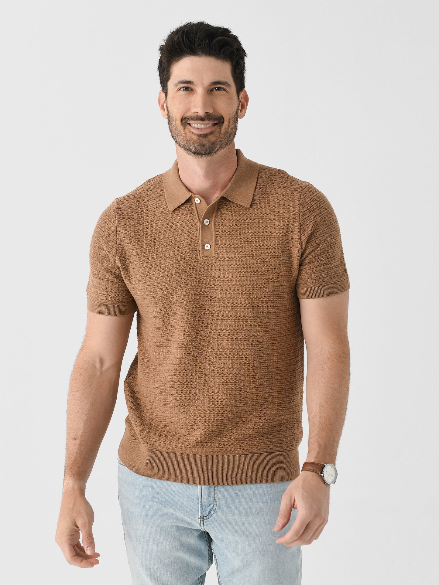 This unique polo is made from knit sweater material and is finished with trochus buttons.