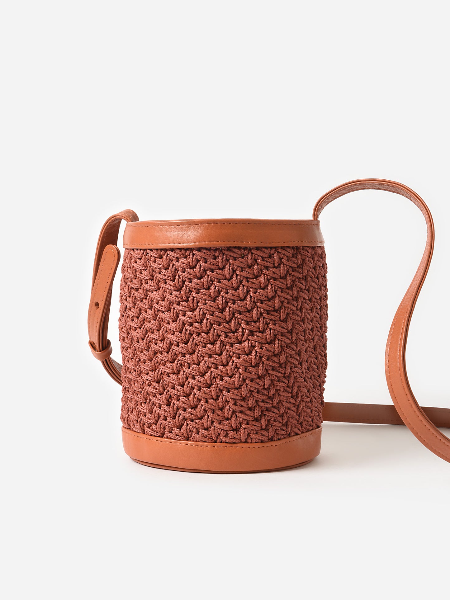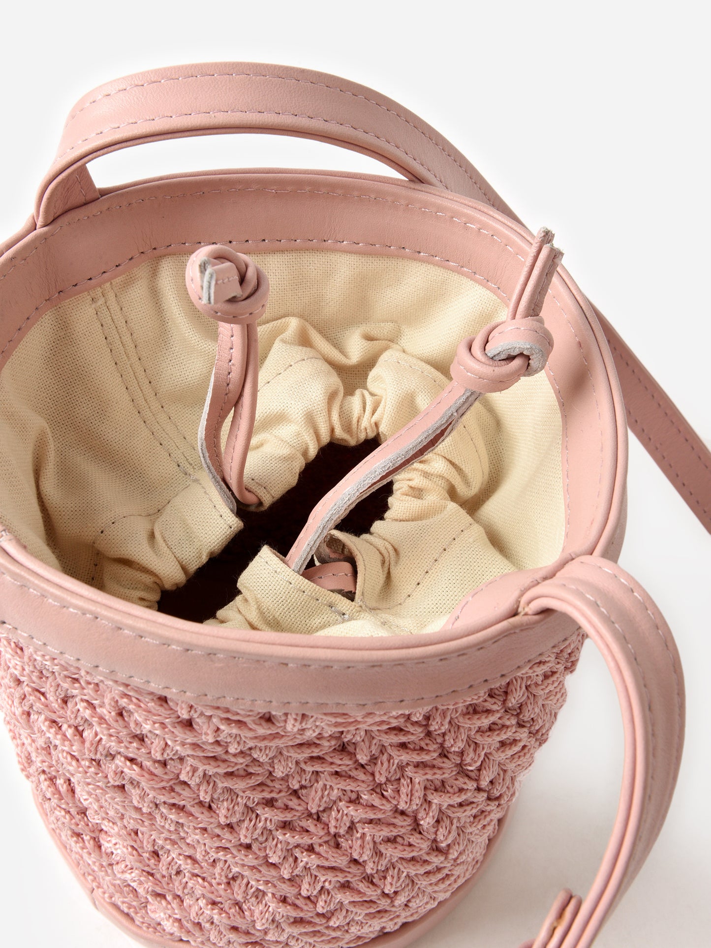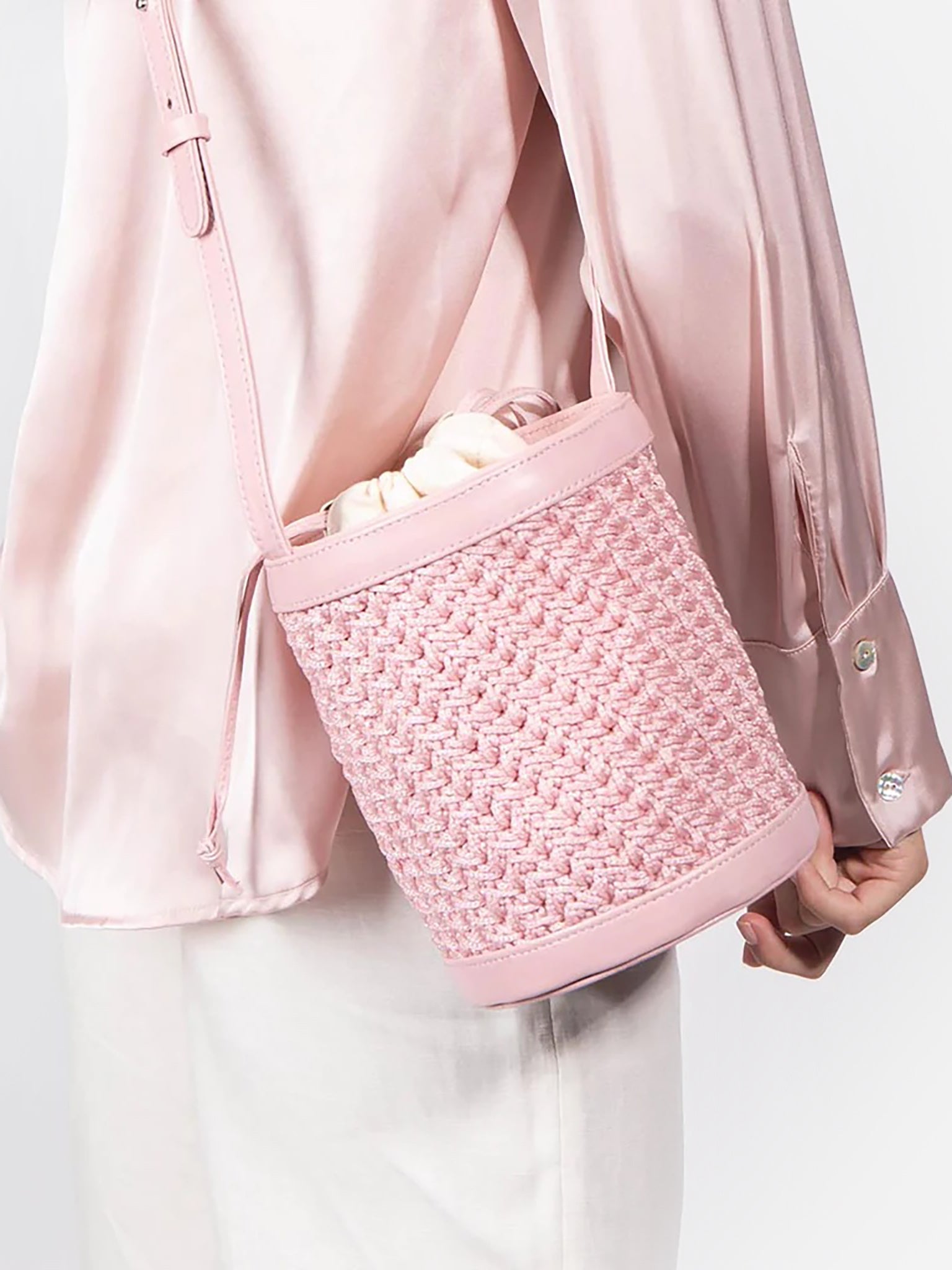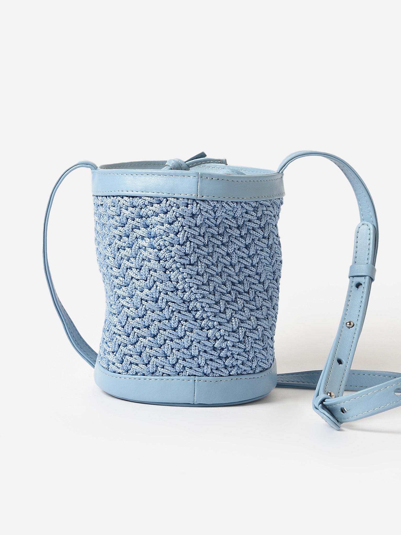 A woven bucket bag with a convenient drawstring liner and adjustable crossbody strap.