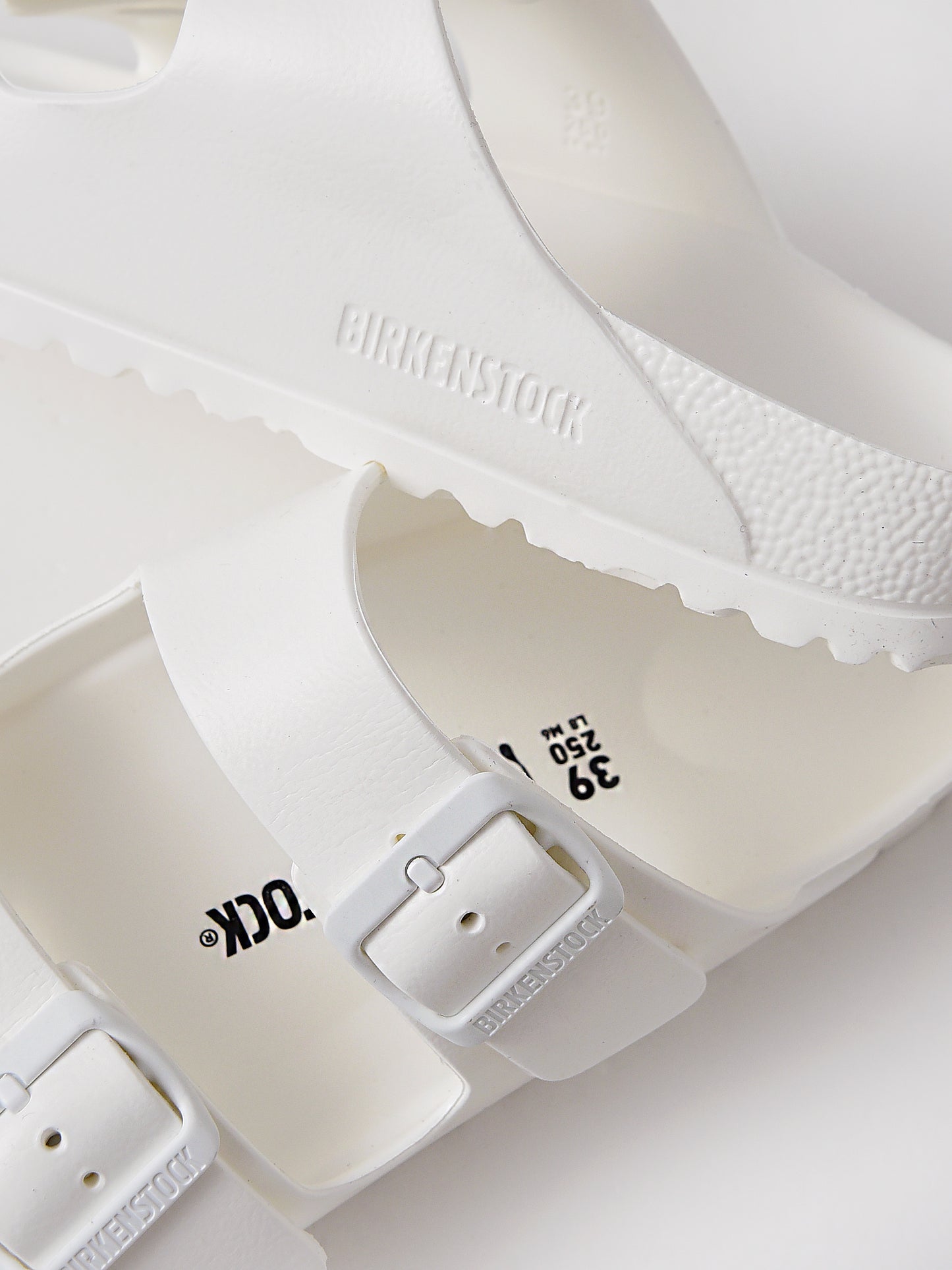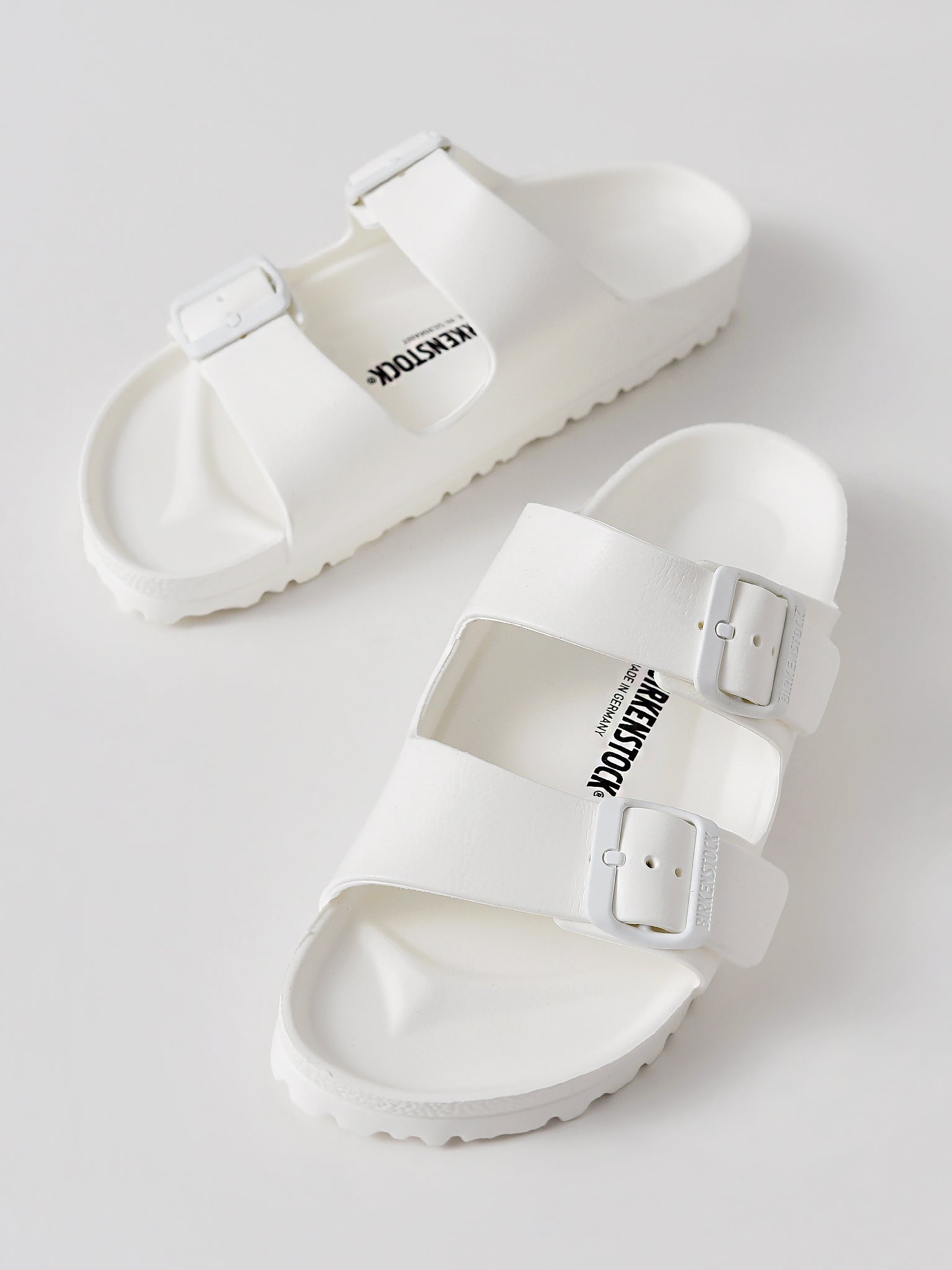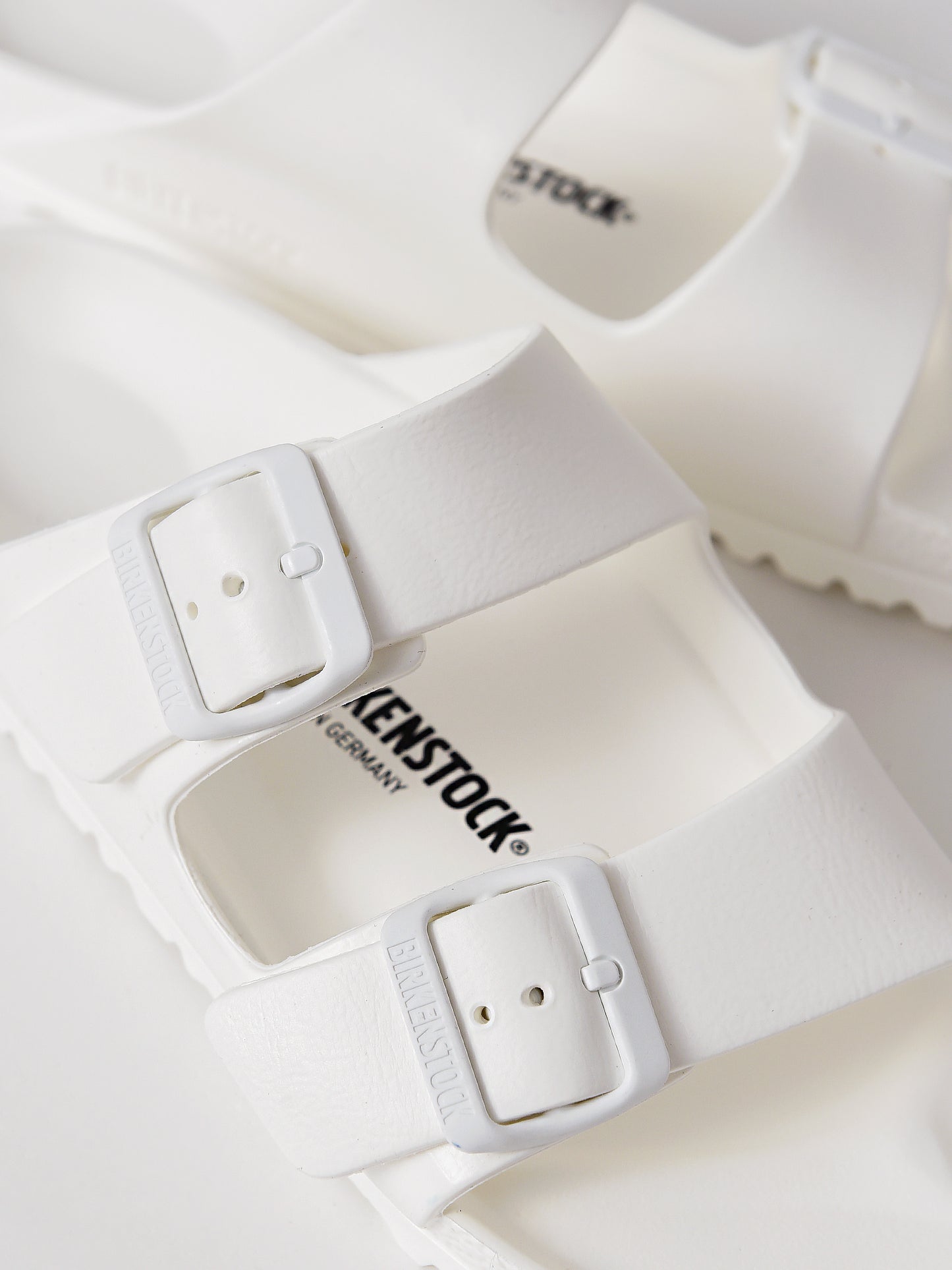 Classic white double-buckle sandal made from waterproof material.