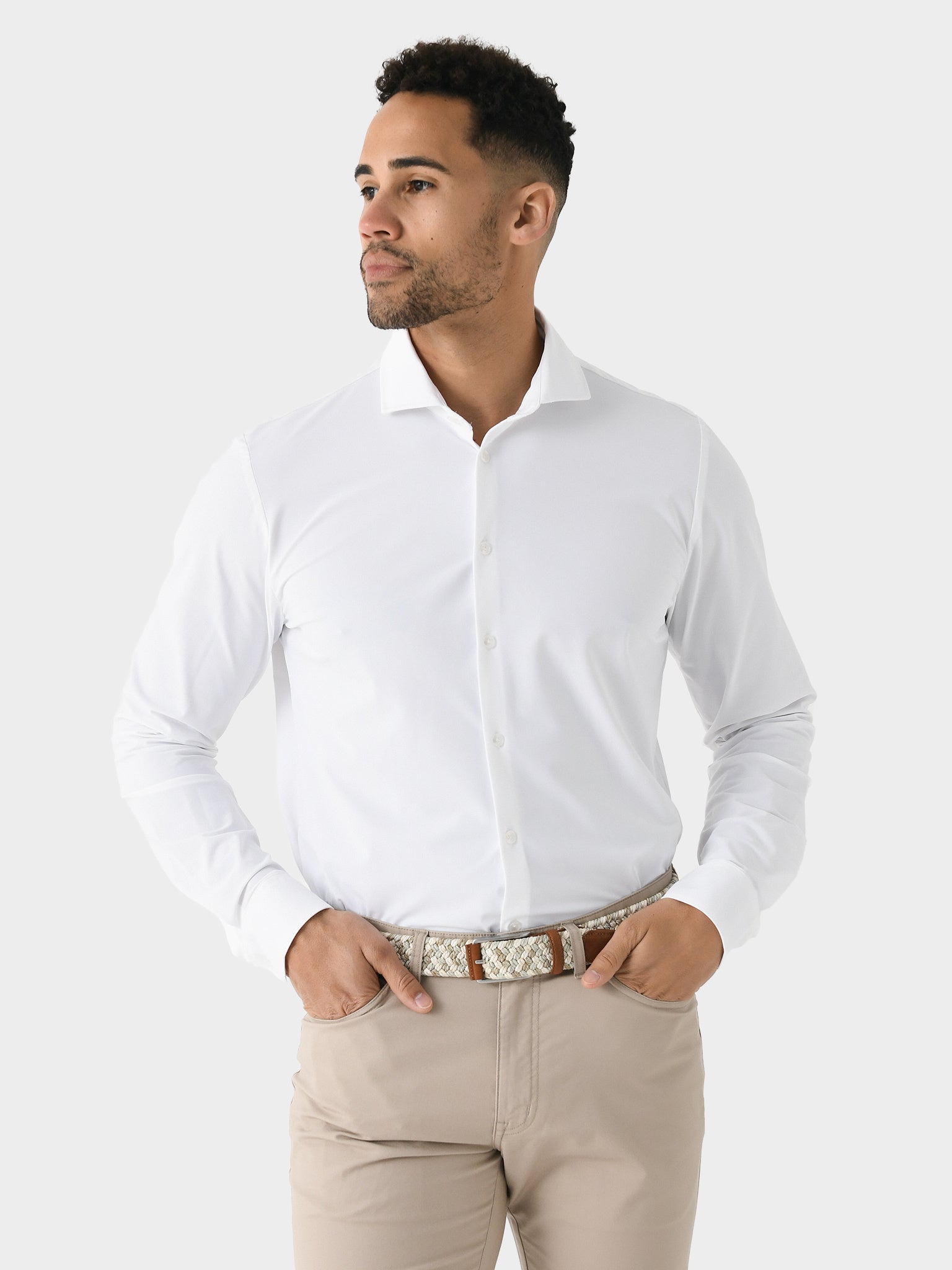 A long-sleeve button-down shirt constructed from soft performance knit jersey fabric.