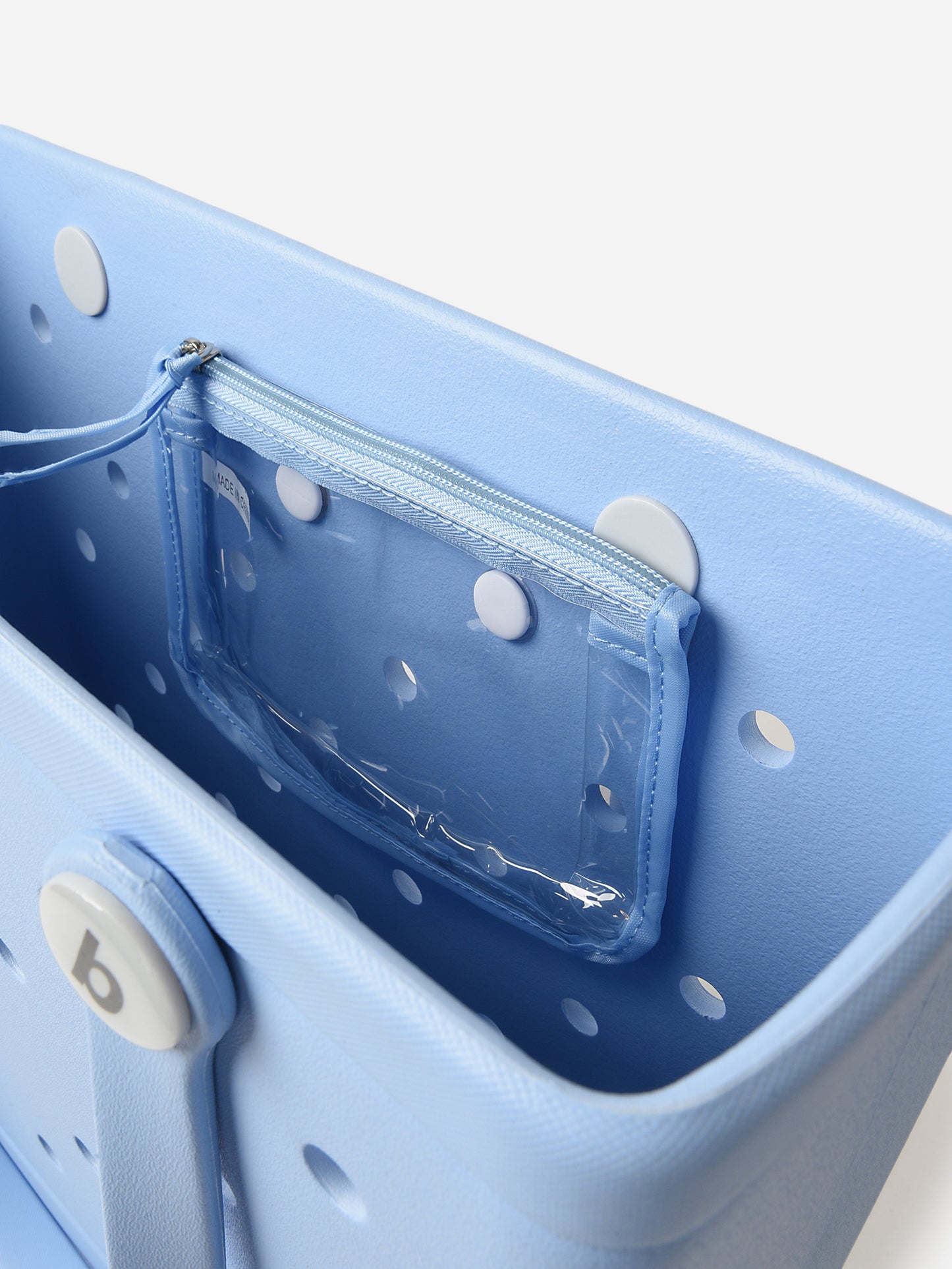 A baby blue tote bag with a durable, tip-proof design and washable construction.