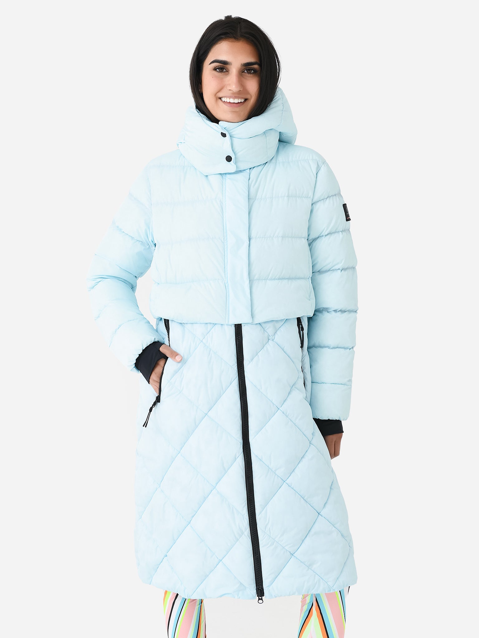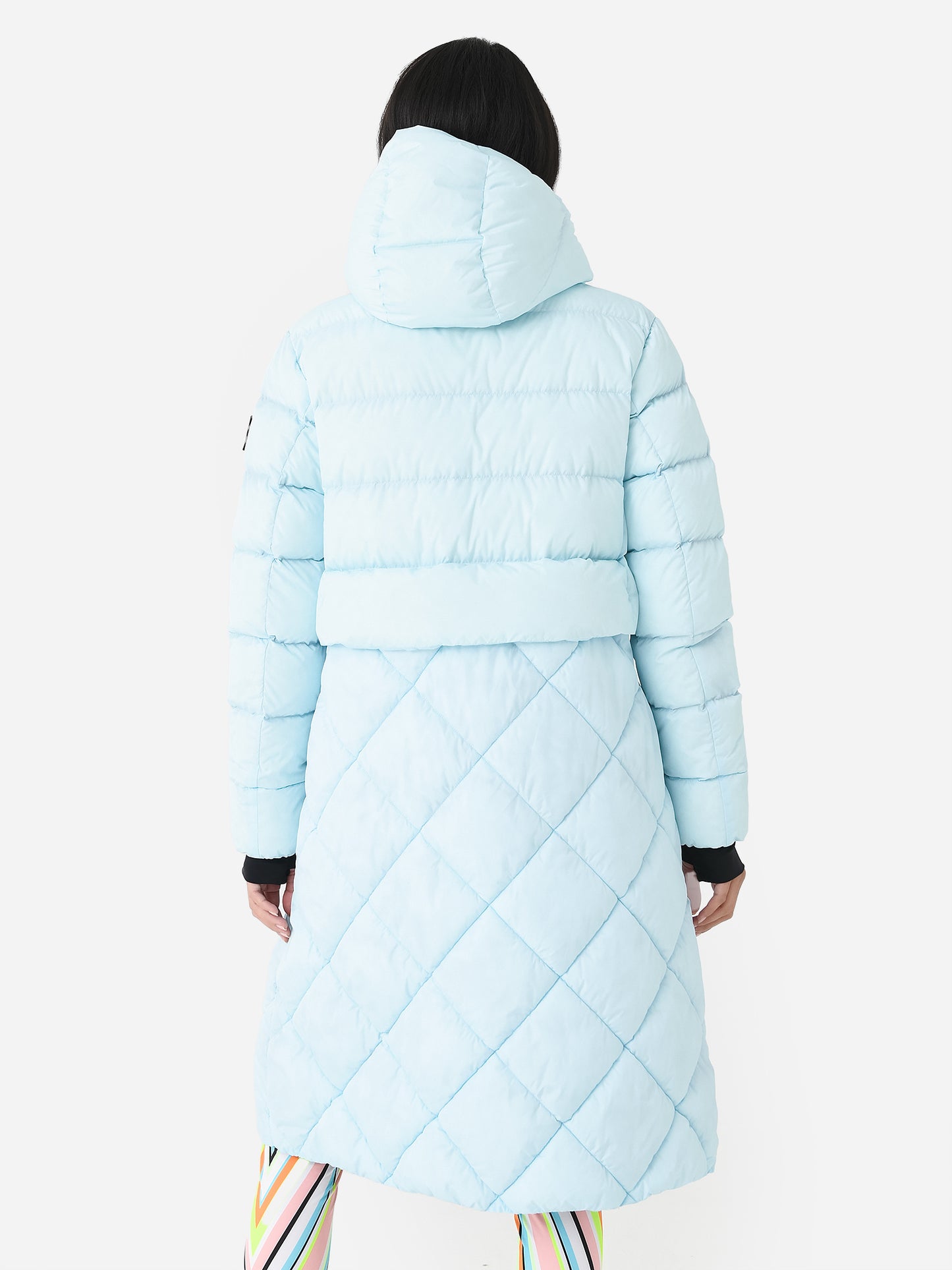 A long coat with a layered design and filled with duck down and recycled technical fibers.