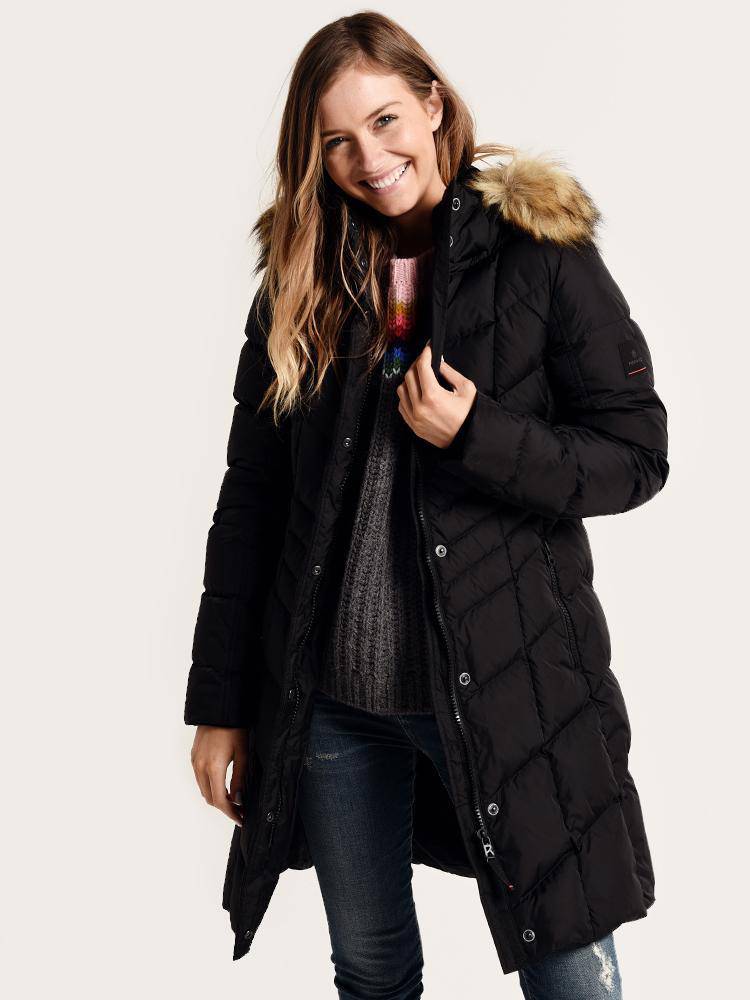 - Synthetic-filled down coat designed with diagonal quilted chambers to ensure unrestricted mobility.