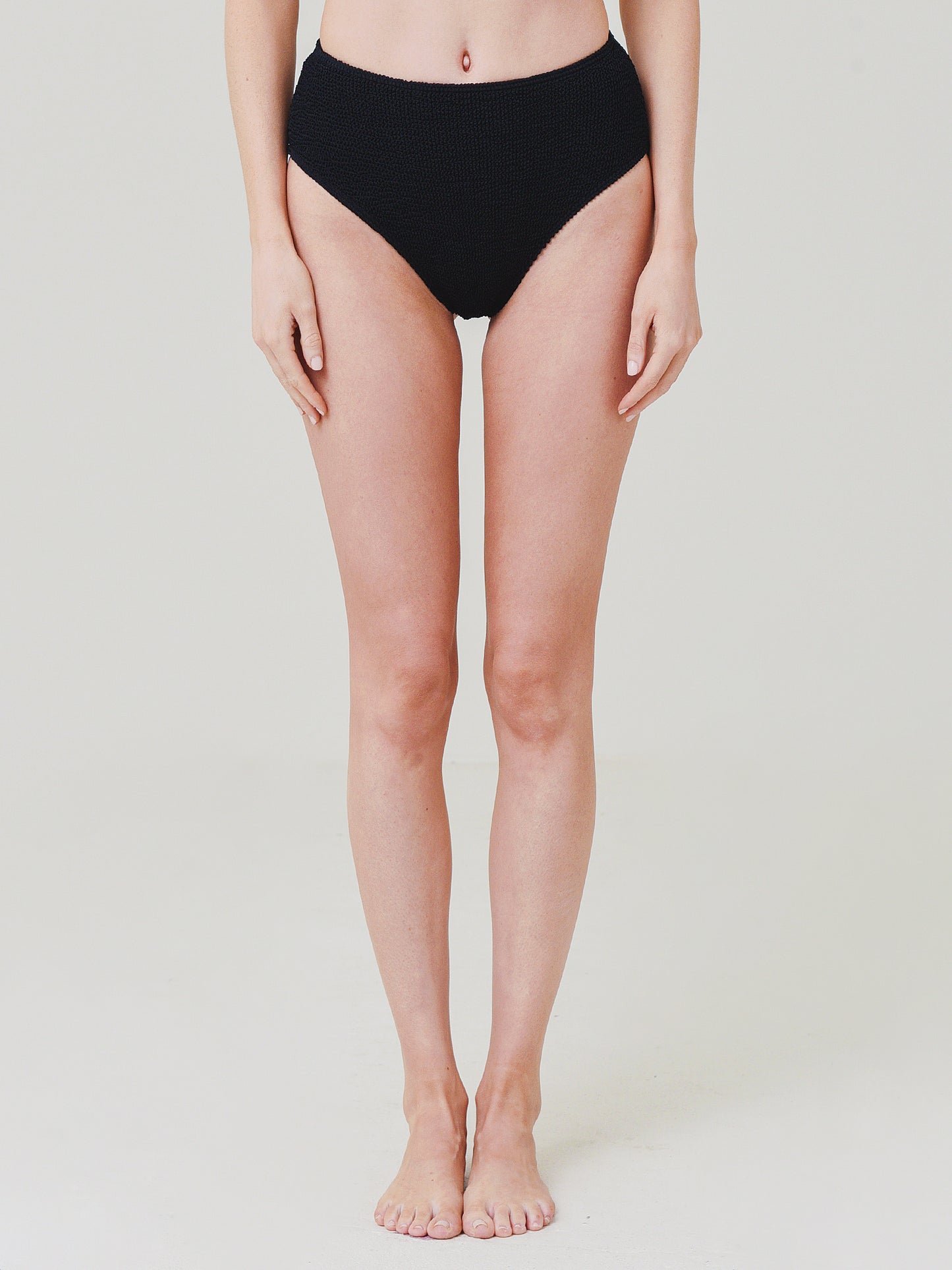 High-waisted brief bikini bottom constructed from a tubular fabrication with adjustable coverage.