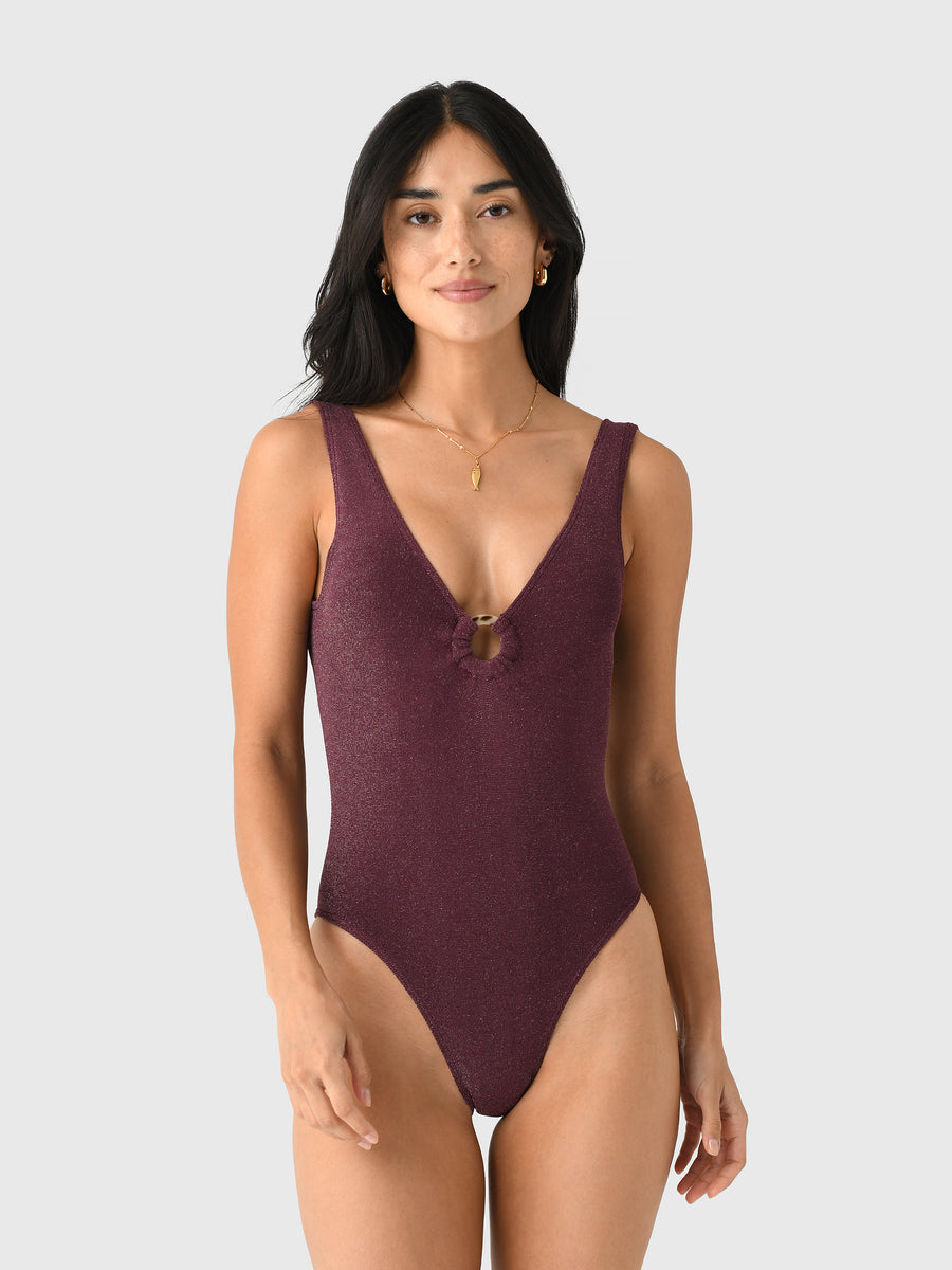 The Mara One-Piece offers a chic, textured look thanks to its construction in unique shimmer crinkle lurex. The sophisticated silhouette is defined by a deep V-neckline in the front and a stylish low scoop back.