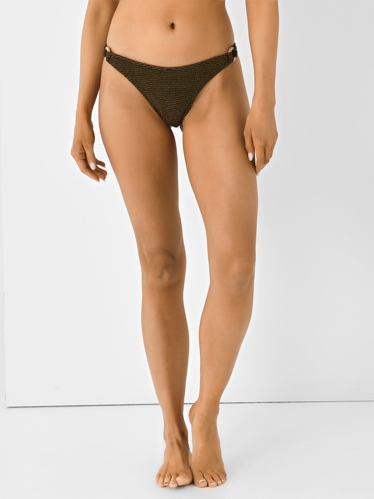 A soft crinkle bikini bottom with adjustable coverage and recycled shell ring details.