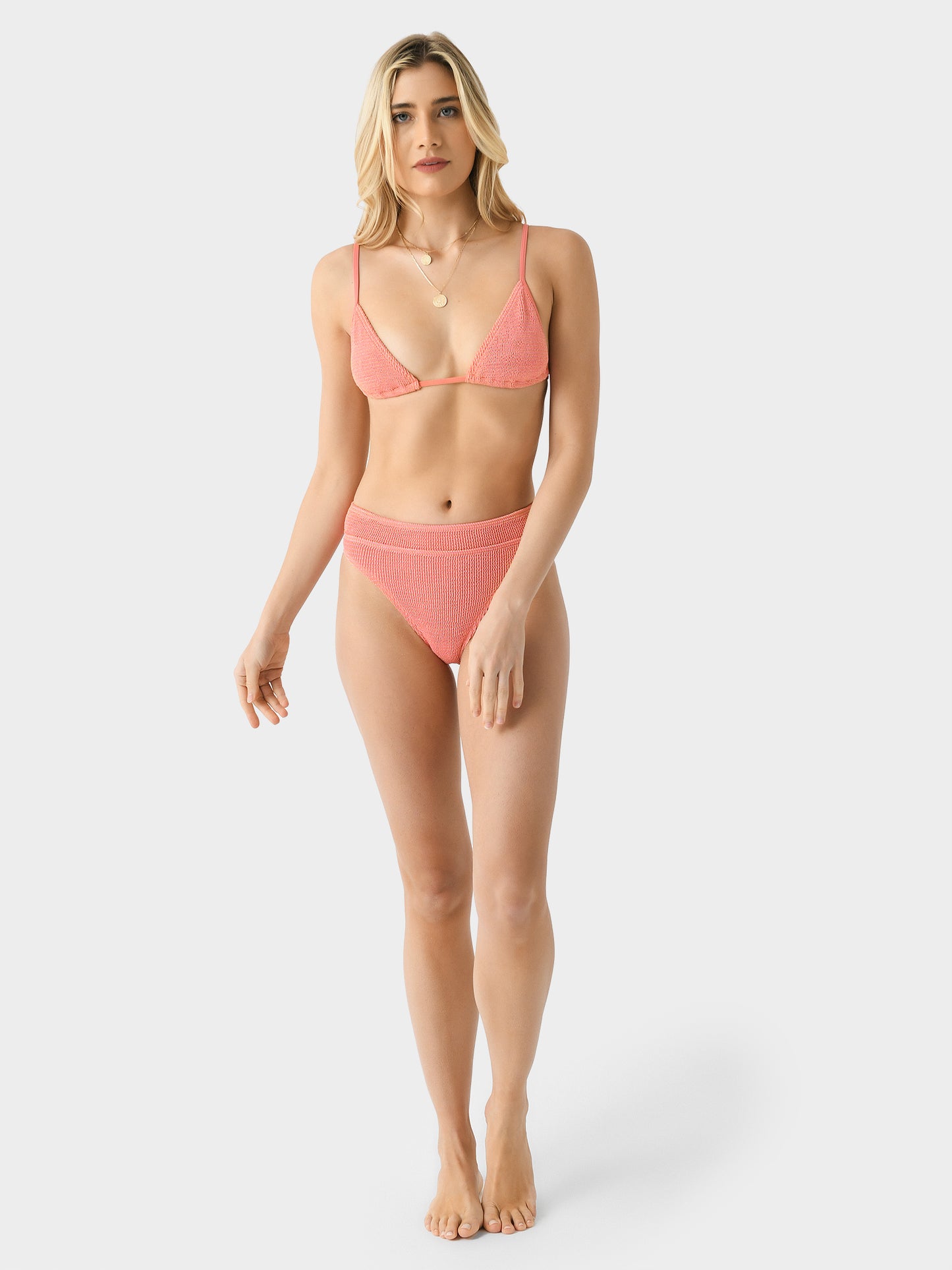 A cheeky high-waisted bikini bottom made from stretchy crinkle fabric.