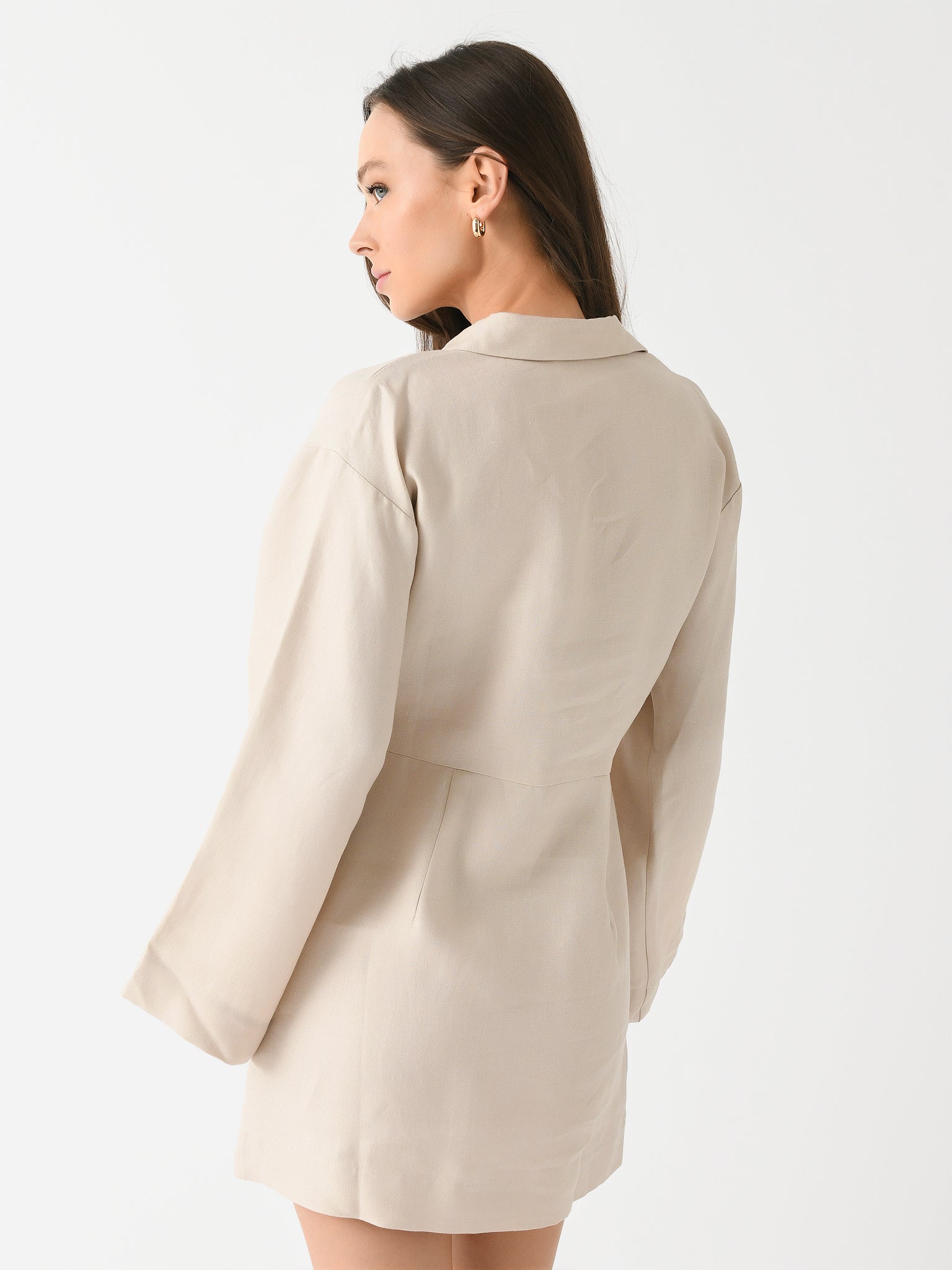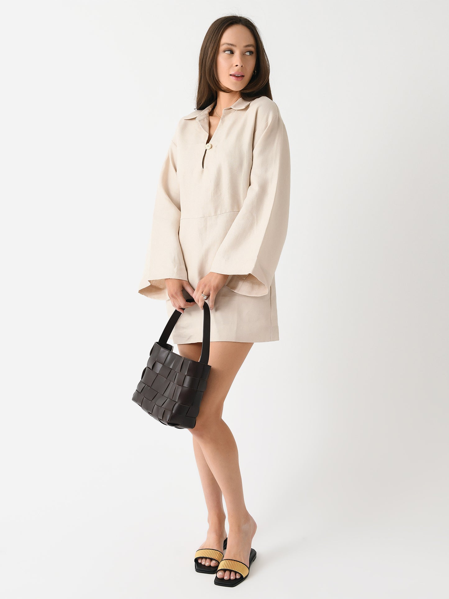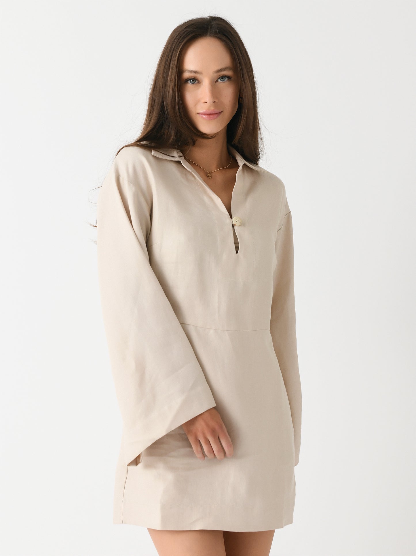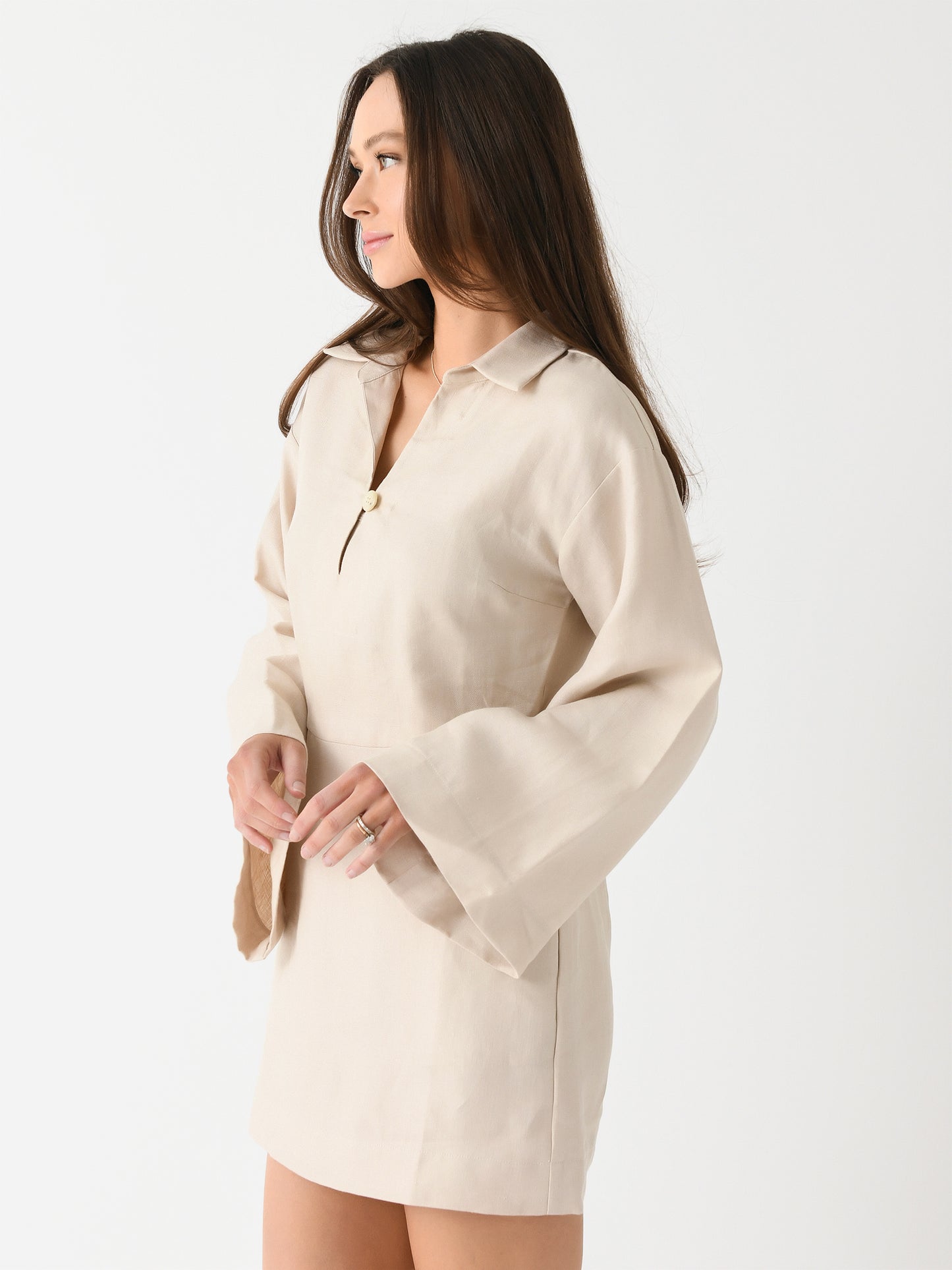 A mid-weight linen dress with a button neckline and wide, draped sleeves.