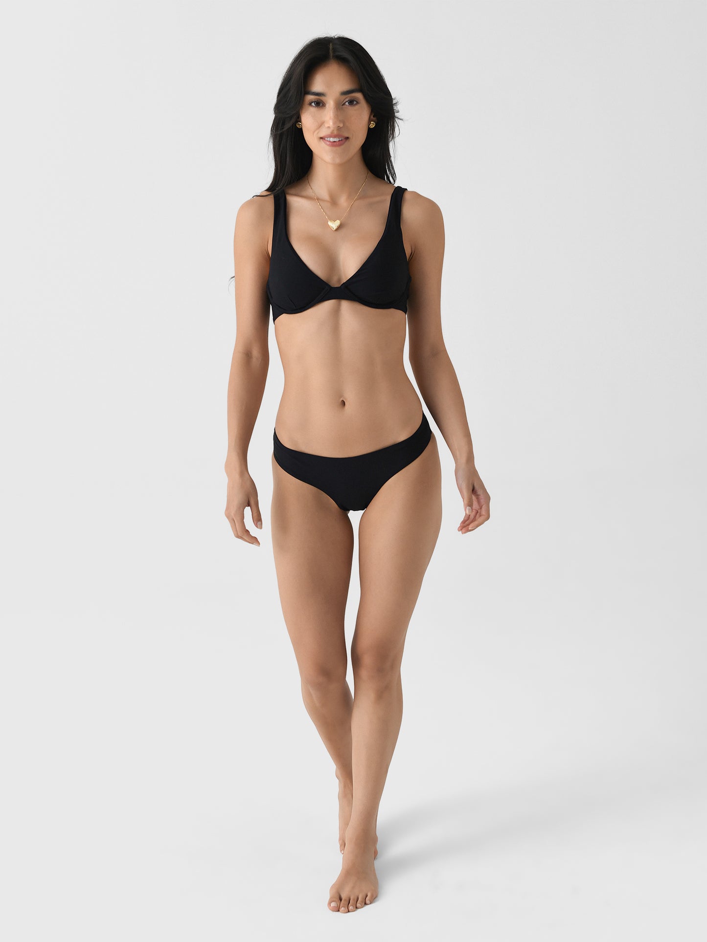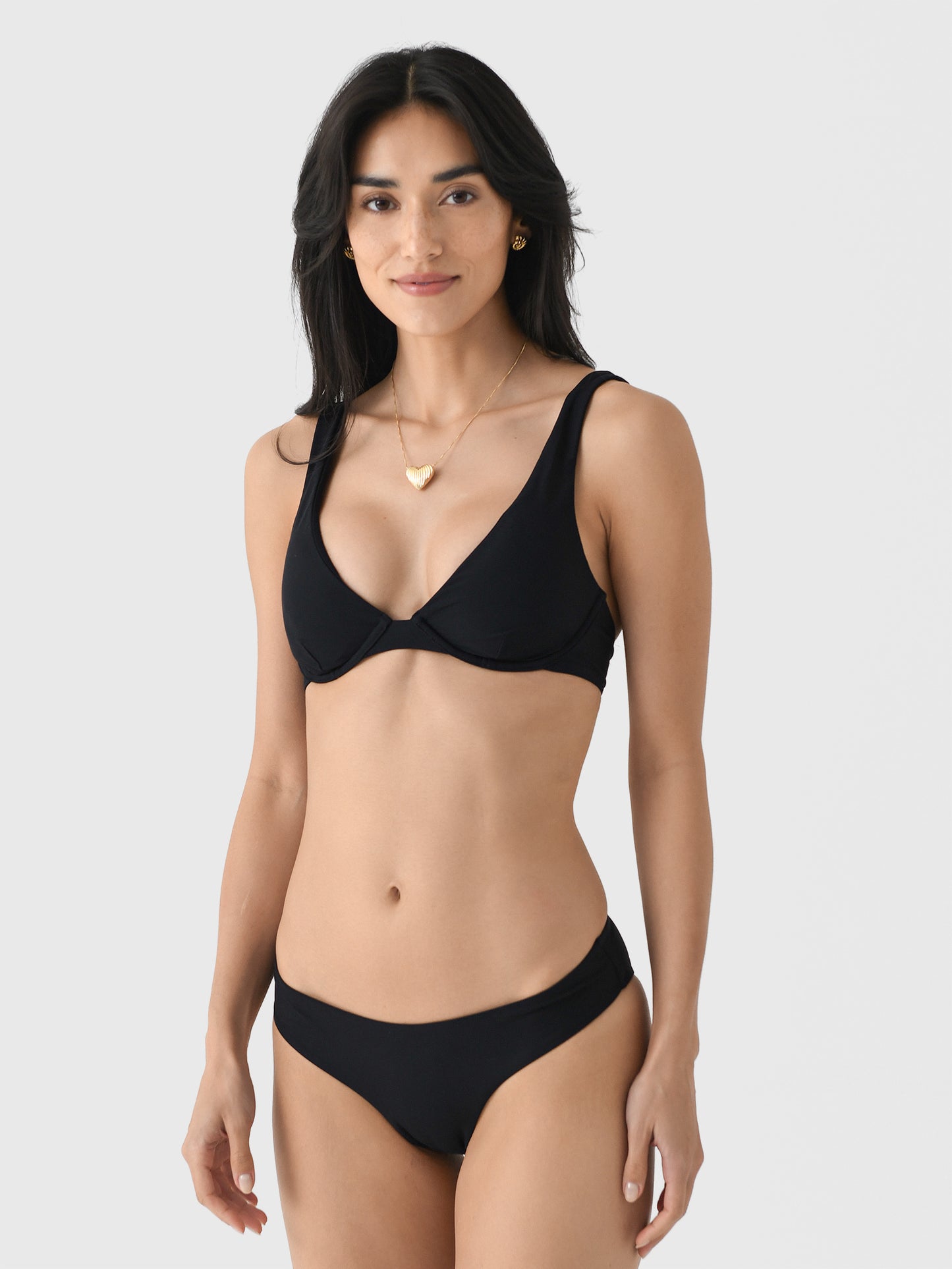 This sleek bikini top features a flattering v-neckline, supportive underwire, adjustable slim shoulder straps, and a back clasp closure.