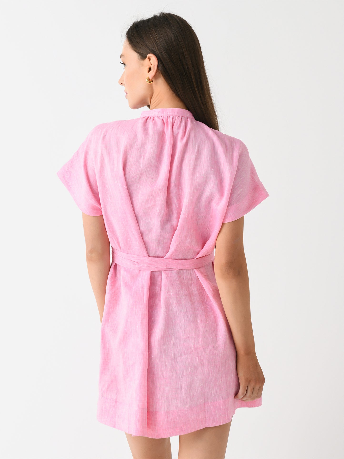 Linen shirt-style dress with a pleated bodice, a partial placket, and a self-tie belt.