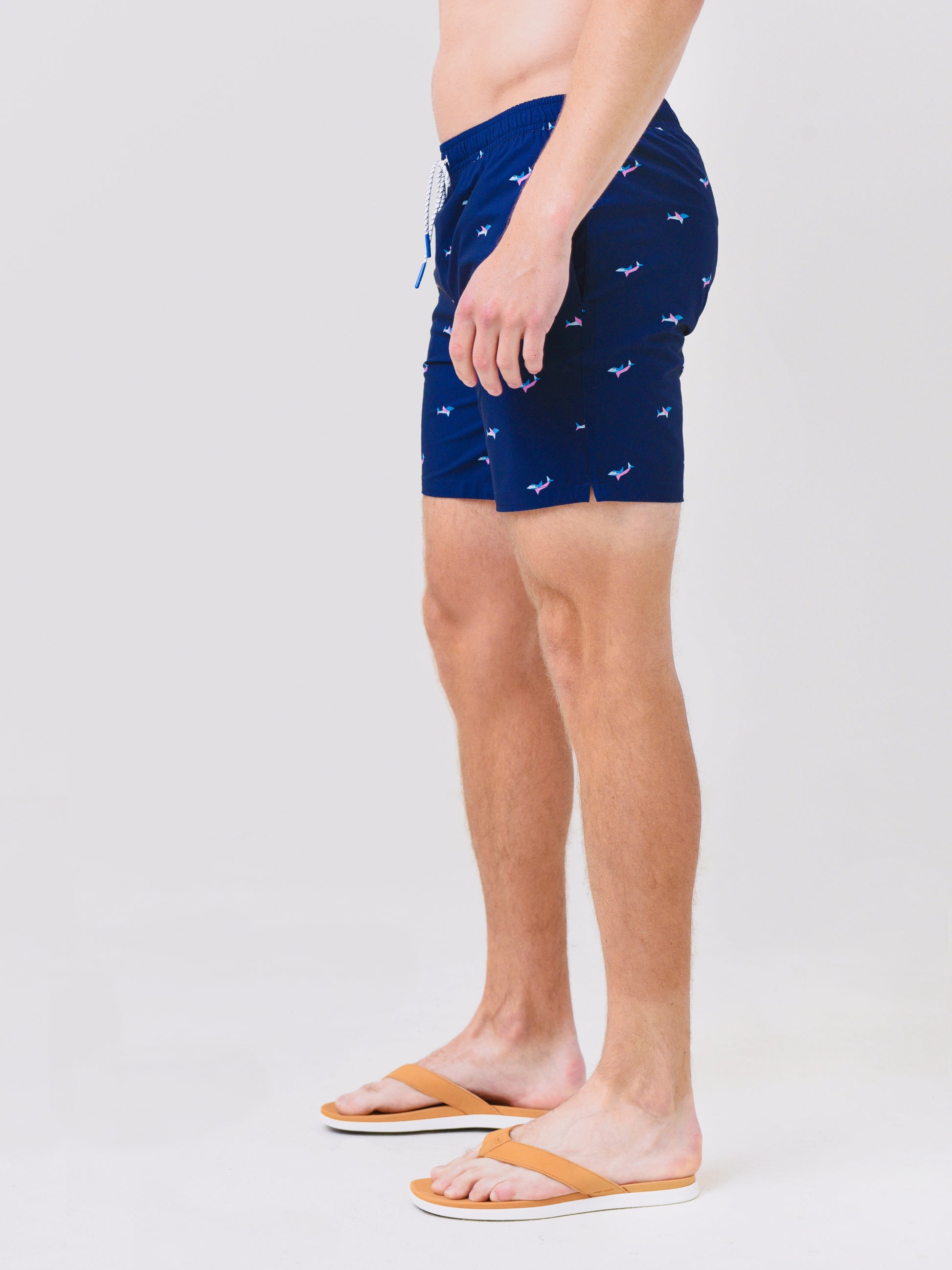 Swim trunk with an elastic waistband and mesh brief liner in a fun novelty print.