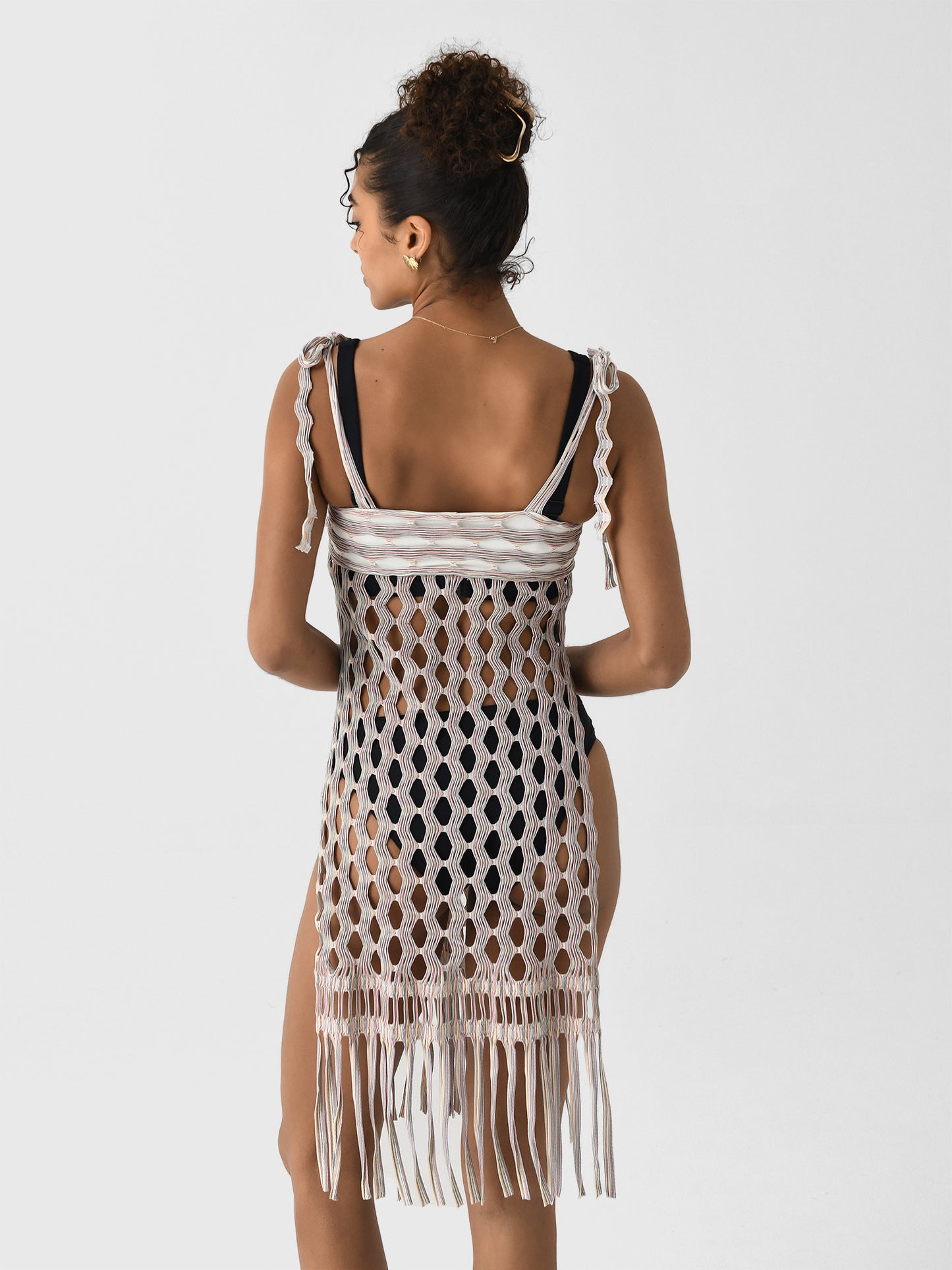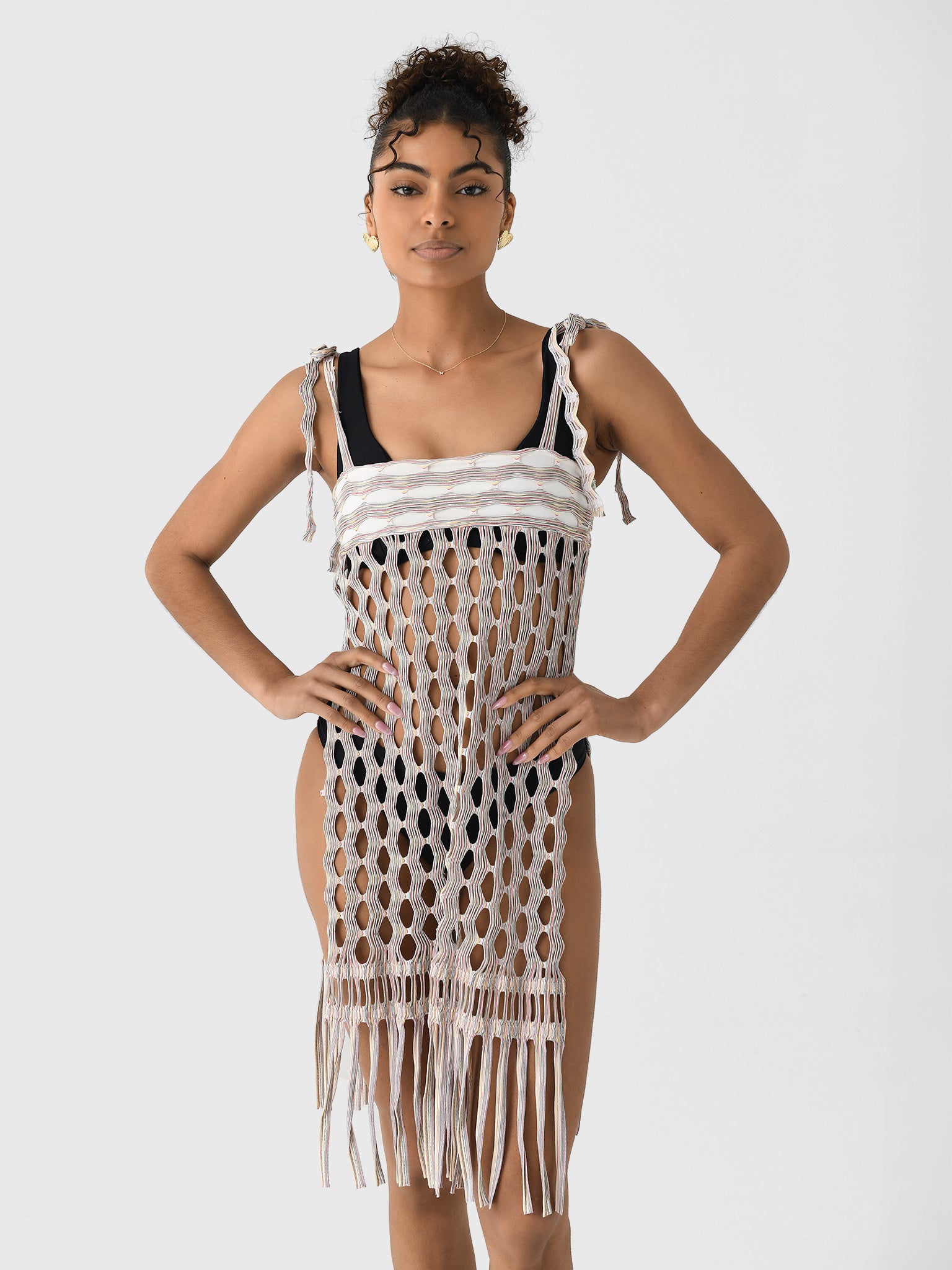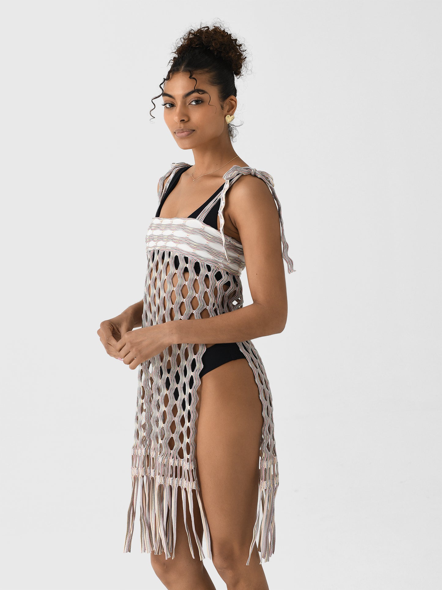 This swim cover-up is made from open-knit jacquard fabric and features elf-tie straps and a fringe hem.