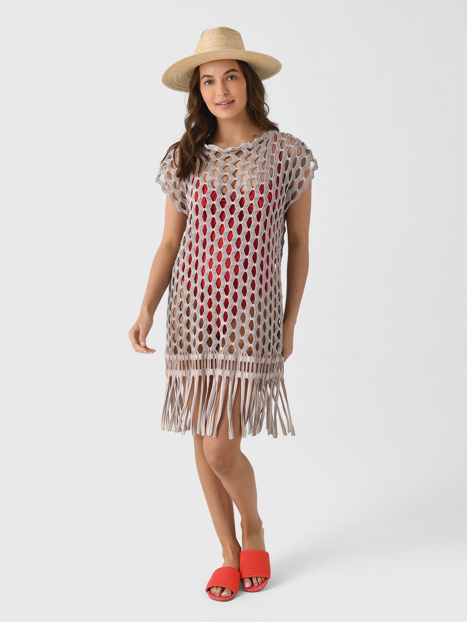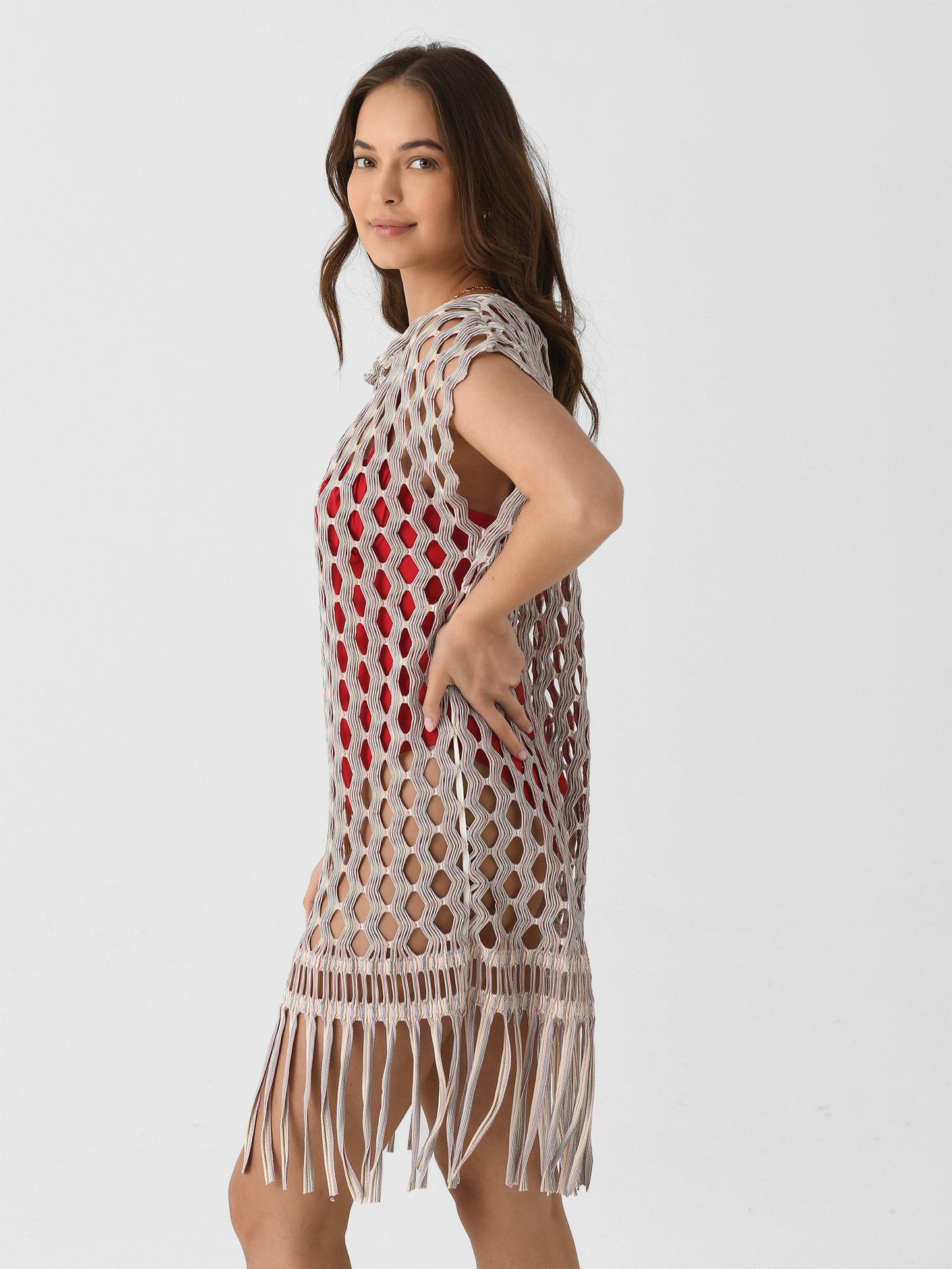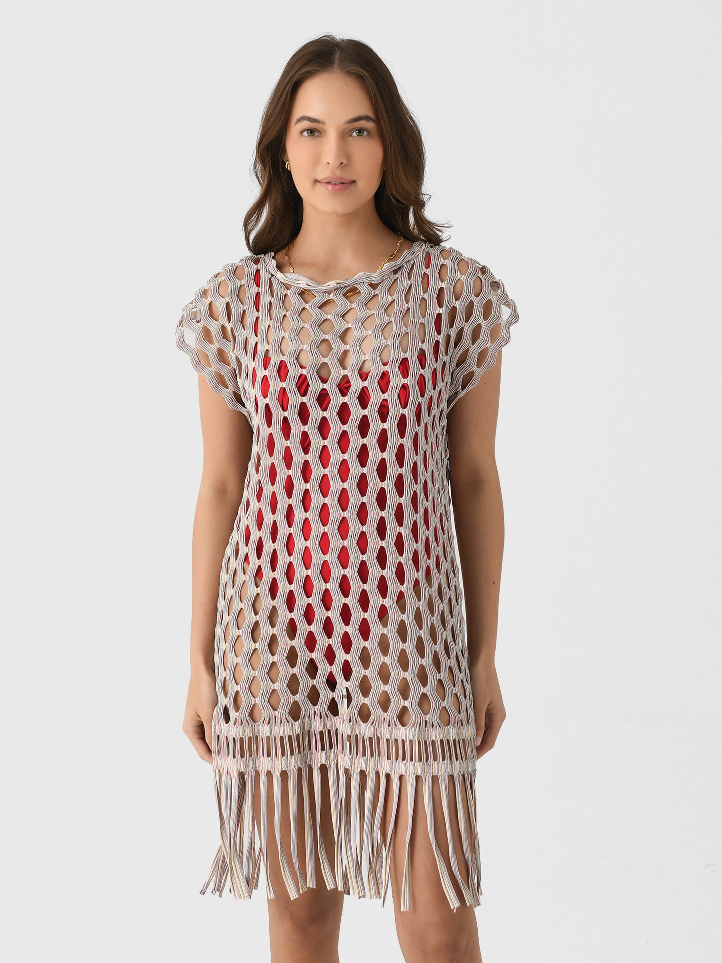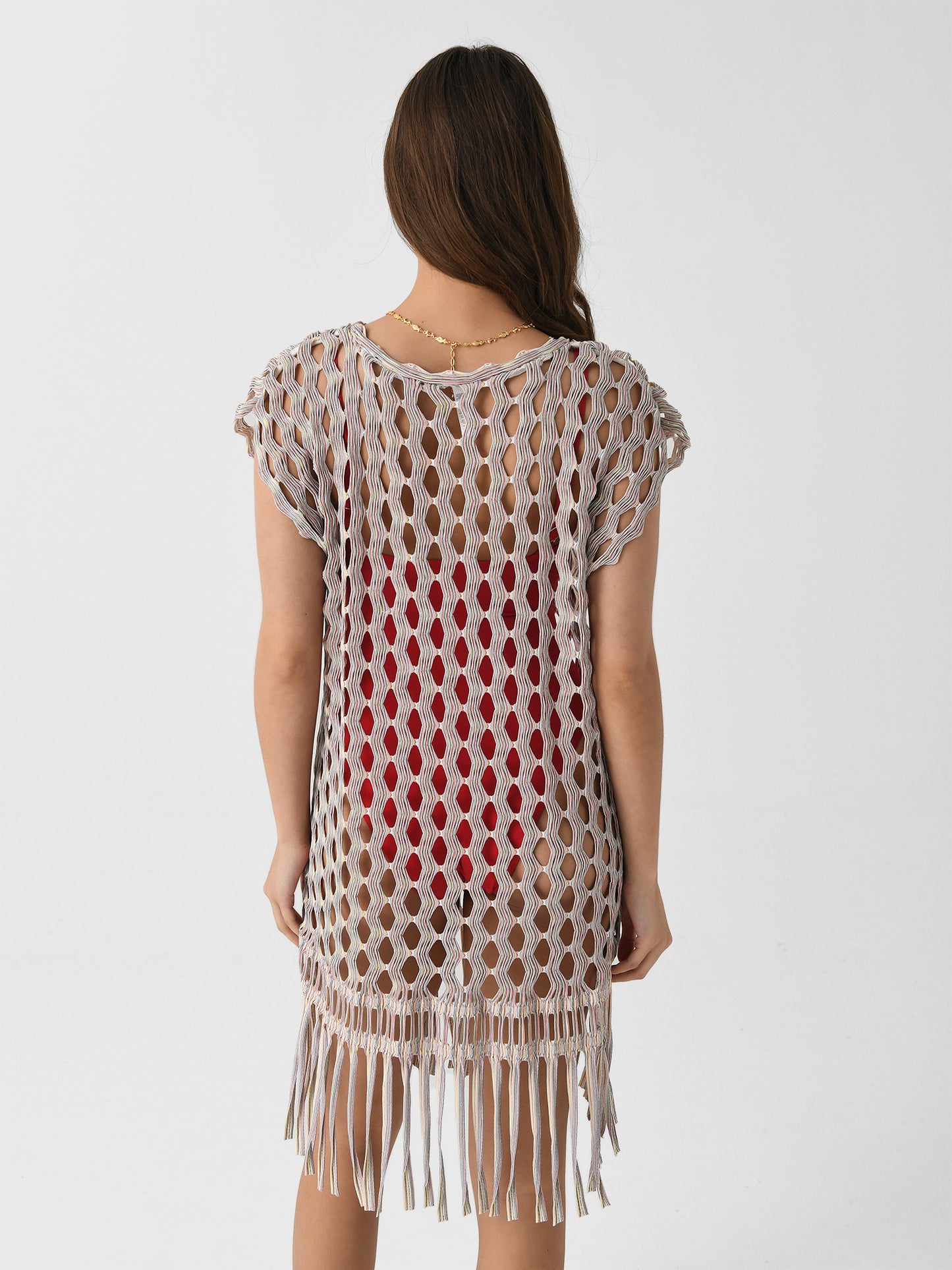 This sheer swim cover-up is made from open-knit jacquard fabric and features a swingy silhouette and fun fringe hem.