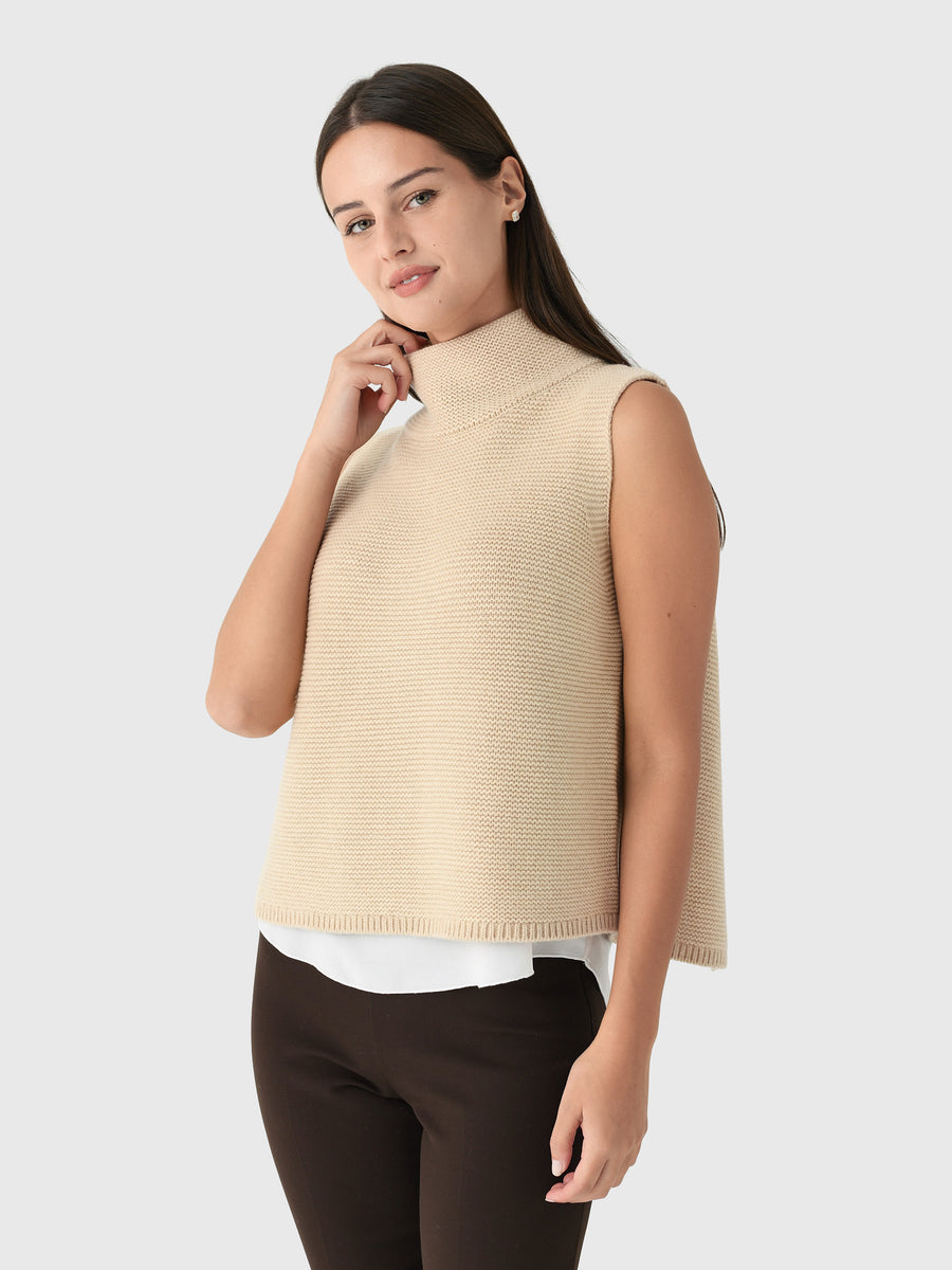 Funnel Neckline Sleeveless Back Overlap Split Ribbed Hem Shirting Detail Knit Fabrication 65% Baby Wool, 25% Yak, 10% Cashmere Classic Fit Model is wearing size Small top. Model's Measurements: Height: 5'10" | Bust: 32B | Waist: 24.5" | Hips: 35" | Dress Size: 2 (US)