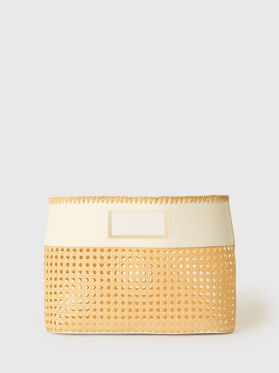 A mini tote bag made from woven rattan with enough space for all the essentials.