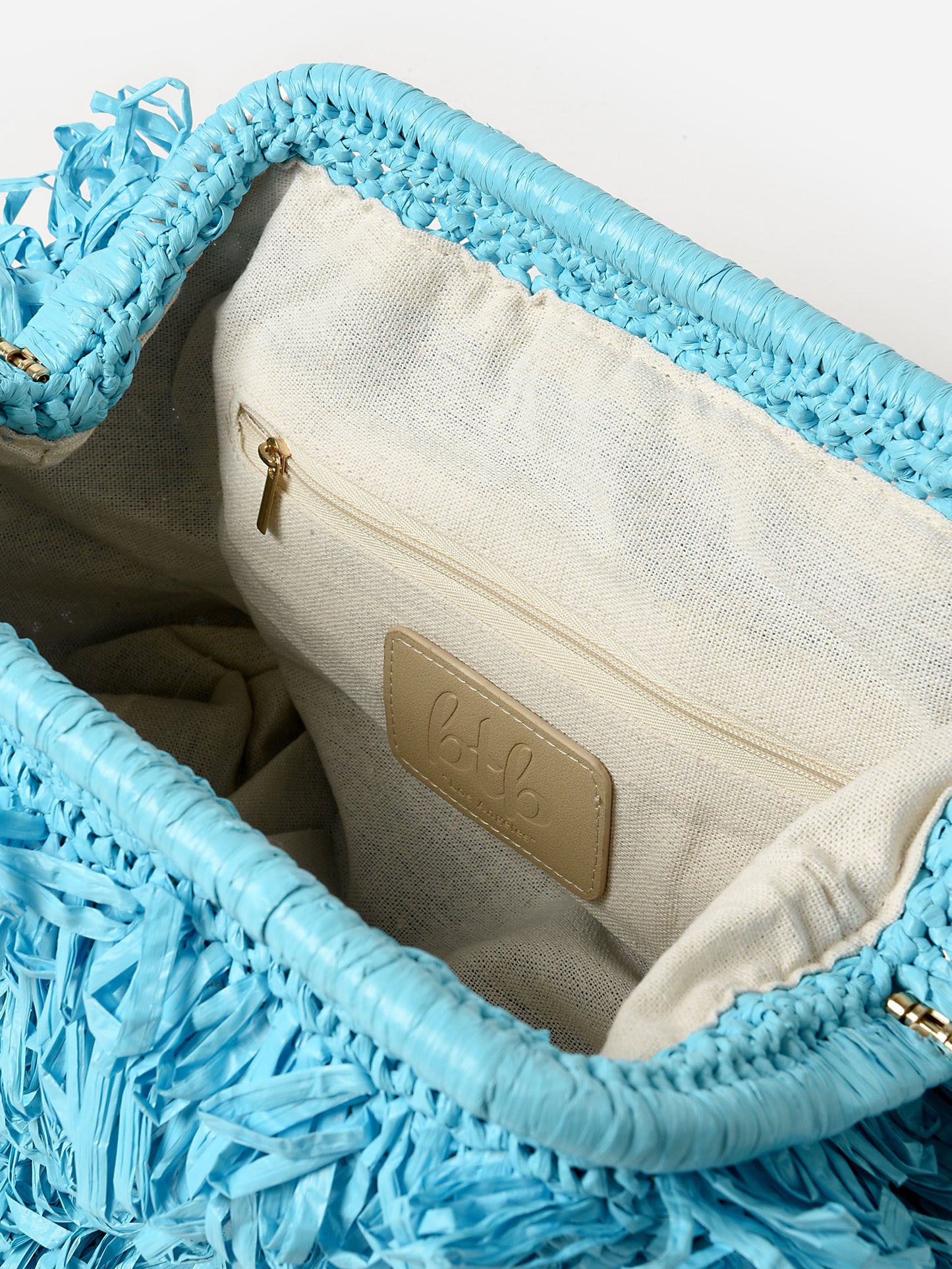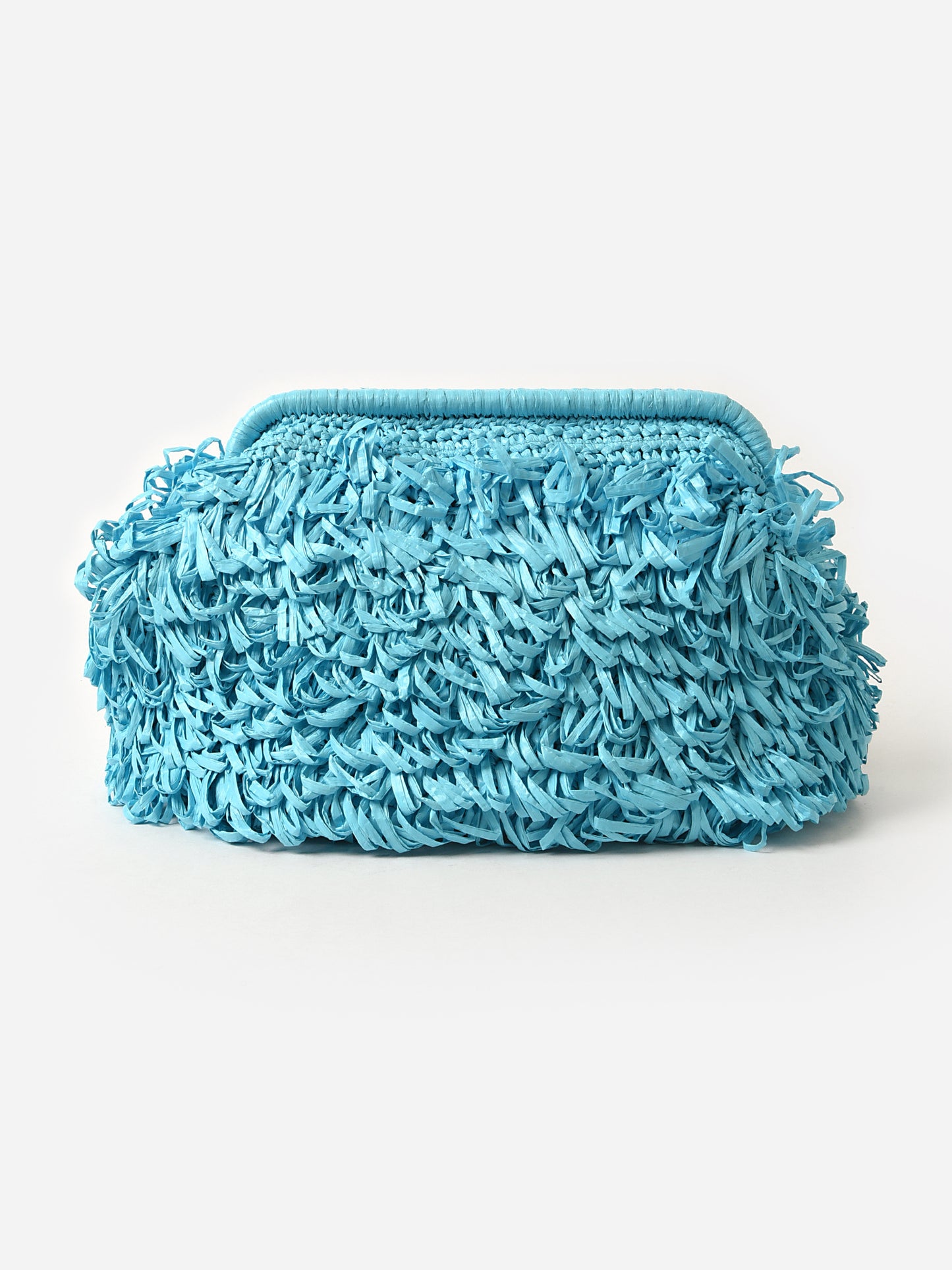A frame clutch with fringe detailing made from a raffia and straw blend.