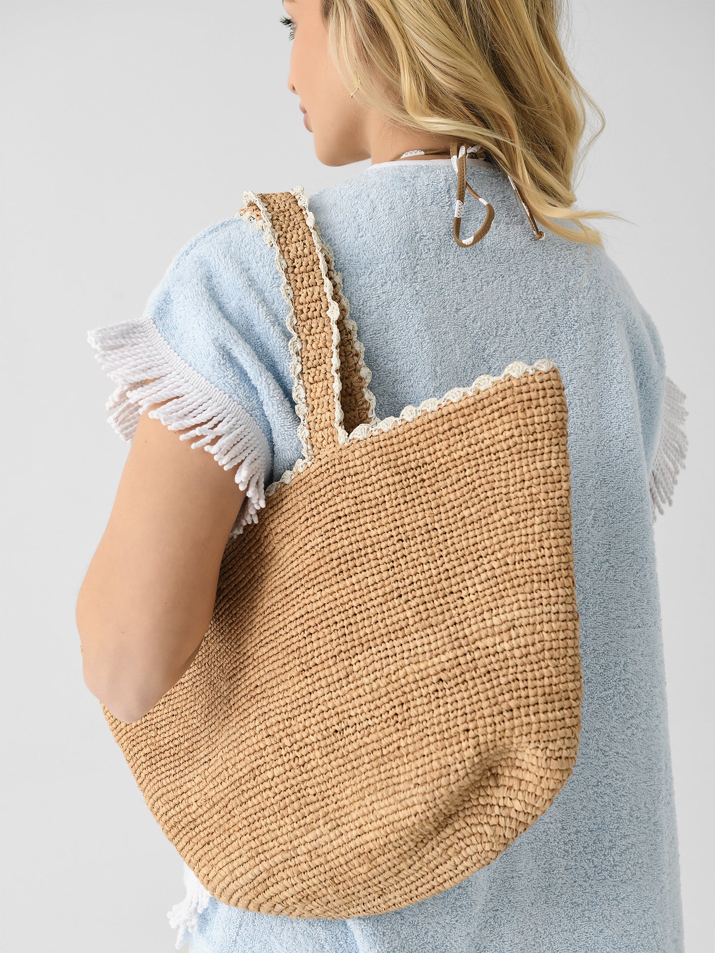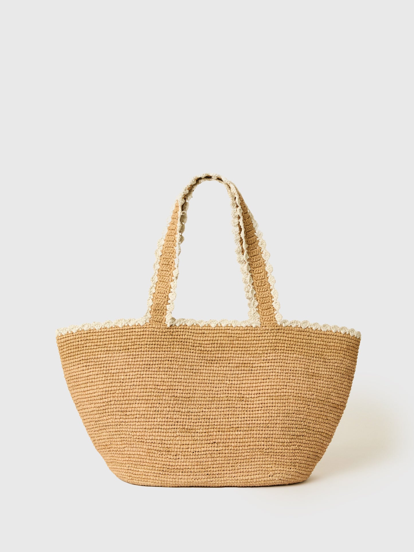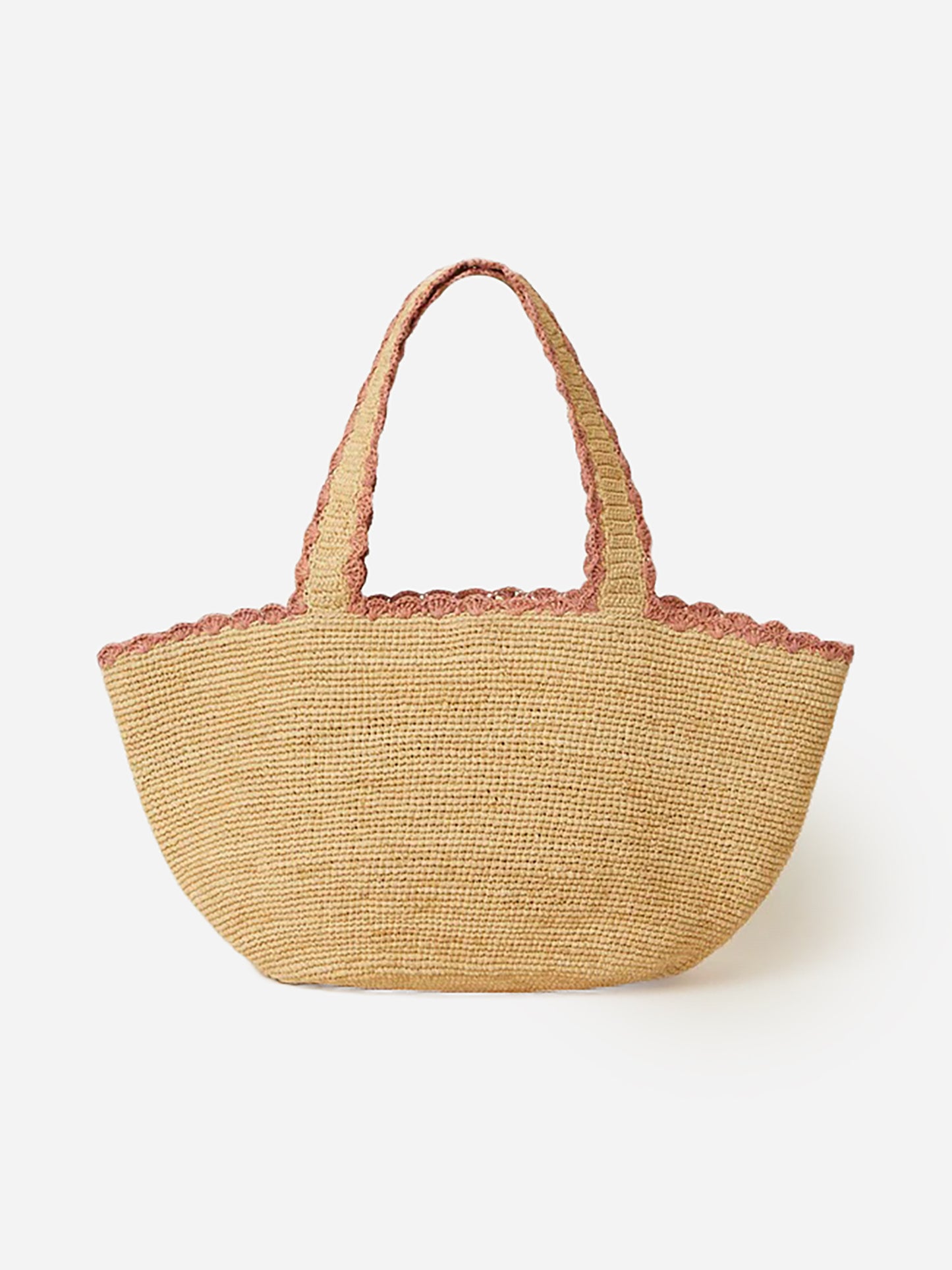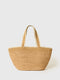 A simple tote bag made from woven straw featuring delicate stitched contrast trims.