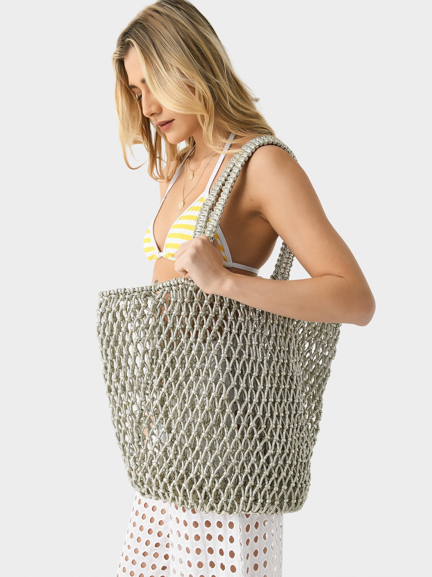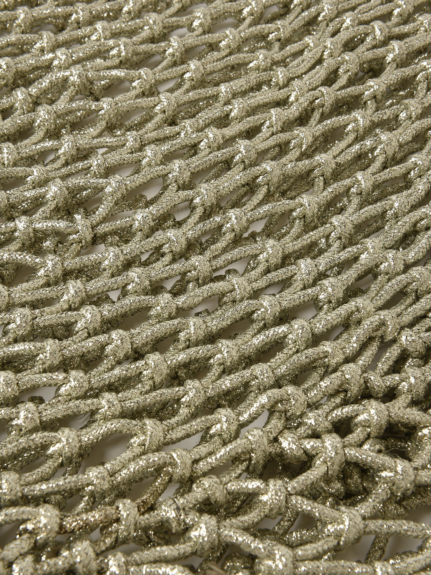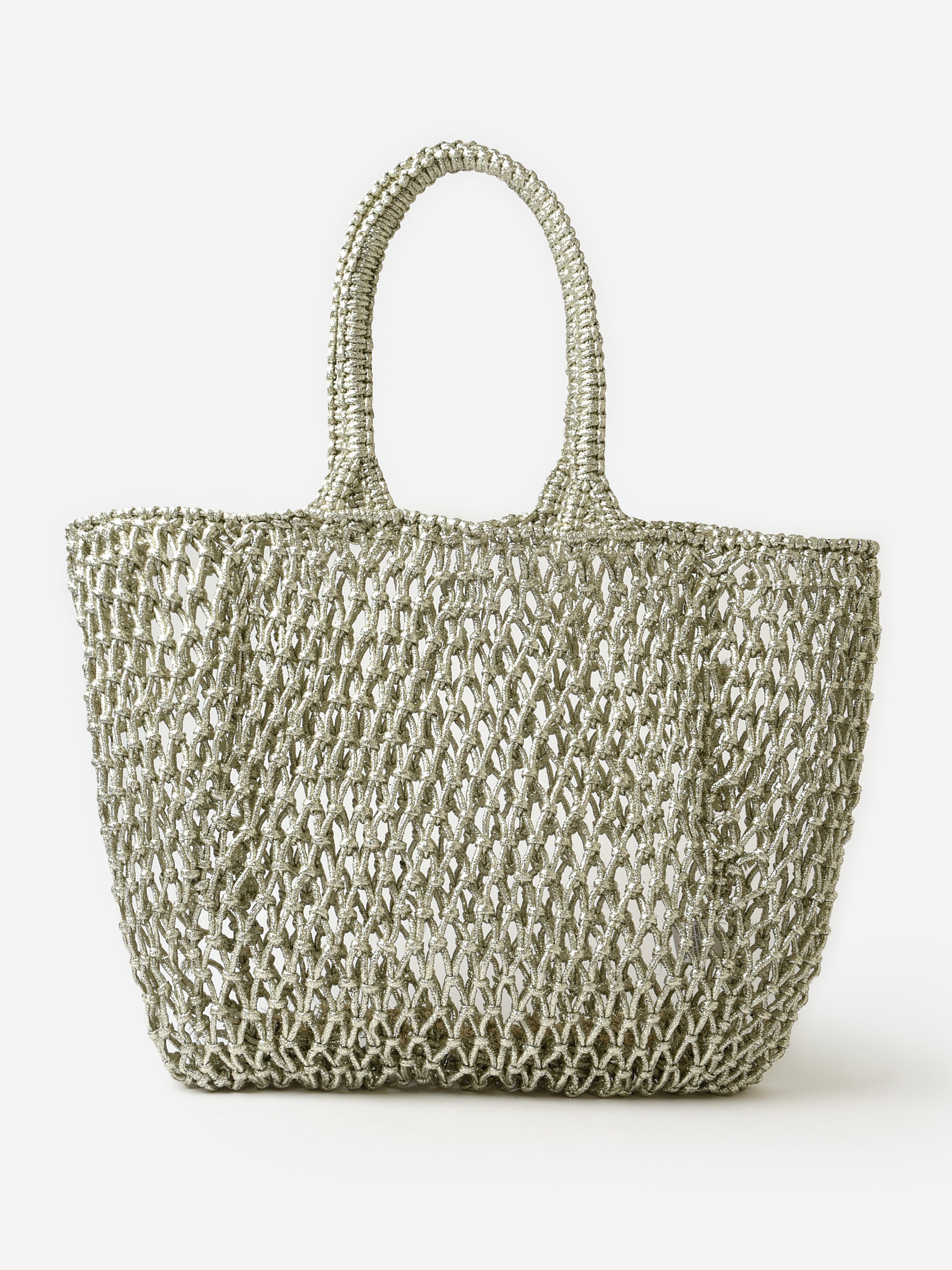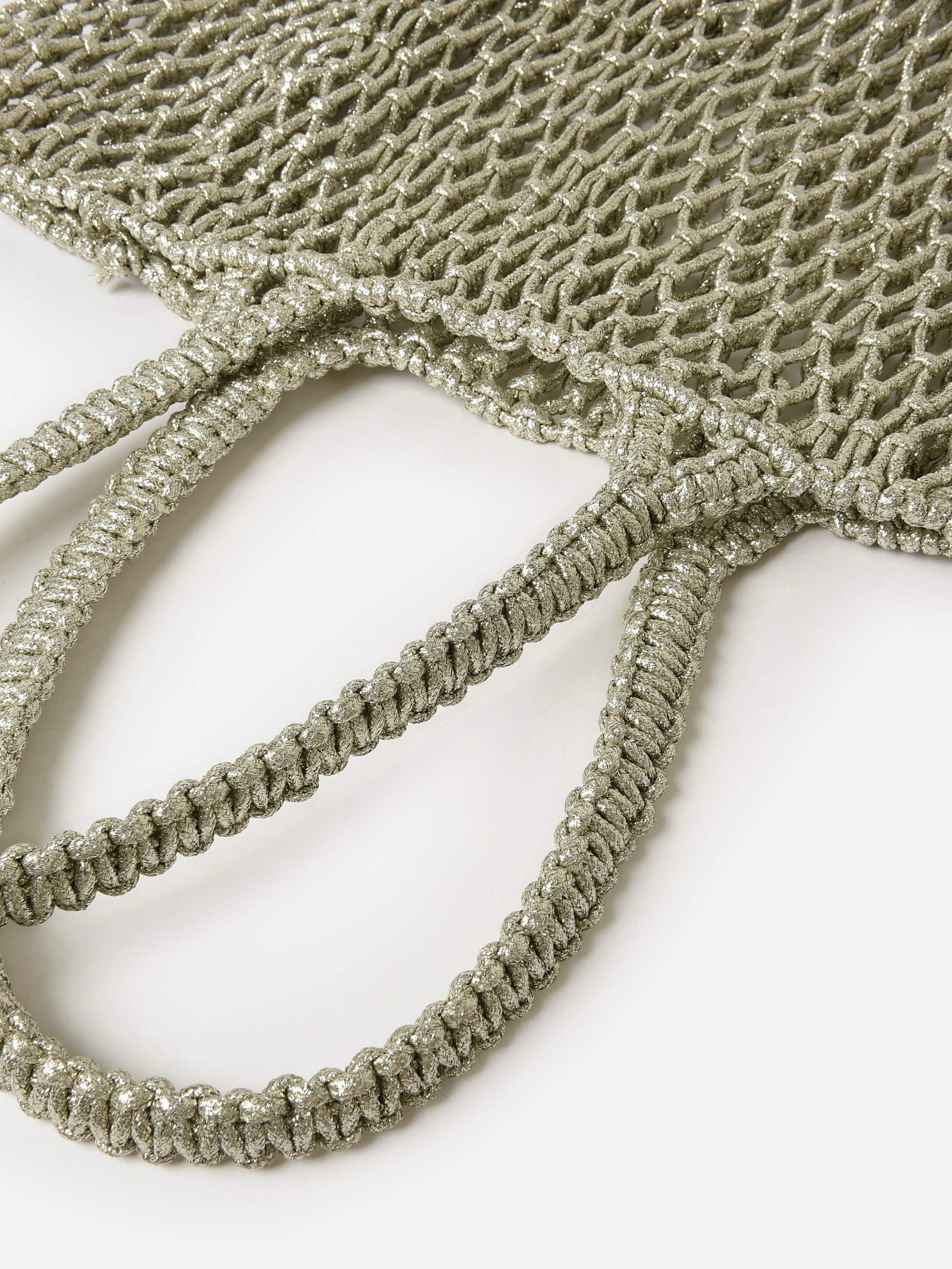 A stylish open-weave tote bag constructed from sparkling metallic thread.