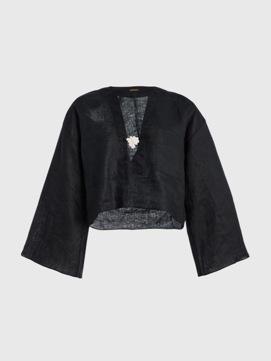 V-Neckline Decorative Detail Bell Sleeves Cropped Silhouette 100% Linen Classic Fit