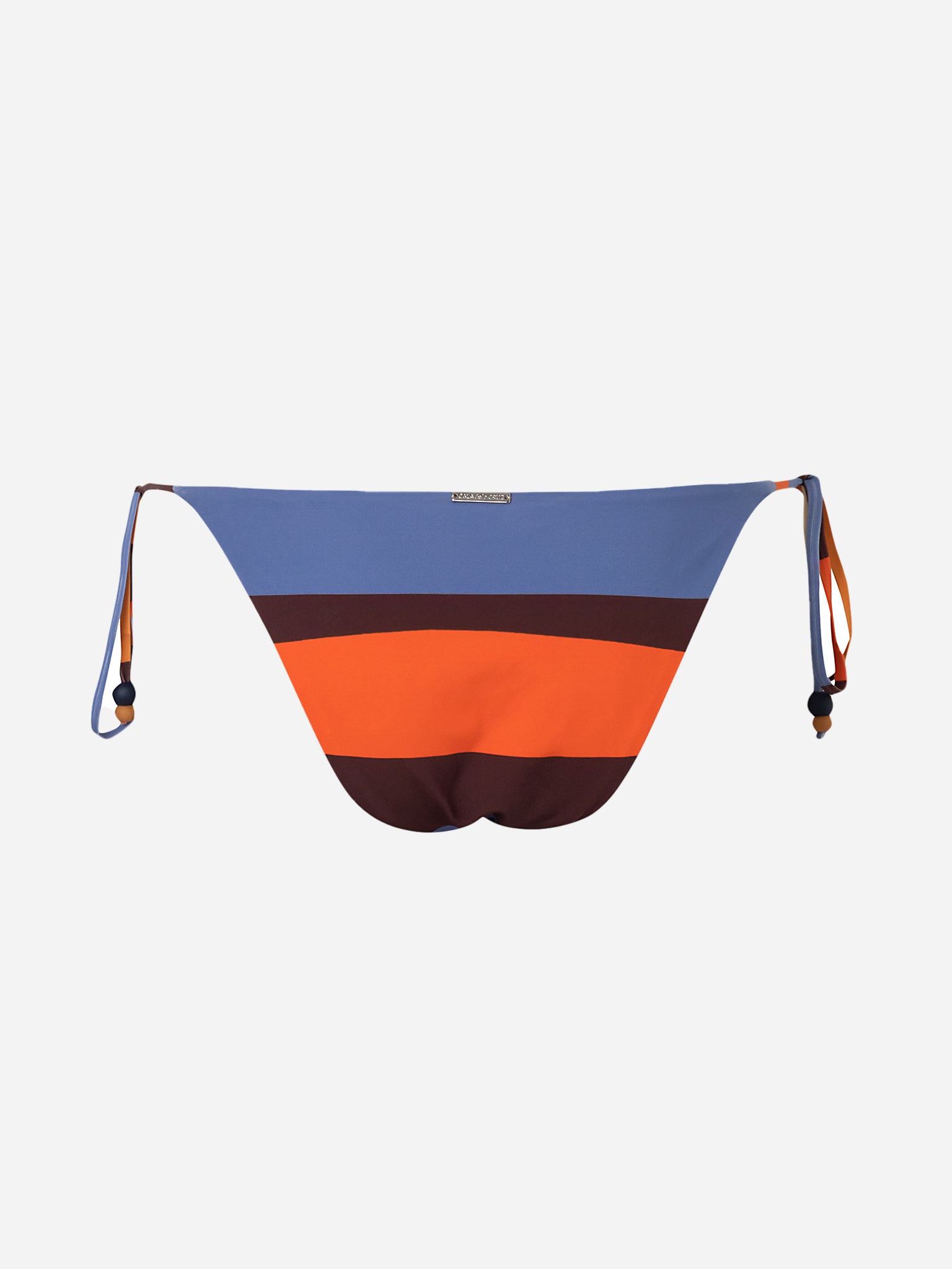 A multi-colored stripe bikini bottom with moderate coverage and adjustable side ties.